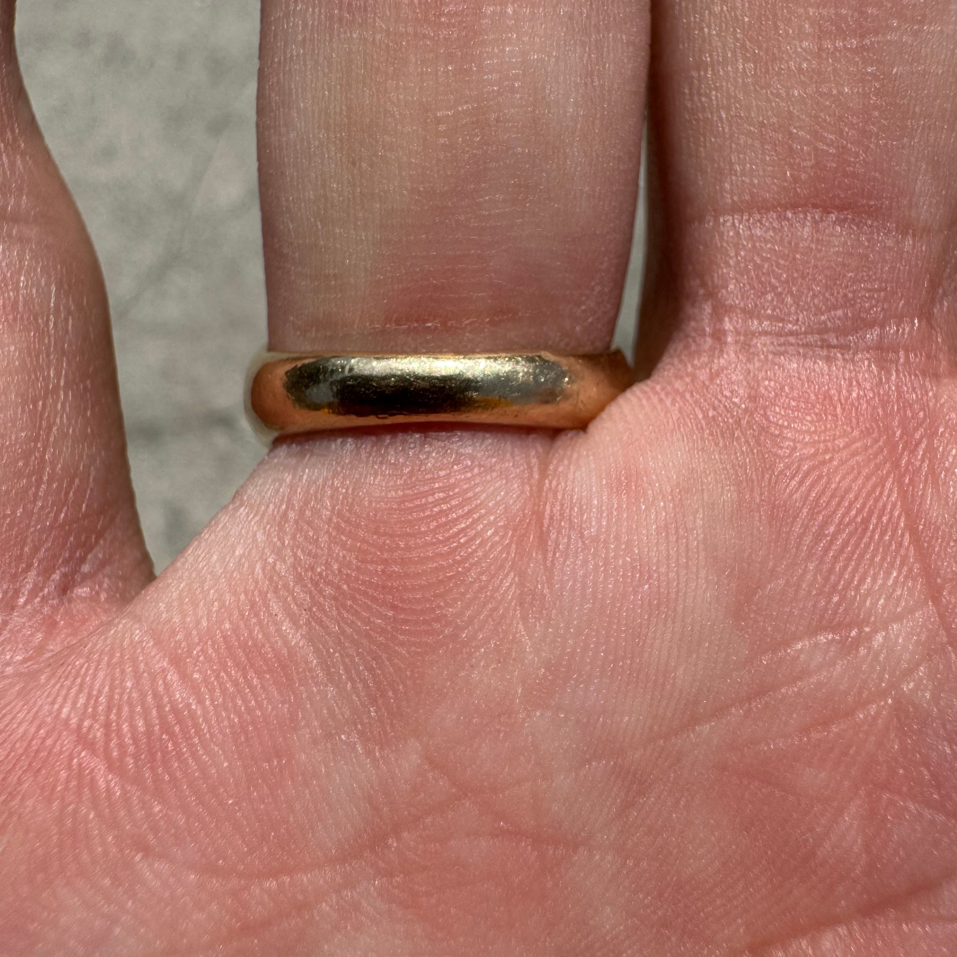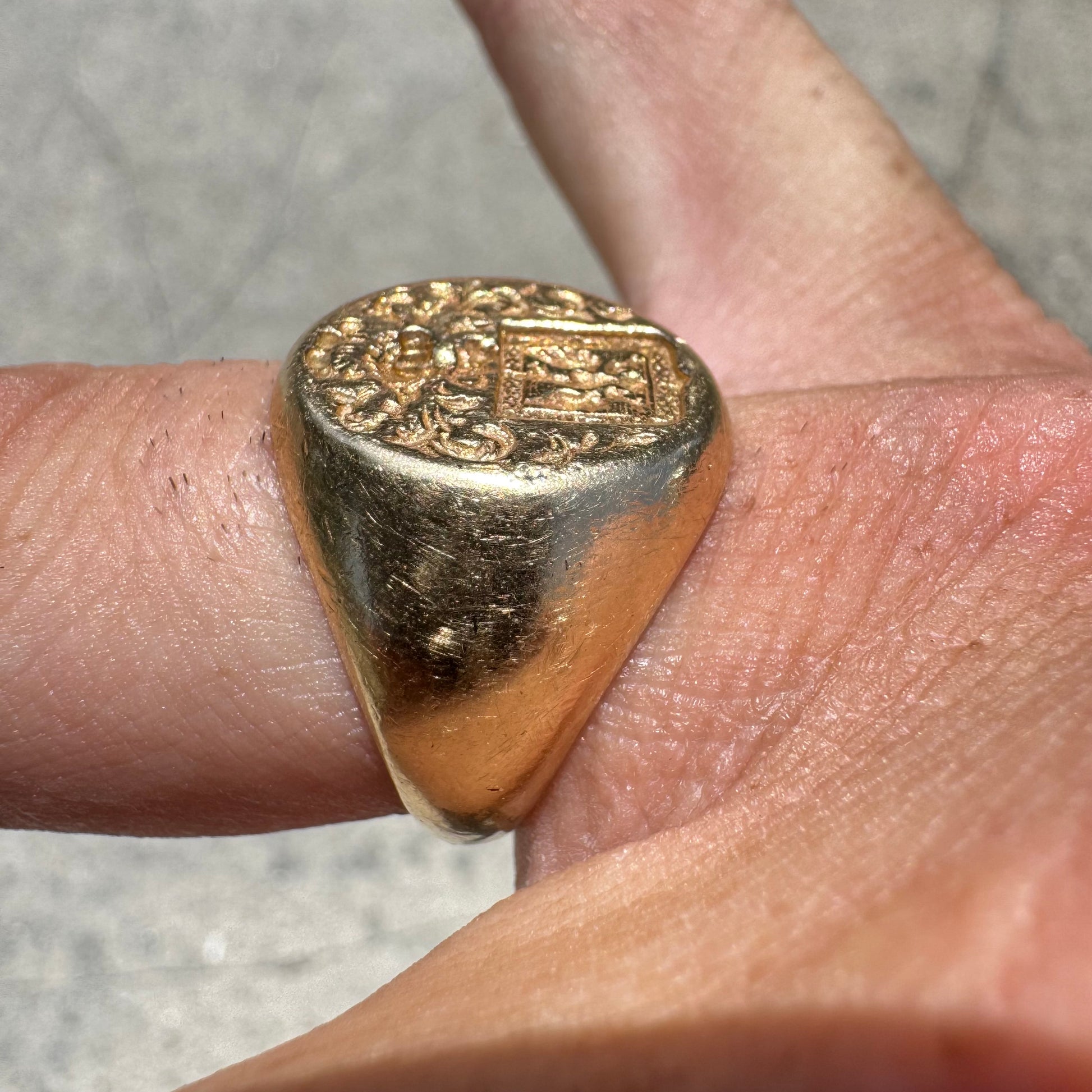 Battle ready, this is a ring you can wear 24/7 no matter what you’re doing and never take it off because of how comfortable yet heavy duty this piece is. Crafted by hand out of a solid 13.7g heavyweight 14k yellow gold this chunky donut style band intaglio style antique crest signet ring has a fierce warrior style depiction fitting of a size:7.5 with a broad width of 18MM. With a knight in armor above an eagle surrounded by crosses in a shield with a wreath encasing the whole image the representation of each image is that of military service and ranking nobility. If this ring could talk I’m sure it has some far out stories to tell. Not all old crest signets are created equal, if you’re like me and looking for one that has a more strong and masculine meaning of symbology that’s ready to go to war than this one is built for you.