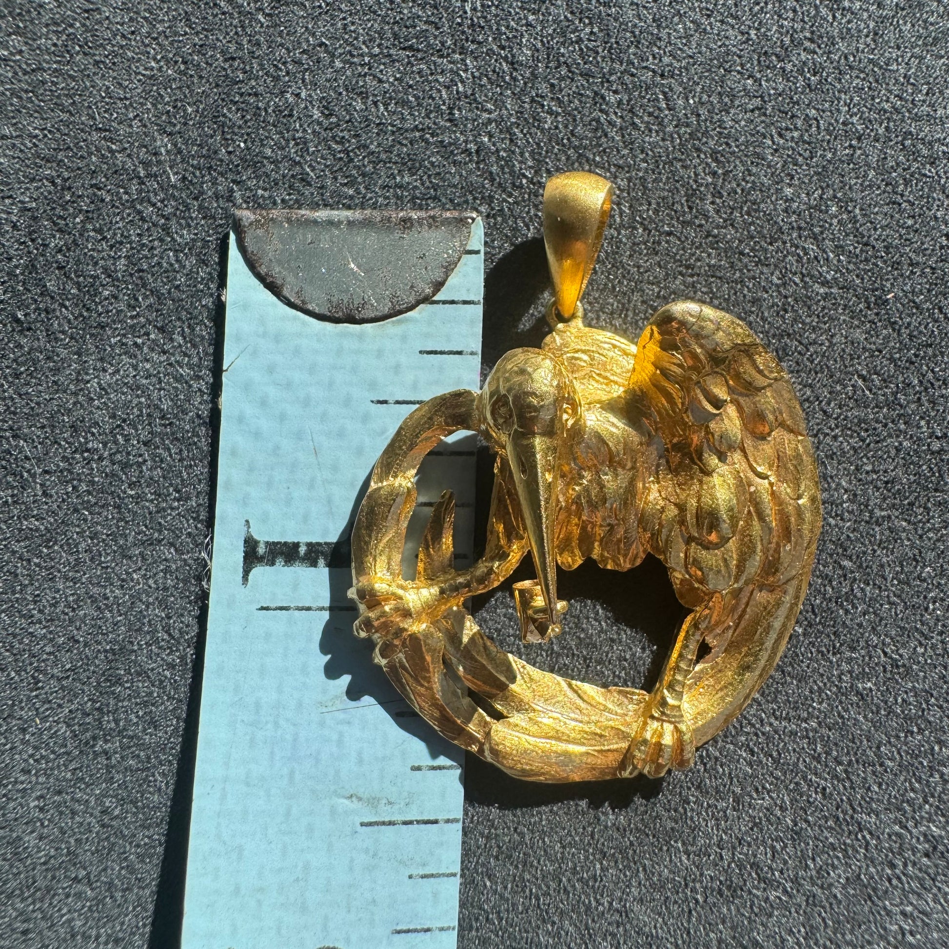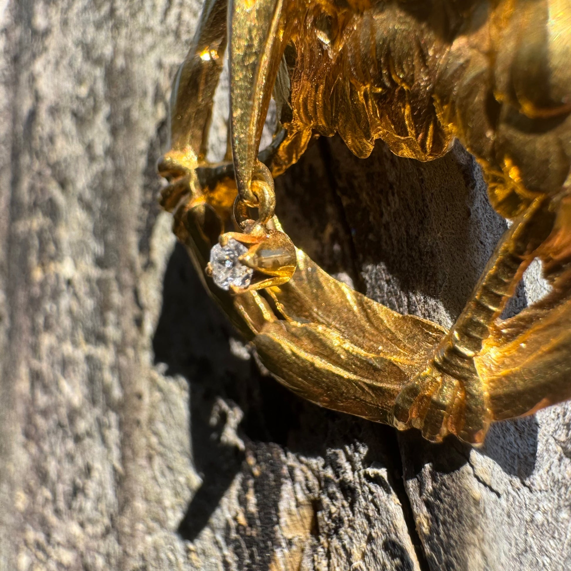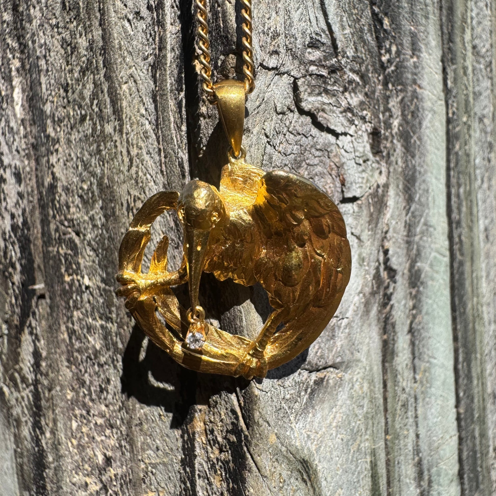 Stunning hand craftsmanship from the old world this bold and mystical crow bird pendant is fully crafted out of all solid 19.1k (XRF tested shown in picture #13) bright yellow gold. Known for their very high intelligence levels between the mortal and spiritual worlds the crow is a complex mix of omens, wisdom, protection, and transformation. Throughout the ancient to modern world the crows symbolism are important to all religions and people. Prong set with a natural VS clarity old mine cut diamond clenched in the beak these birds are known to be intrigued by shiny objects and to take and leave “gifts” around their nests. Weigh by in at a heavyweight of 12.7g and measuring approximately 1.5” x 1.25” this is a true talisman of the past with museum quality that is highly sought after by antique jewelry collectors.