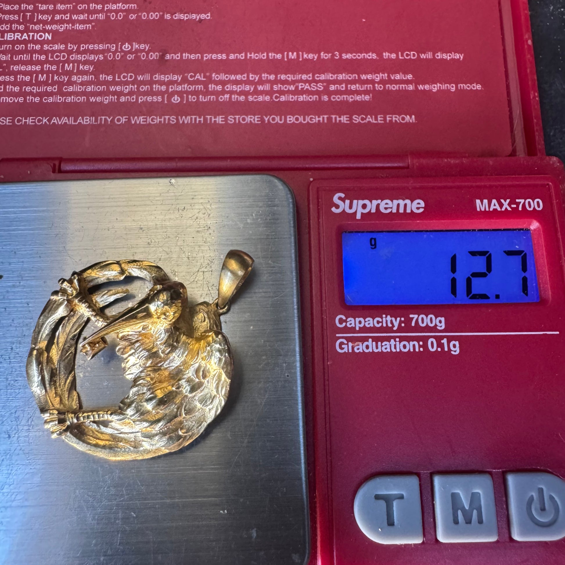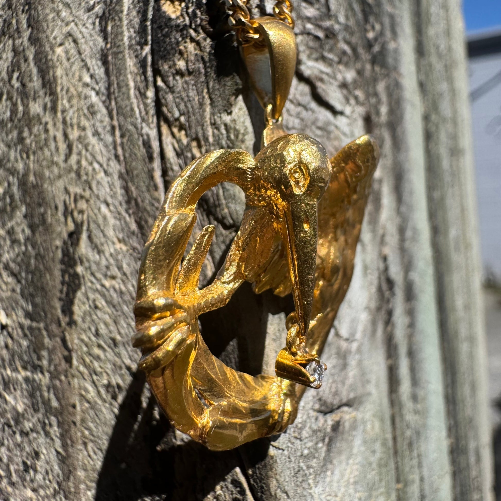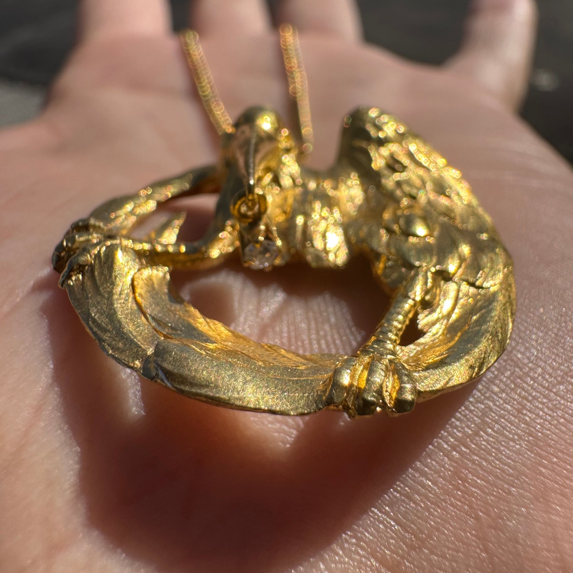 Stunning hand craftsmanship from the old world this bold and mystical crow bird pendant is fully crafted out of all solid 19.1k (XRF tested shown in picture #13) bright yellow gold. Known for their very high intelligence levels between the mortal and spiritual worlds the crow is a complex mix of omens, wisdom, protection, and transformation. Throughout the ancient to modern world the crows symbolism are important to all religions and people. Prong set with a natural VS clarity old mine cut diamond clenched in the beak these birds are known to be intrigued by shiny objects and to take and leave “gifts” around their nests. Weigh by in at a heavyweight of 12.7g and measuring approximately 1.5” x 1.25” this is a true talisman of the past with museum quality that is highly sought after by antique jewelry collectors.
