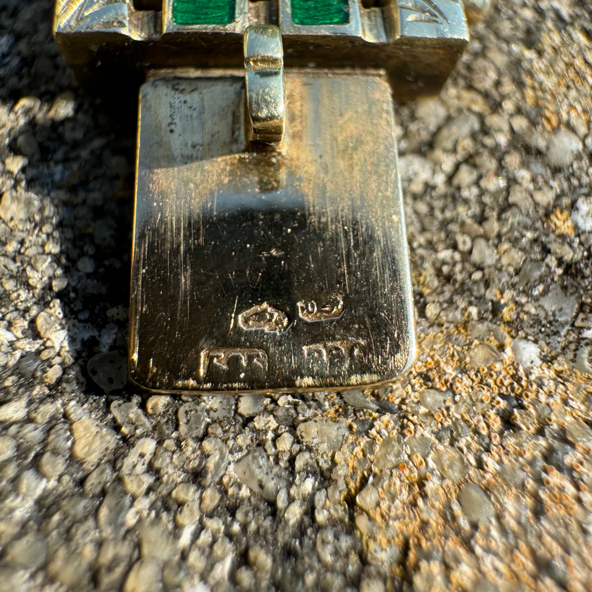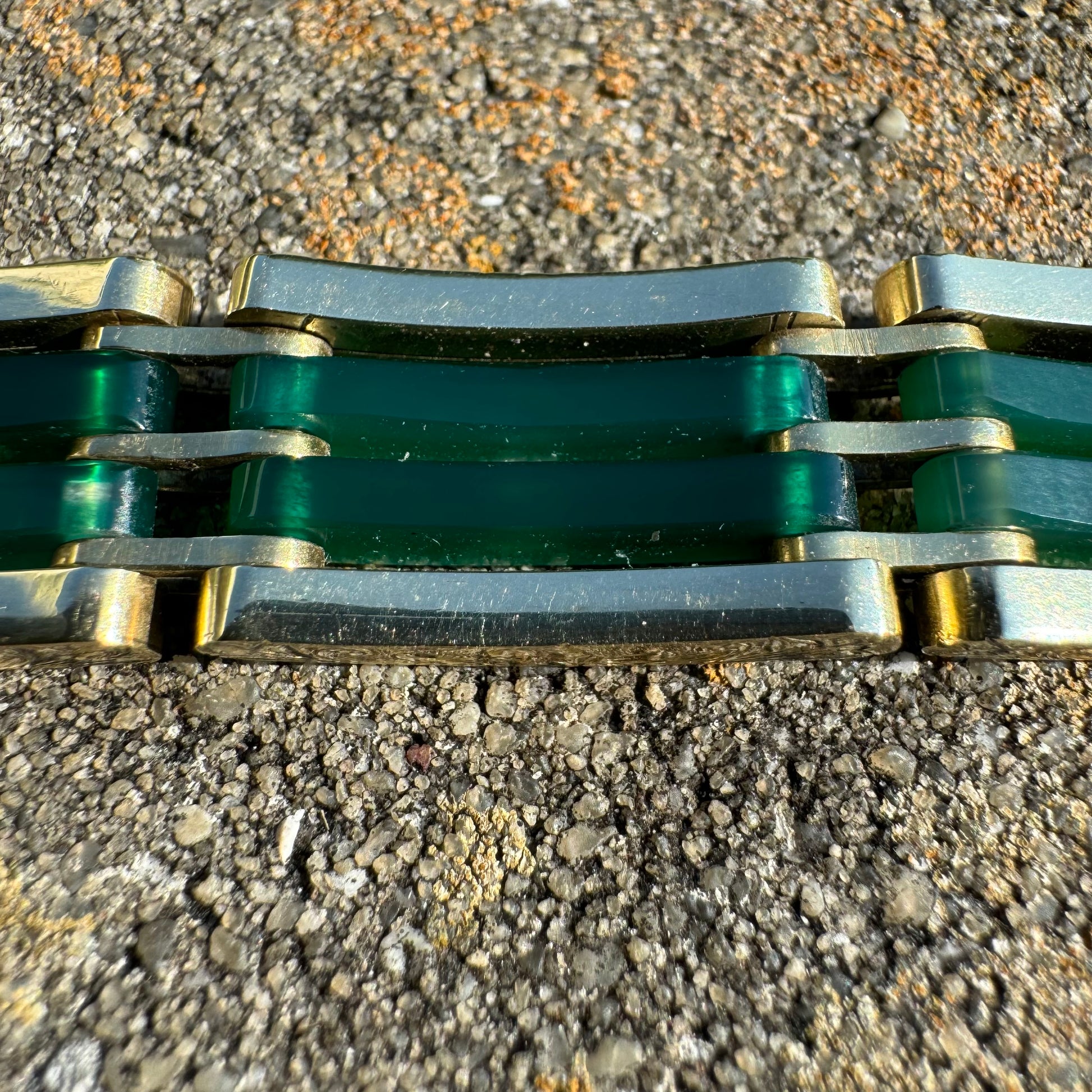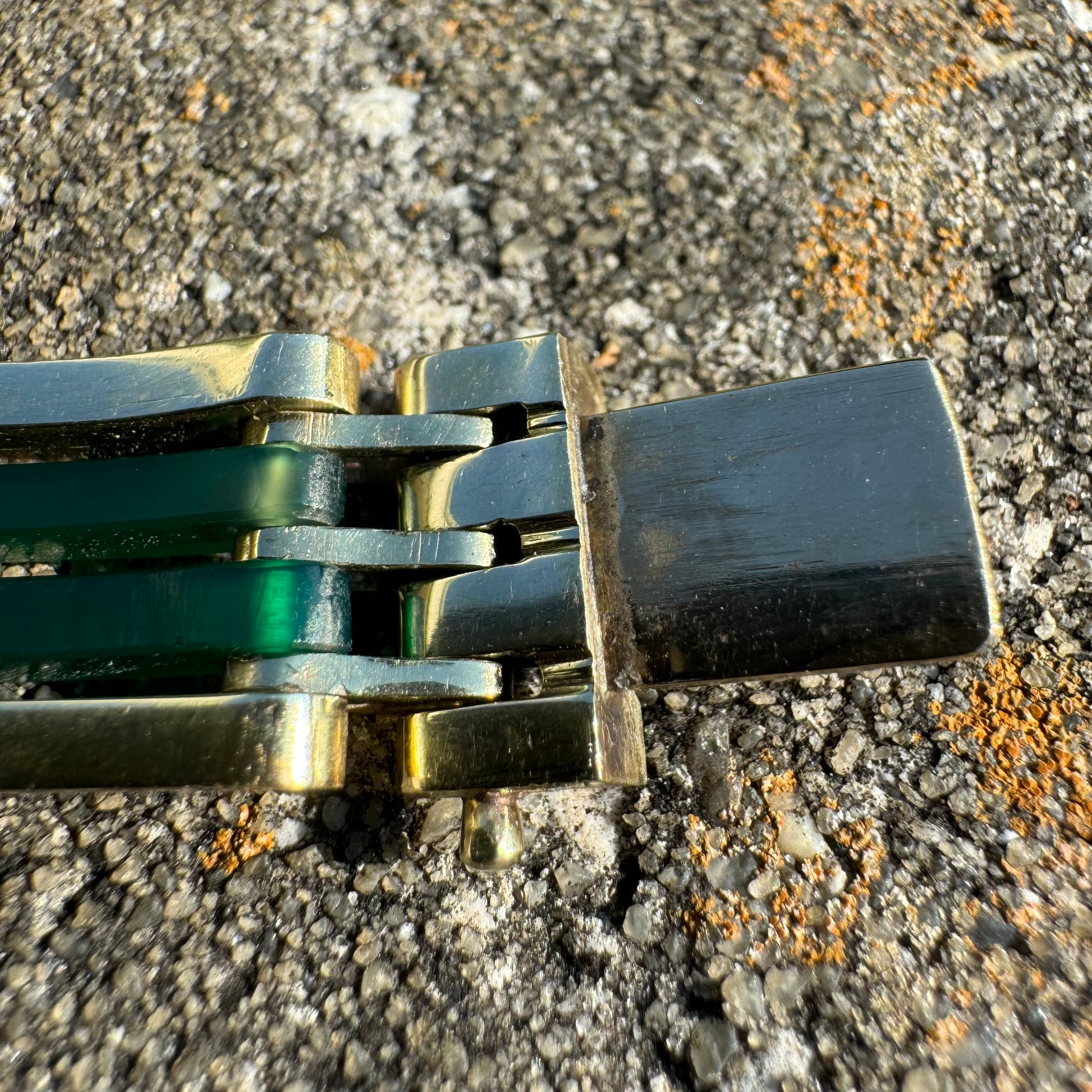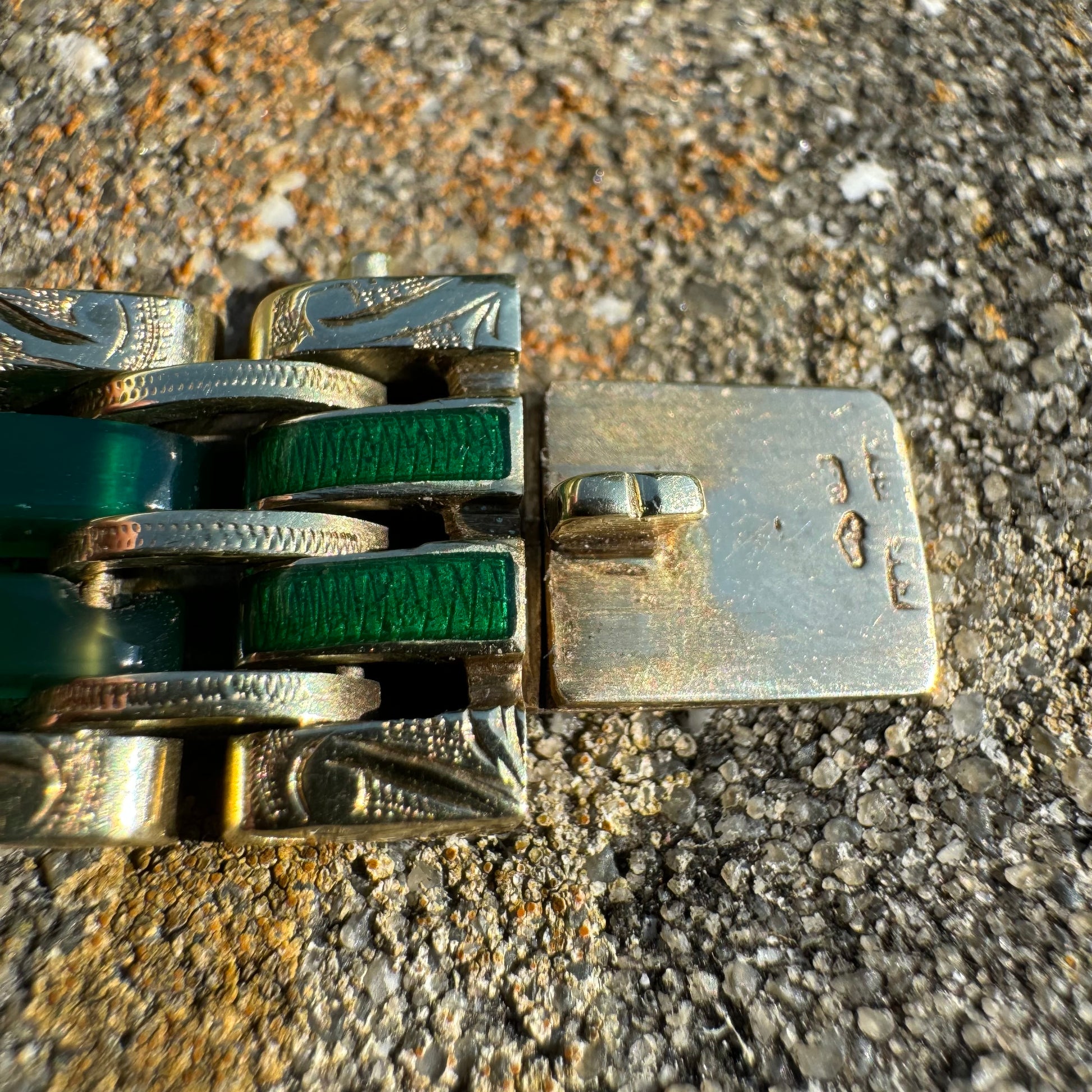 You won’t see this piece ever again. Circa 1930’s Austro-Hungarian hallmarked 14k yellow gold all hand made and hand chased floral patterned chrysoprase bracelet. A beautiful translucent green almost the color of Seafoam, when tested it shows in the emerald family (picture #17), you don’t see this stone anywhere nowadays it’s a rare and beautiful stone from a bygone era. Though you can’t tell and I hadn’t noticed it for days there’s a small chip in one of the stones right next to the clasp (picture #19) but it truly is nothing to even bother thinking about or worth mentioning. An old enameling technique of glass enameled green inlaid fills the middle of the clasp giving off an extra special touch to an already overly unique bracelet. Though it measures 7.5” end to end it fits more of a 7” due to its thick circumference of 13mm x 4mm while it’s heavyweight and durable at 39.4g. Selling this piece at an incredible deal despite never being able to find or see one again take advantage before someone else does.