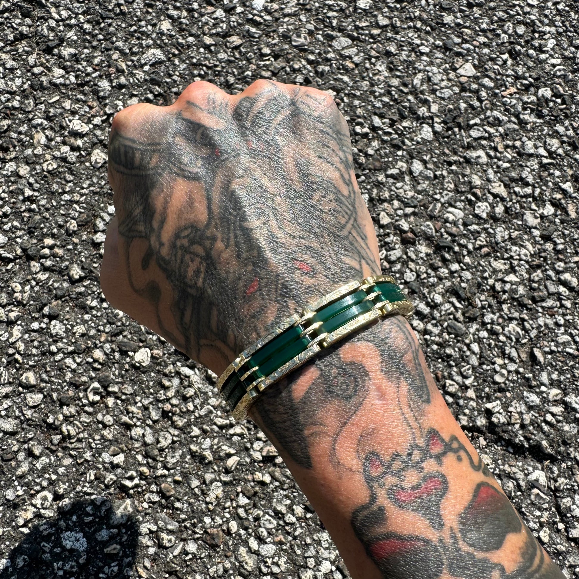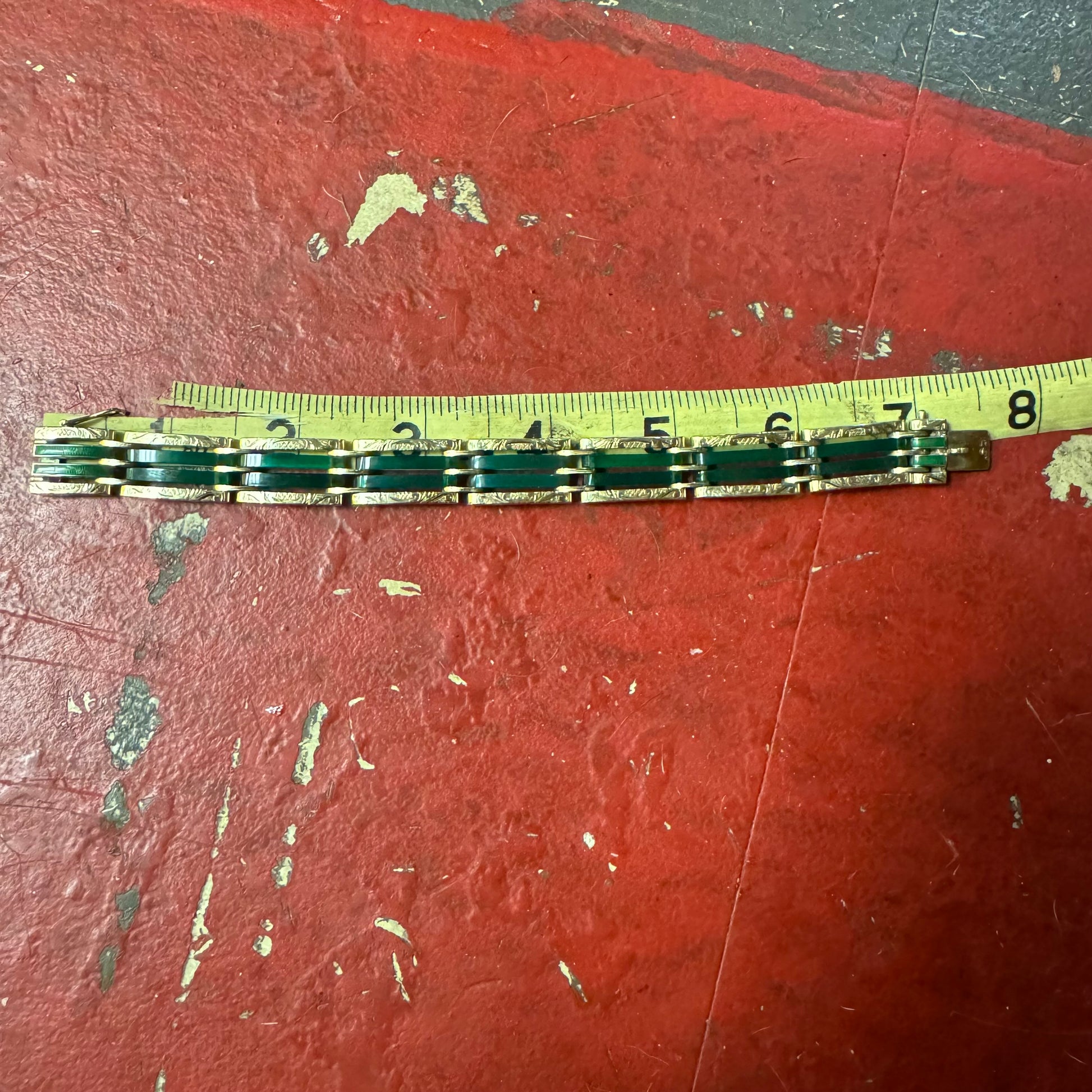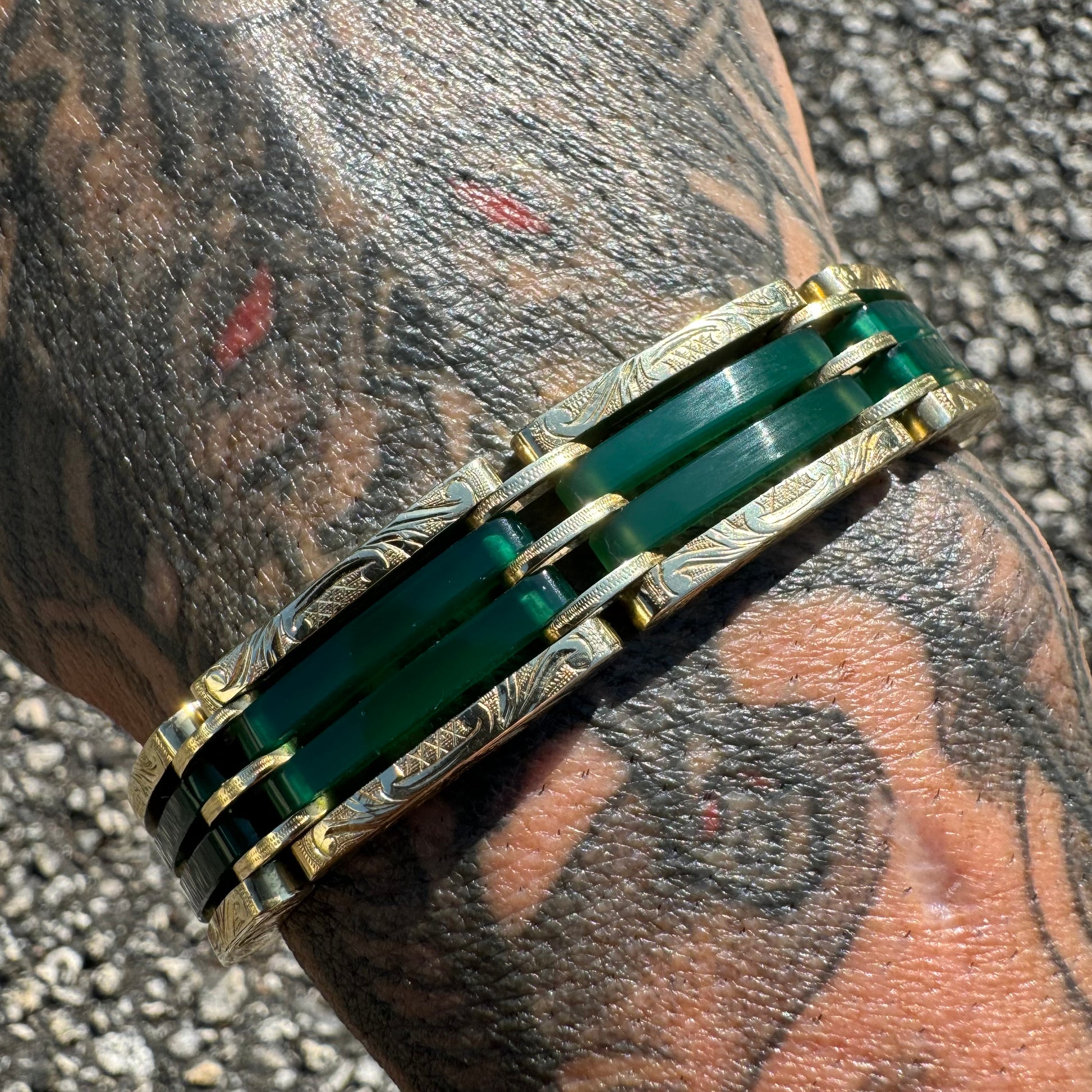 Art Deco Austro-Hungarian 14k Yellow Gold Chrysoprase Glass Enameled Floral Engraved Bracelet (7”)