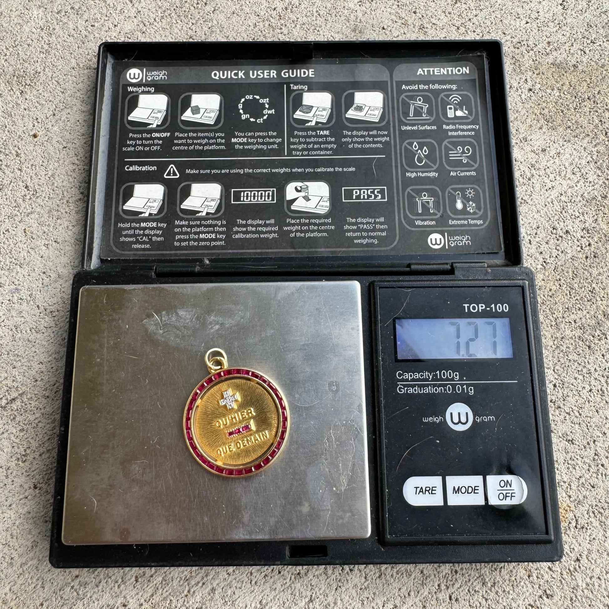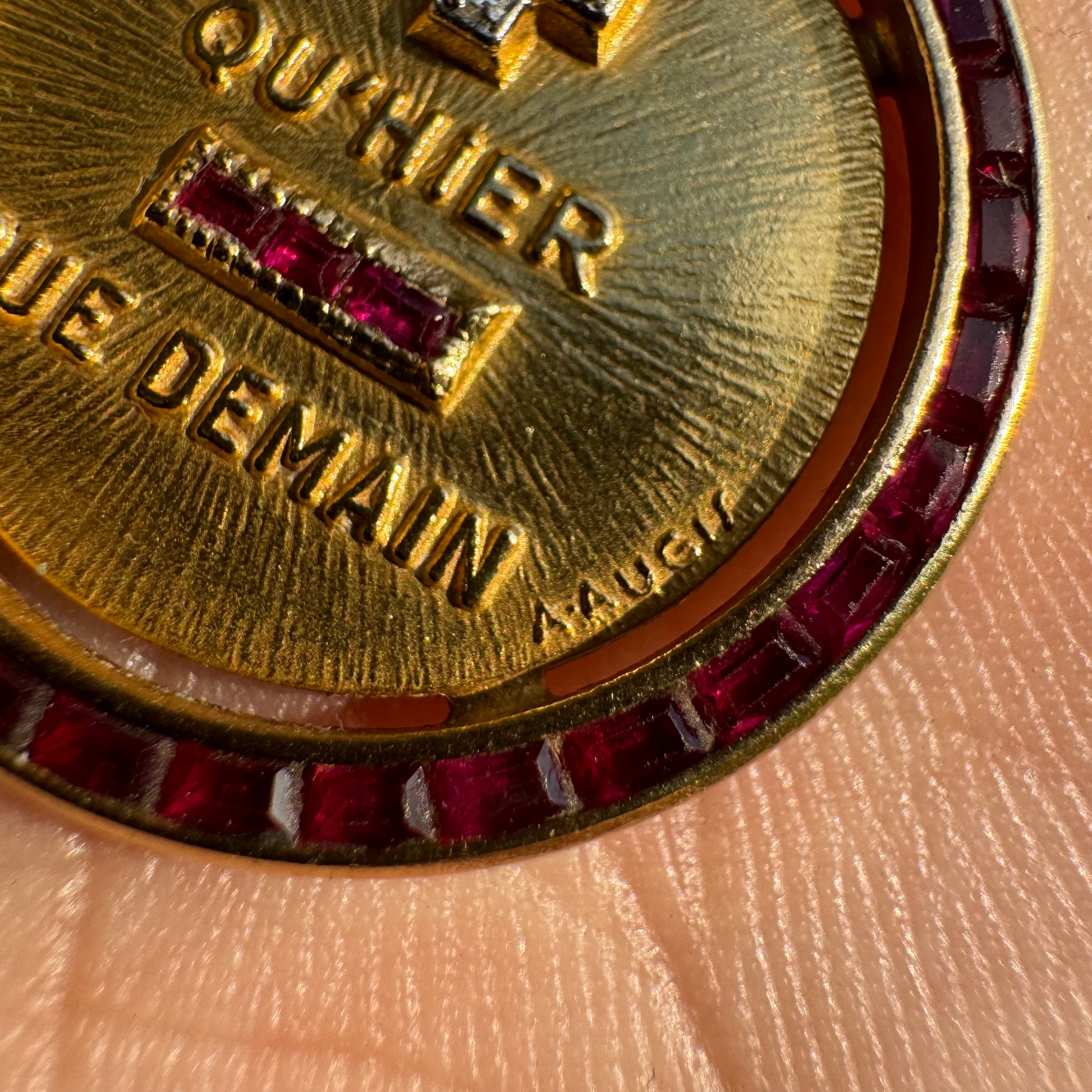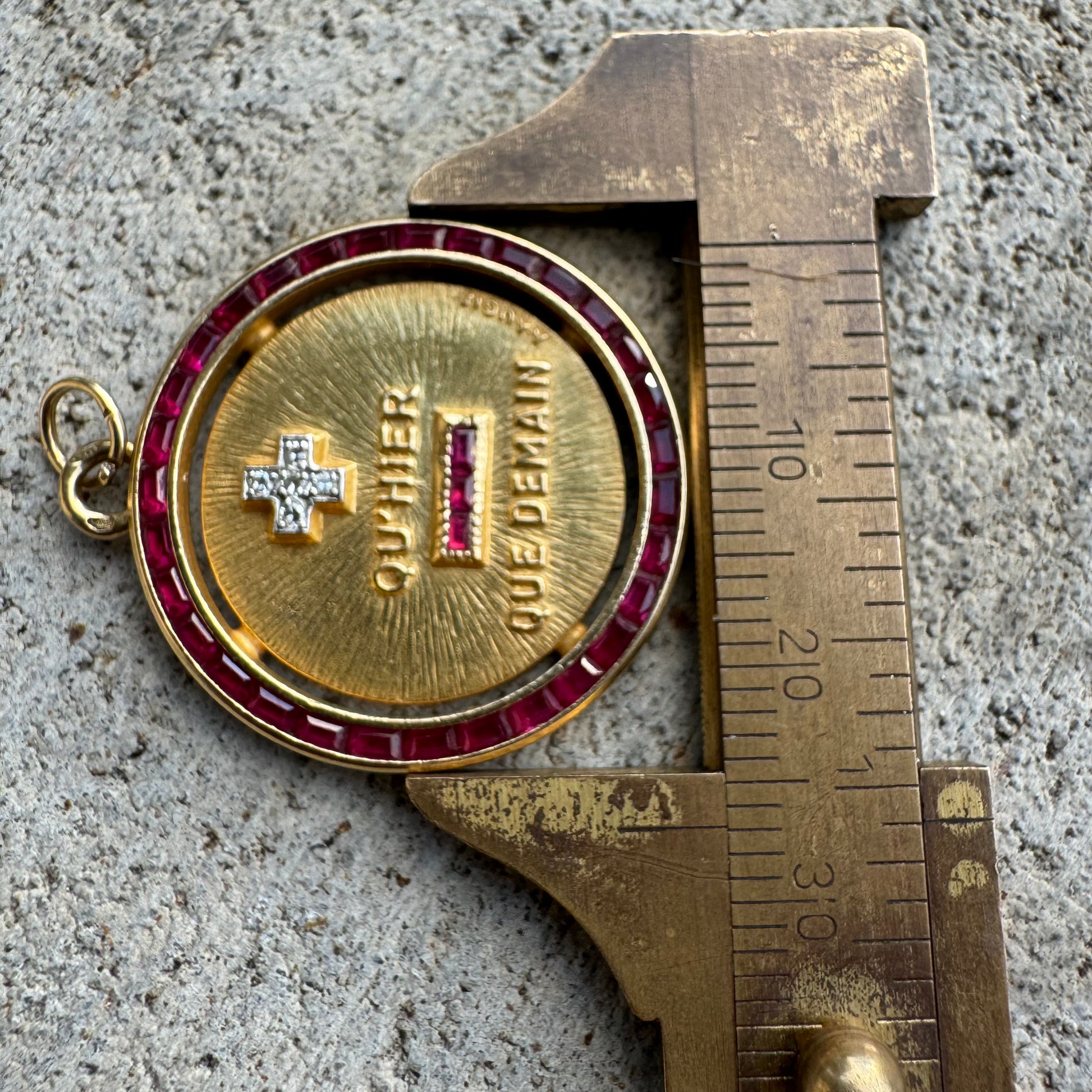 One of the most coveted pieces of jewelry in the scene today is this extremely rare and beautiful solid 18k yellow gold French hallmarked A. Augis signed love token medallion. In 1907, the Lyonnais jewelry’ Alphonse Augis created a love token based on the poem “Les Vieux” written by Rosemonde Gérard to her husband Edmond Rostand in 1889. Pulled from the poem is the phrase “More than yesterday, less than tomorrow.” With the natural Diamond set plus sign representing the word “More” and the Ruby encrusted minus sign representing the word “Less” as the French translation of Qu’hier (than yesterday) Que Demain (than tomorrow) are in raised lettering. There are quite a few variations made with this ruby set halo border and largest variation made measuring 27MM x 30.5mm and weighing in at 7.27g being the most collectible and expensive on the market. When and if you can find these they are selling for a substantially higher value than what this is priced at. A true collectors dream piece.