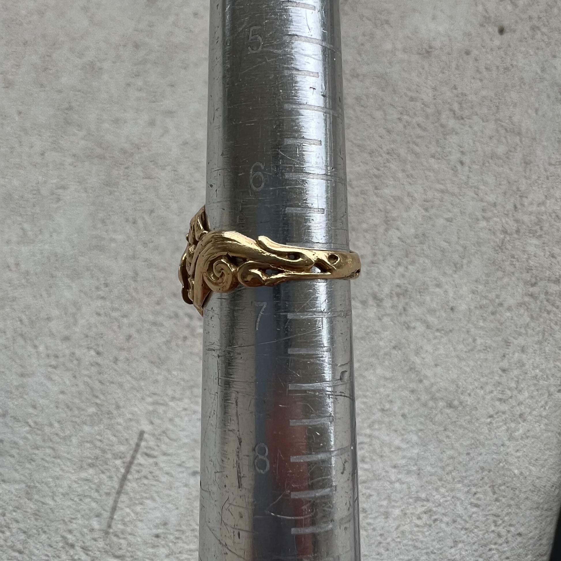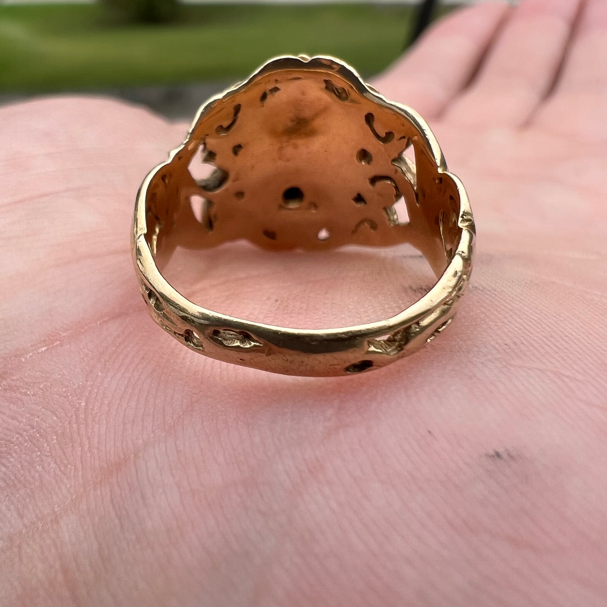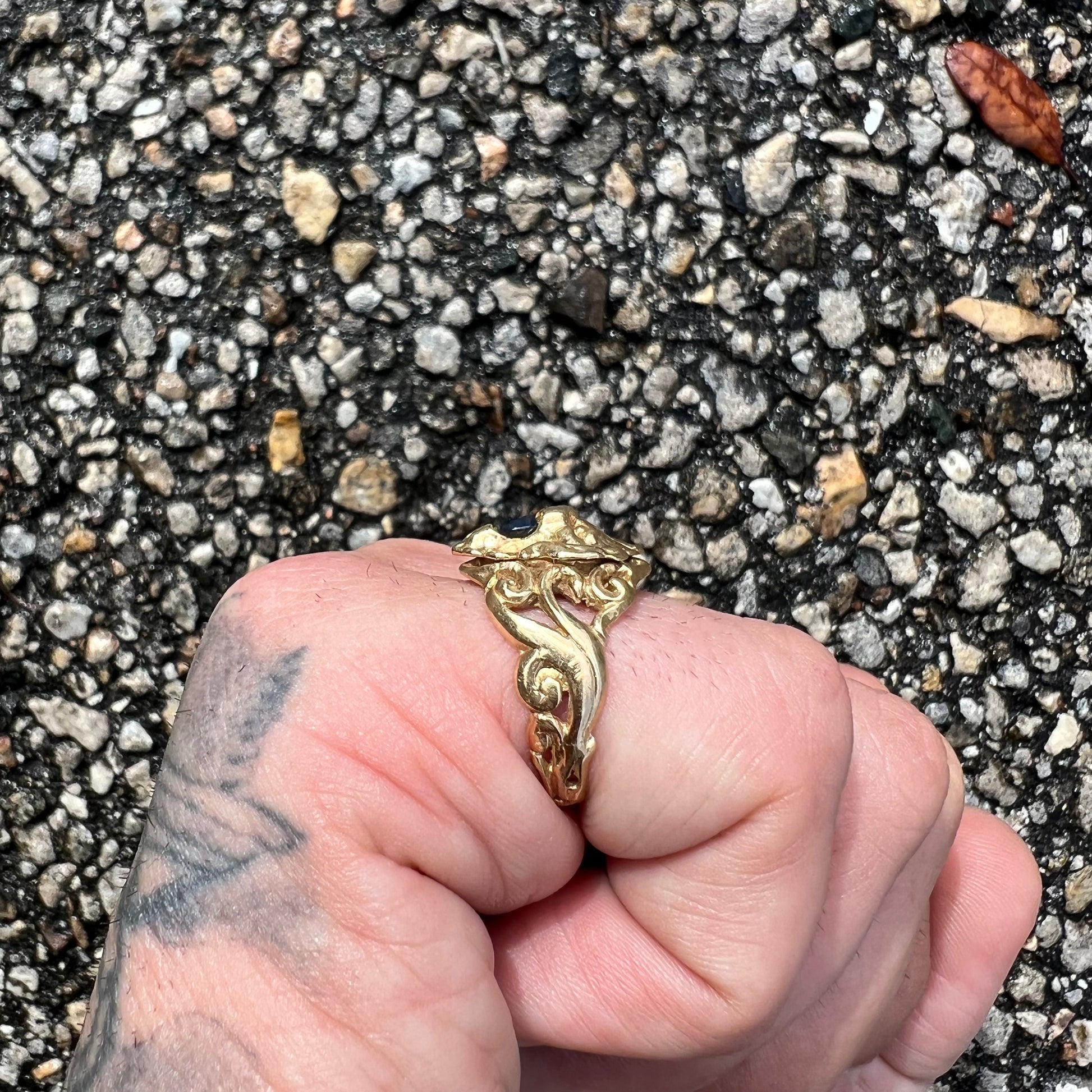 The ultimate skill in hand chasing, the shanks of this ring we’re all carved out by hand to look like beautiful old scrolls. Cast out of solid 14k yellow gold and solid backed is a fully detailed old school Lion clutching a blue sapphire in its jaws. Made sometime in the earlier 1900’s this ring screams old school stylEe. Whether you’re a seasoned vet knowing what you’re looking at or have no experience with jewelry at all there’s one thing you can tell and that’s the antique qualities this ring possesses. Quite a heavy little ring at 7.15g and sized at approximately 6.5.
