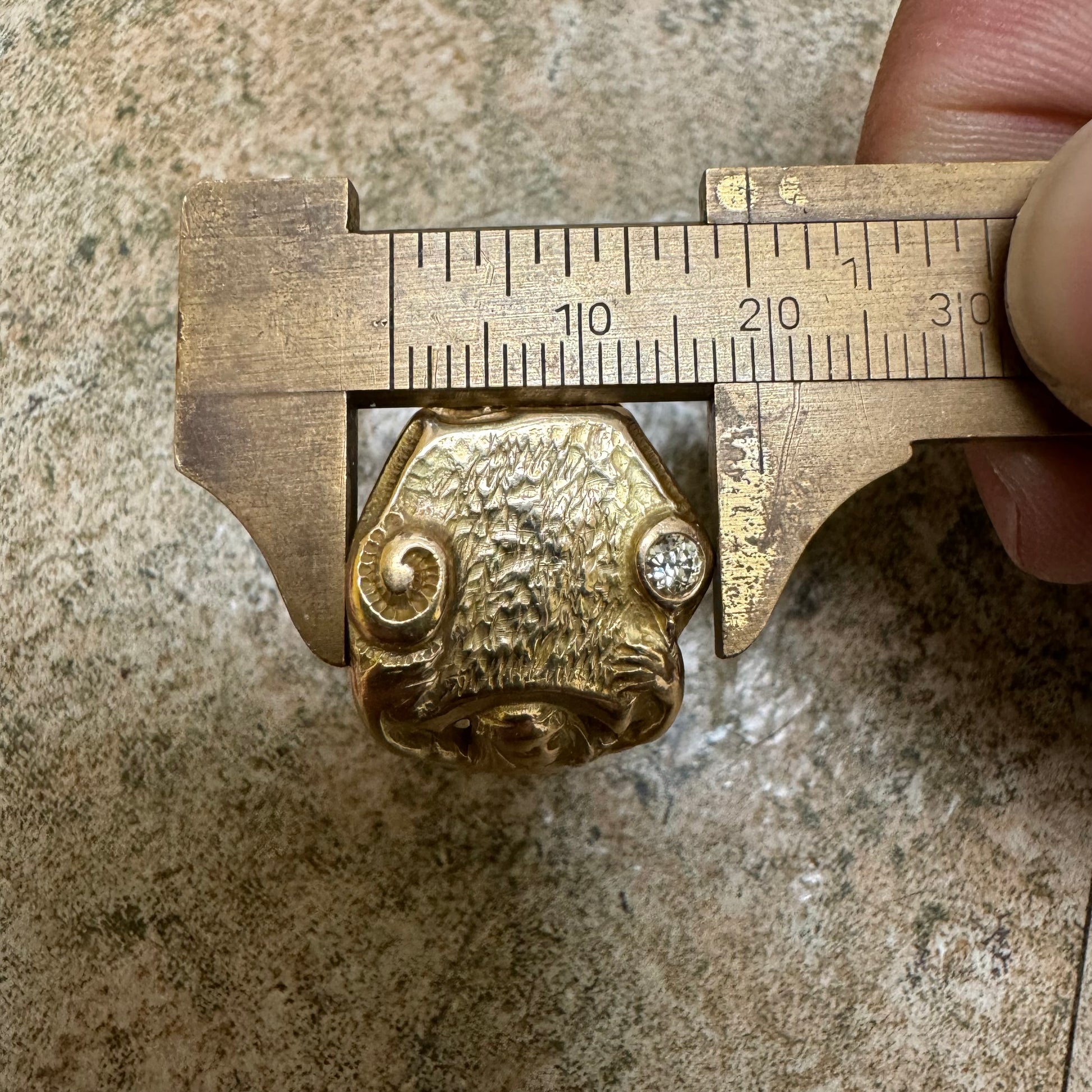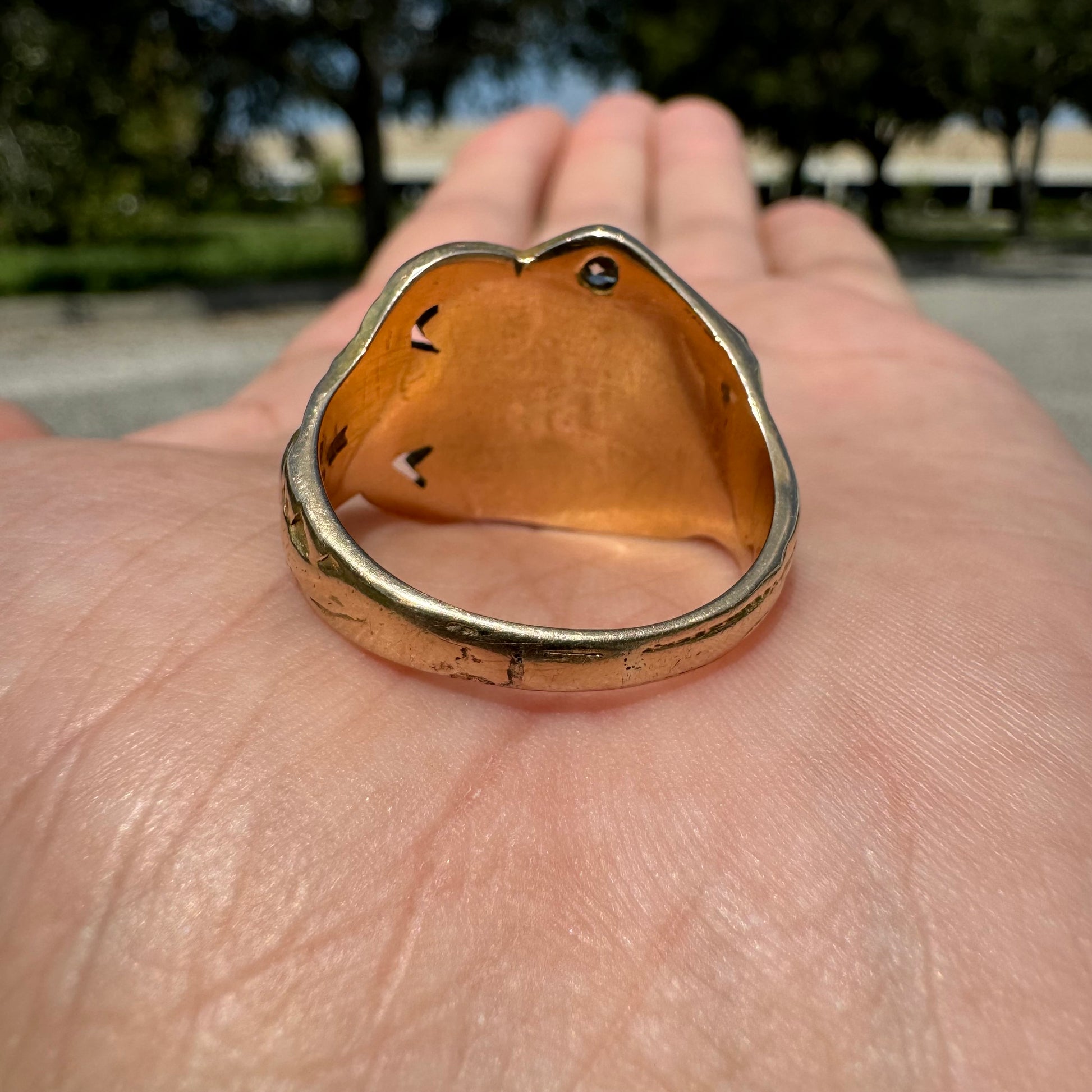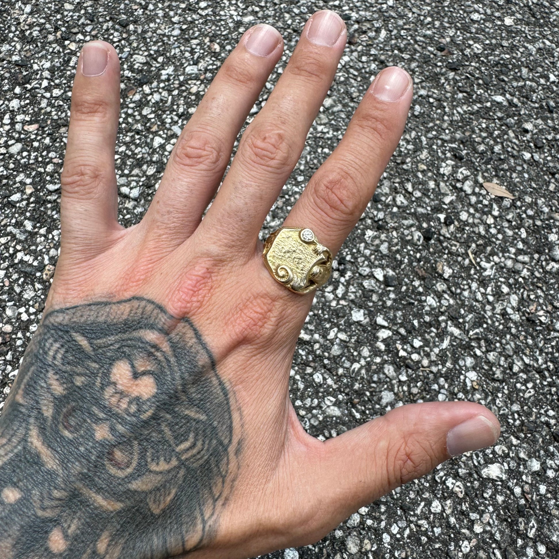 Handcrafted sometime around the 1910’s-1930’s out of a solid and vibrant 14k yellow gold is a very hard style of ring to find. These were popular style signet rings of the time and usually had personalized monogrammed initials on the front and the better ones, like this one you see here, had cool figures of mythical creatures and animals on the side of the shanks. This one, as you see, has a detailed naked mermaid holding up the top signet part of the ring which is in the shape of a scroll and is even more of a rare find as this one has still been left blank with no personalized lettering done to it. With a super clean natural old euro cut diamond at approximately .10ct that’s been bezel set on the top part of the scroll and a commanding presence on the finger that takes up approximately 19mm x 20mm. A size:11 this is a very full, thick, and heavy ring at 14.1g yet has a comfortable and low profile look as you can see in picture #7. My ultimate favorite styles of rings to find I personally own and wear 3 of them on a daily basis as part of my jewelry box collection.