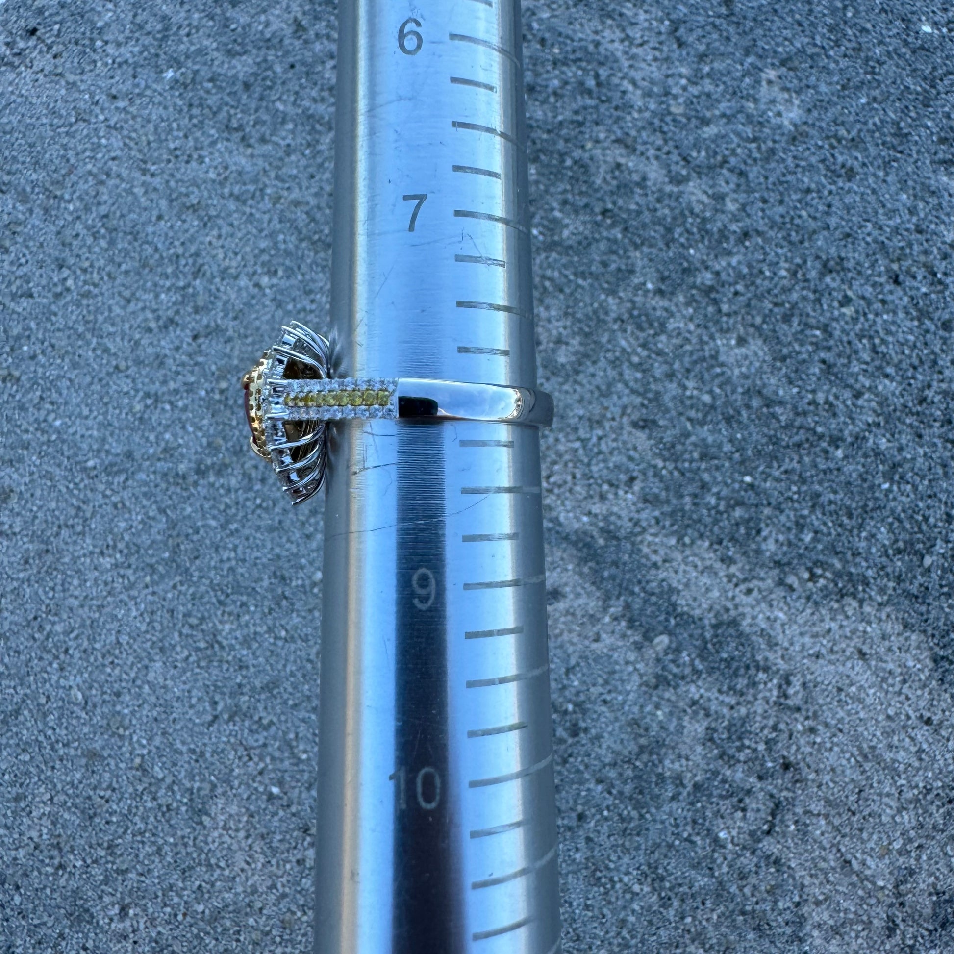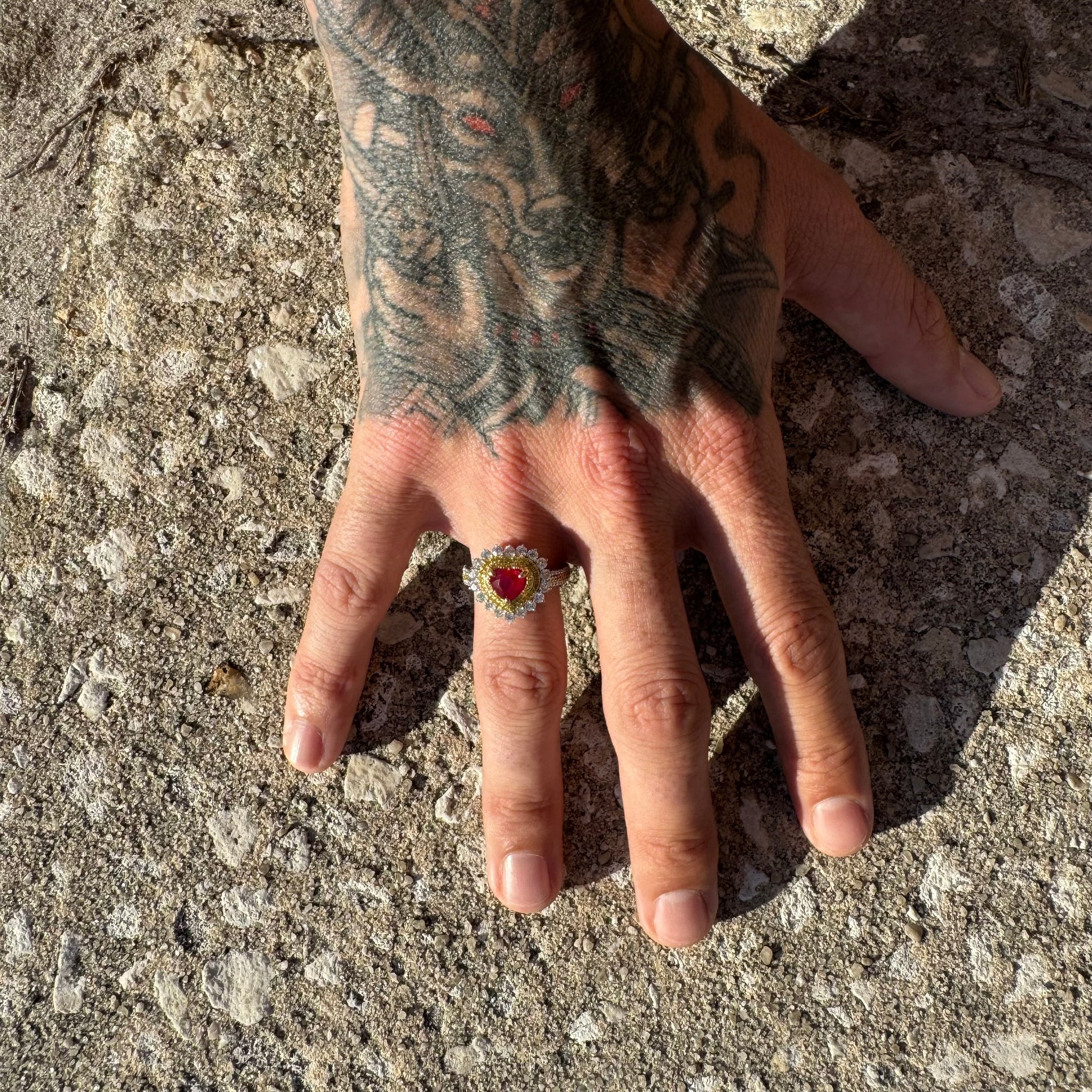 •2 rows of halos surrounding the heart center stone and center row of the band consisting of .32ctw all natural VS clarity round yellow diamonds