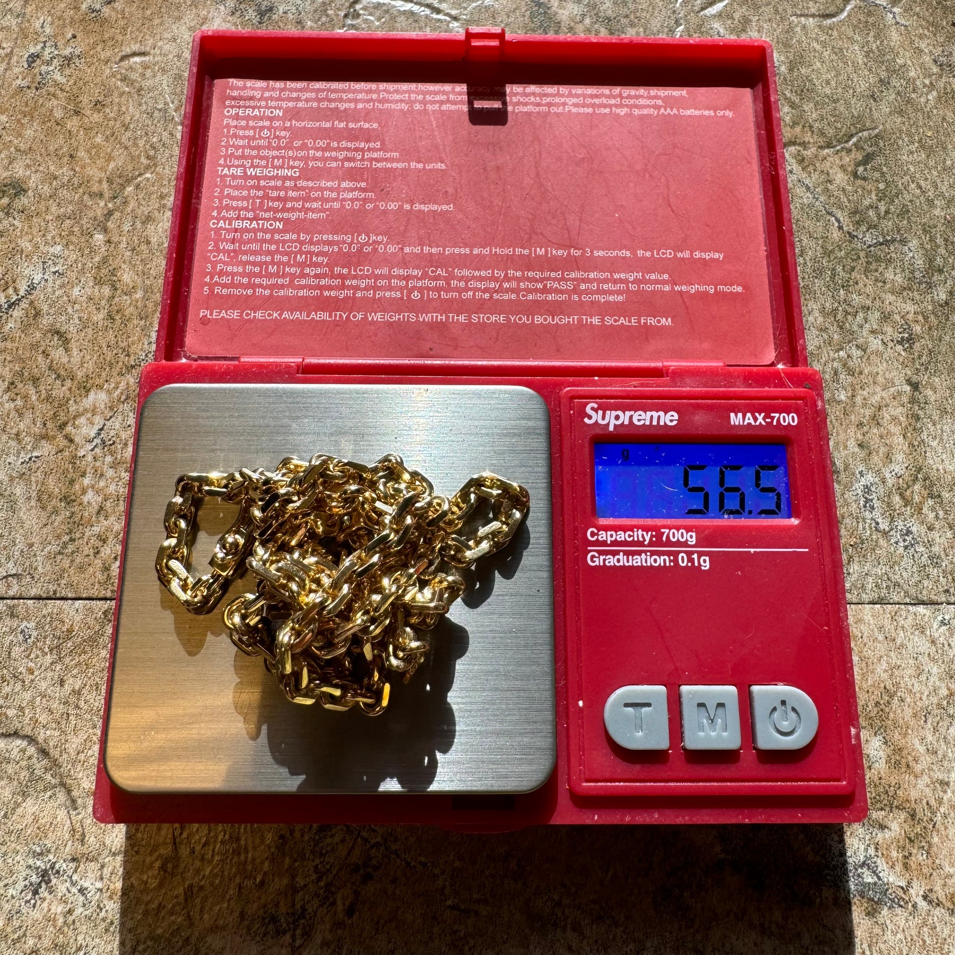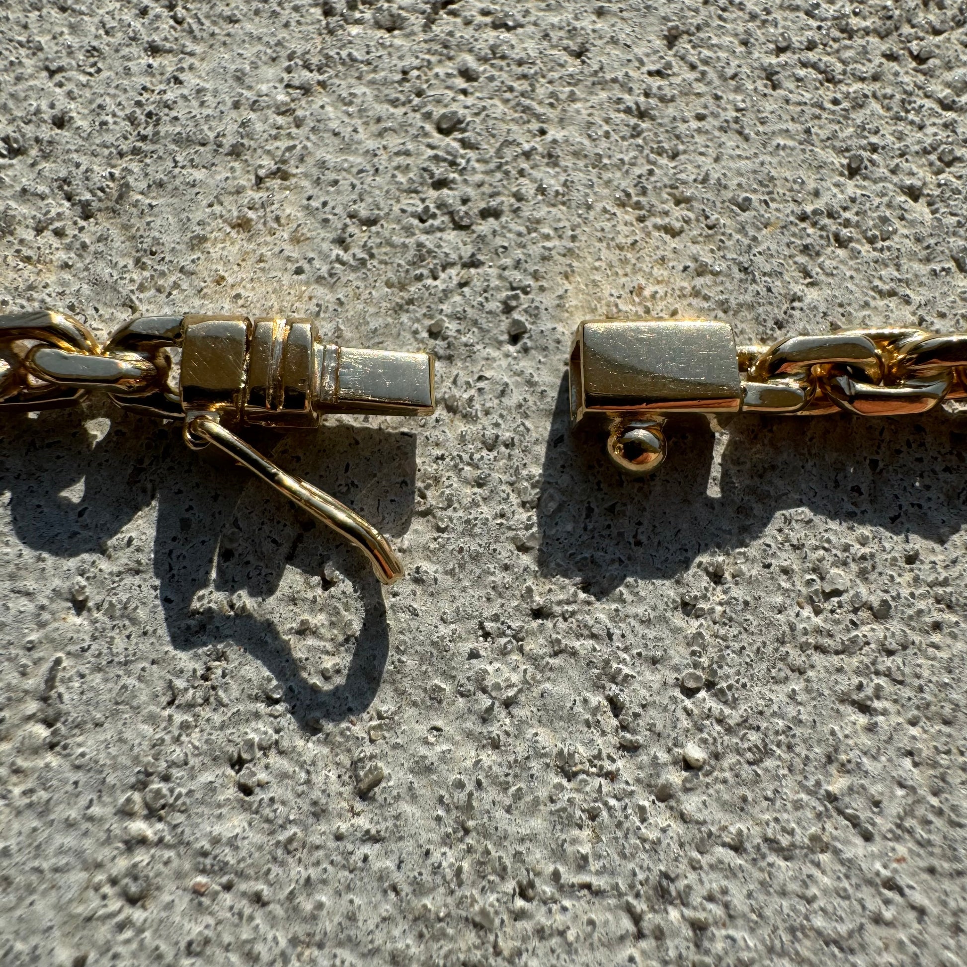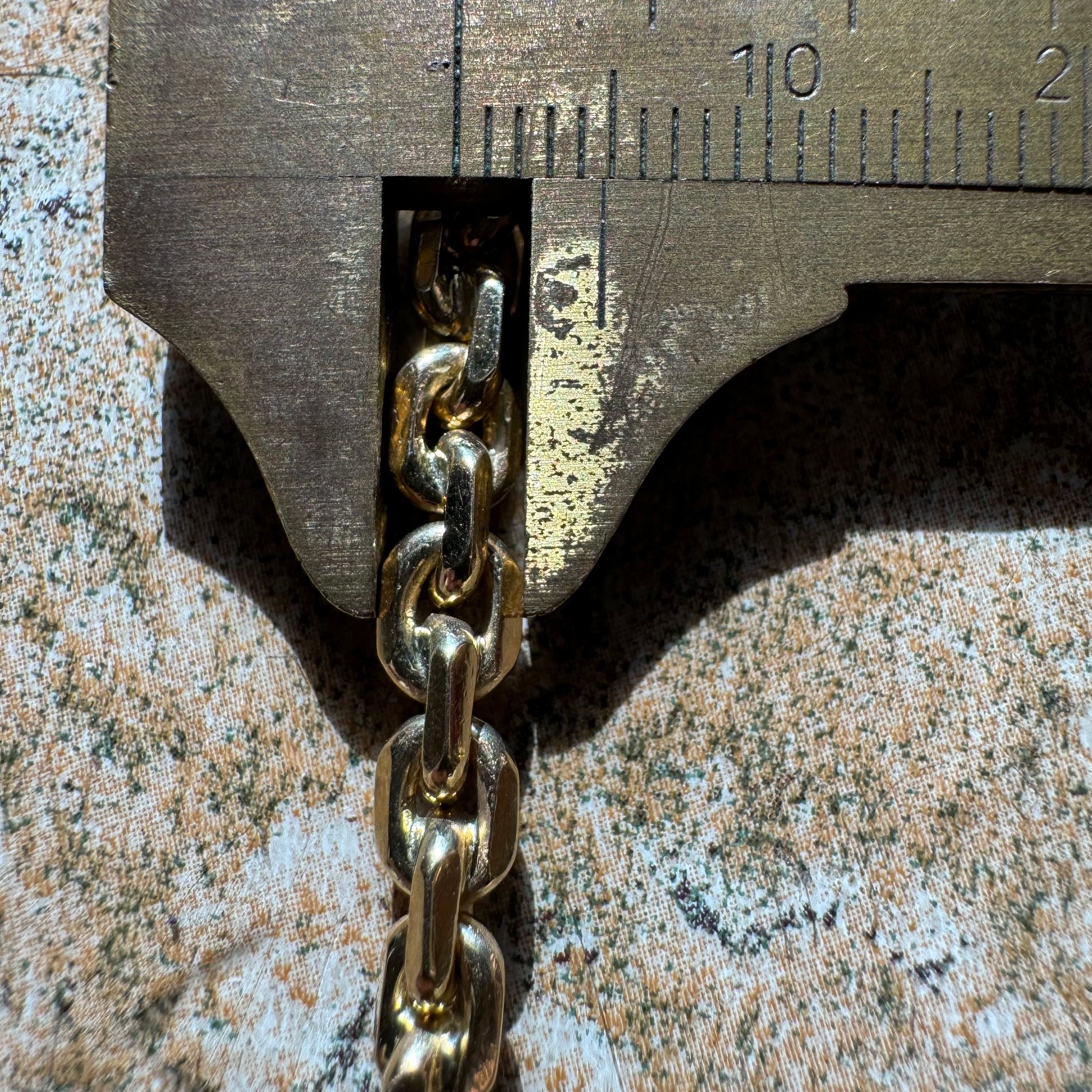 This solid 18k gold “biker chain” style anchor link necklace is one to be reckoned with. All handmade back in 2009 this piece has never been worn and was purchased from a closed down jewelry store from the jeweler who made it and had it in his back stock. One of the most sought after styles if you’re looking for something tough and rugged this chain can take any type of action you put it through. Made with a heavy duty box lock and figure 8 side latch to secure it with the utmost protection. At the hard to find 22” length and 5mm by 5mm this is a chunky heavyweight chain weighing in at 56.5g.