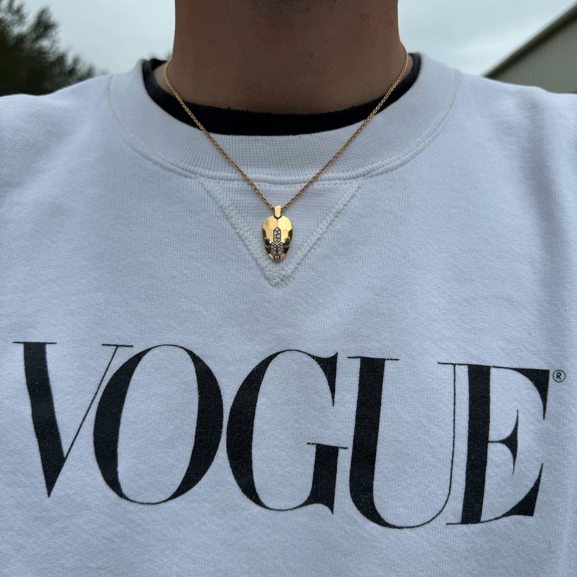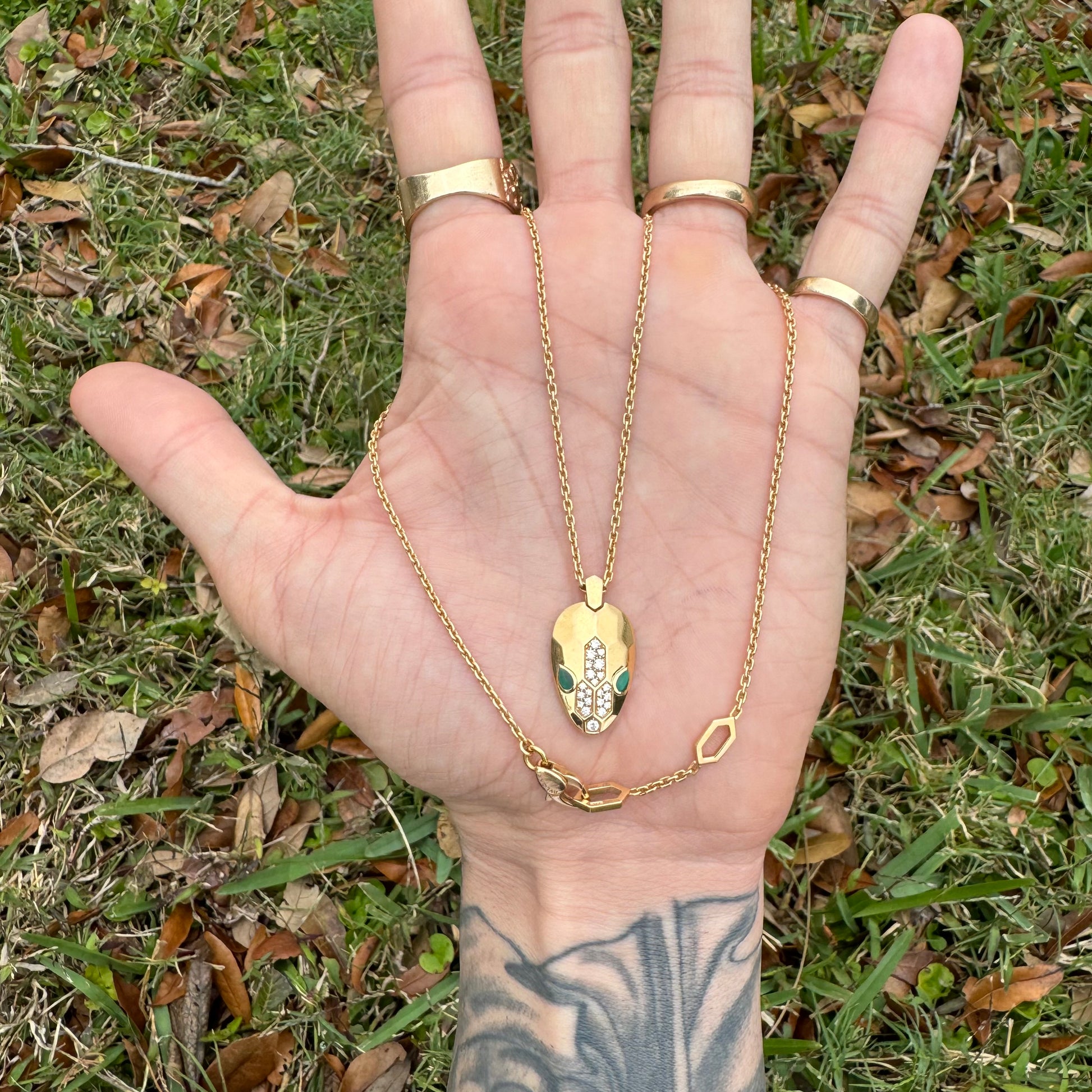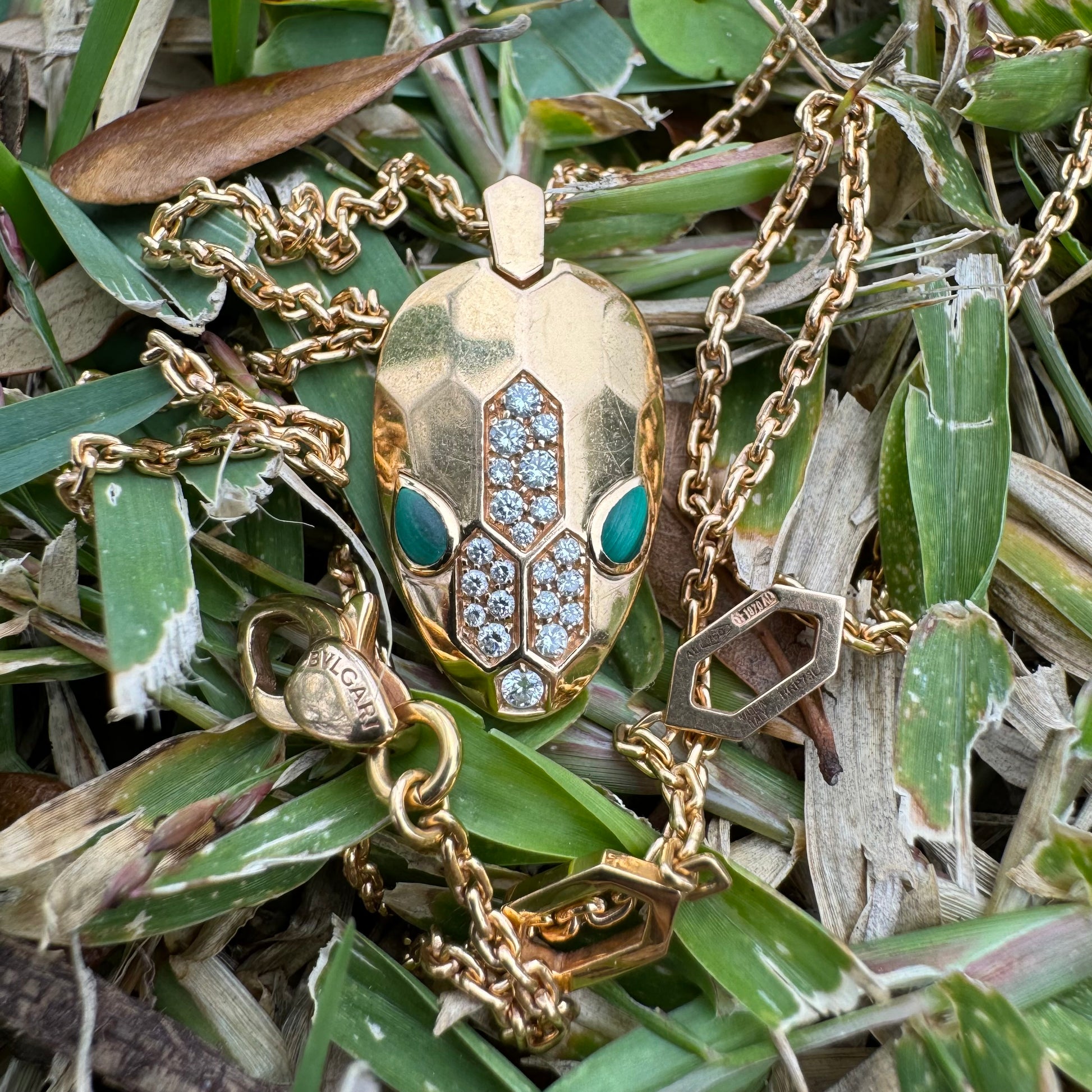 Encrusted with approximately .21ctw of VVS-1 (F color) natural diamonds representing the scales and 2 smooth and sinister looking pear shaped malachite stones for the eyes of the snake is this solid 18k gold Bvlgari “Serpenti” necklace. As stated in the original description from Bvlgari “Reborn time and time again, for over 70 years Serpenti has proven its ability to take infinite forms. In its latest incarnations, ultra-modern geometric scales are set with dazzling diamonds, blending contemporary contours with the snakes emblematic sinuosity.” The “biker chain” style anchor link necklace itself has 2 different end clasps to lock in at whether you want to wear it at a 16” length or at 17.5” while approximately 2mm thick and the whole piece of solid 18k gold weighing in generously at 14g. This amazing designer piece is not readily available and when they are you will be paying a lot more than this, as this one is the cheapest one you can find and by a long shot. The sales comps of reputable jewelers sold listings are from $5500 to $6350 while I see two available at the time of making this post that are being sold for $4450 and $7000. Don’t regret it and miss out on a classy yet fierce piece of grade A designer jewelry at painstakingly cheap price.