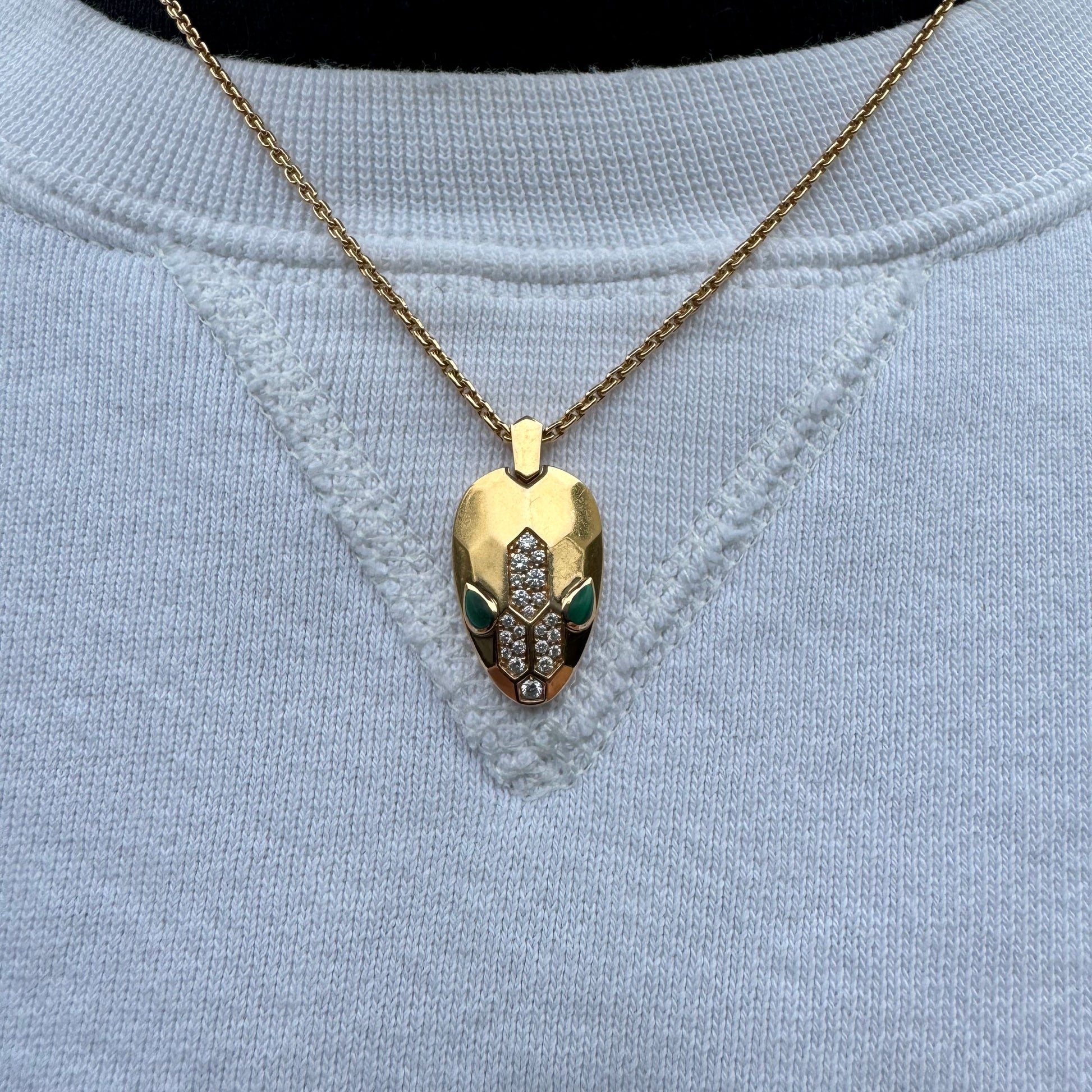 Bvlgari 18k Gold VVS Diamond And Malachite “Serpenti” Necklace (17.5”) With 14k Interlocking Double Chain Link (21”)