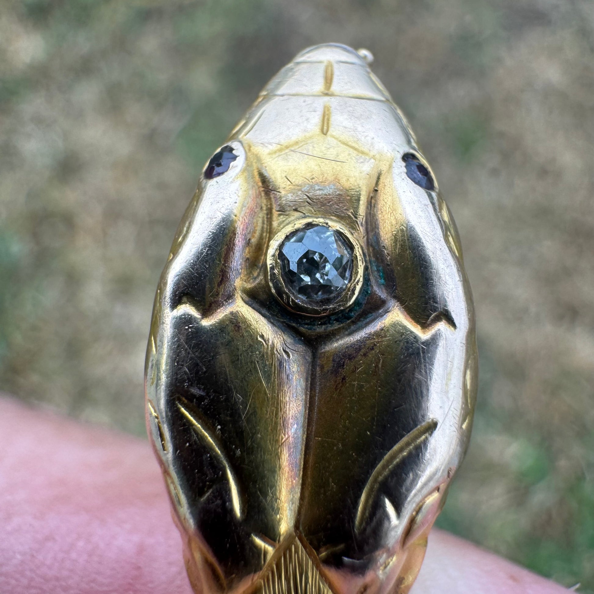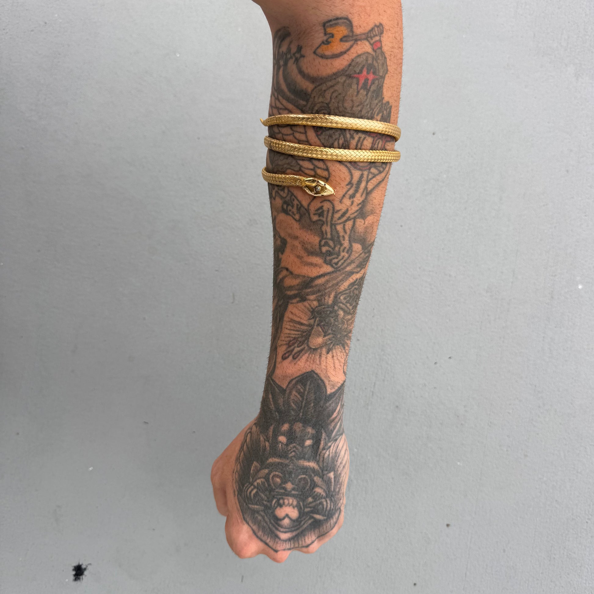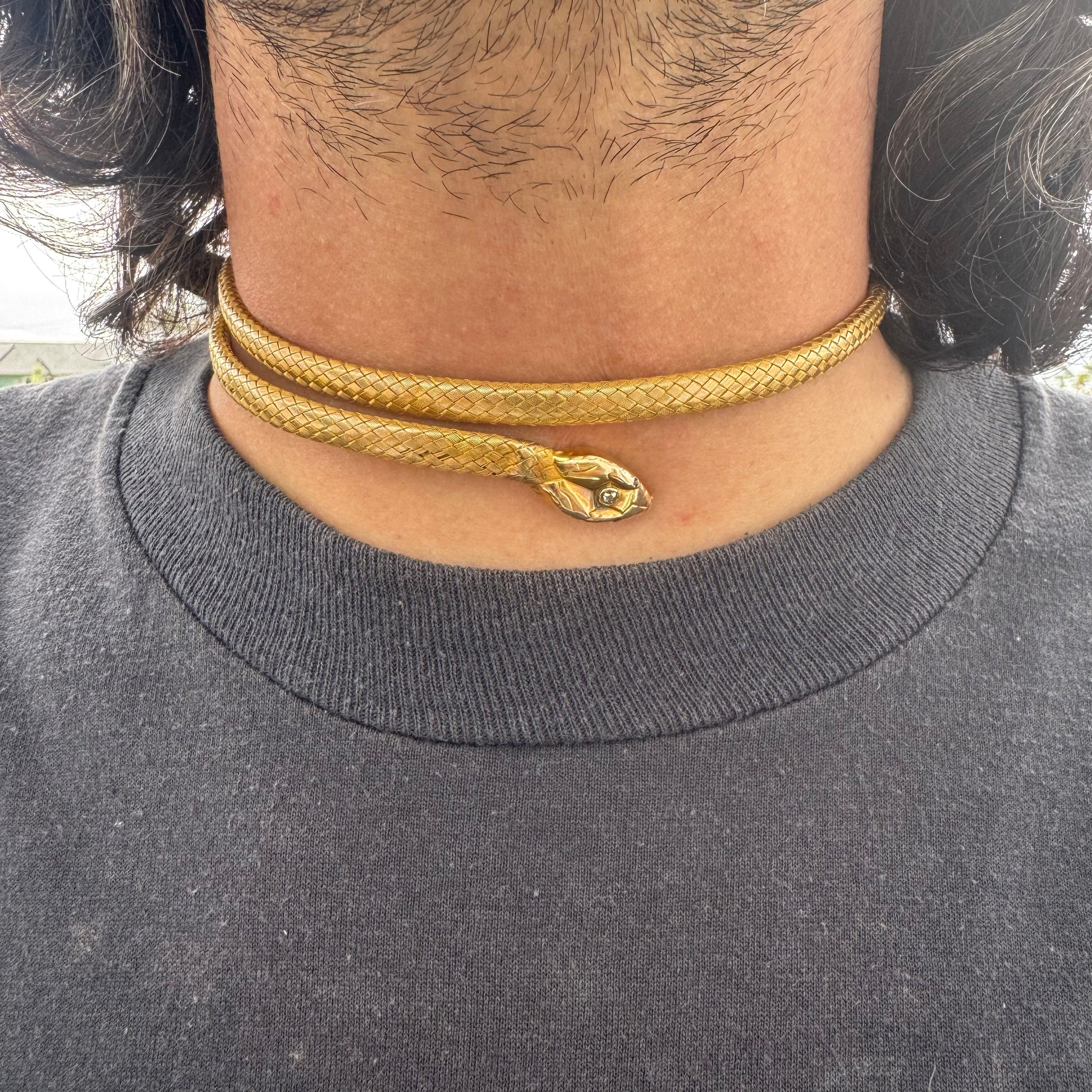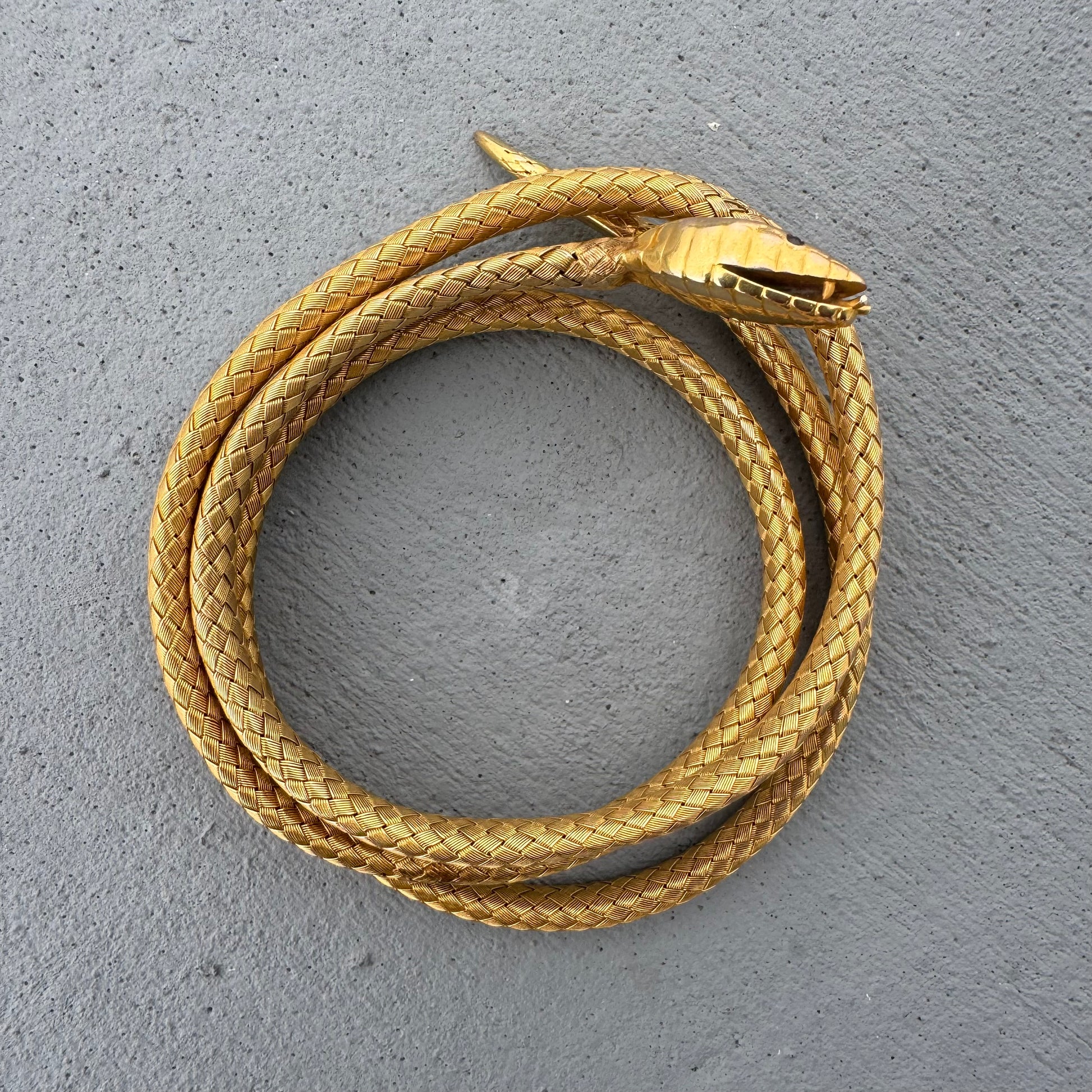 Straight out of the vintage collectors jewelry guide is one of the most infamous pieces of jewelry ever created. Crafted sometime around the mid 1800’s Victorian era out of 19.7k yellow gold (XRF tested as shown in picture #29) is this fierce and fabulous woven flexible snake band. With a variety of uses whether wrapped around the neck or arms you will be the standout of the ball. Perched atop the head of the snake is a natural old mine cut diamond and emblazoned with ruby eyes the snake measures just under 24” end to end and weighs in at a hefty 34.4g with a circumference of the main body at approximately 6.5mm x 5mm. Though this piece isn’t hallmarked I have seen it in the old jewelry books looking exactly like this and made by the likes of Tiffany and co. Extremely rare and hard to find if you are lucky enough to find one I can assure you it will not be priced this well and more often then not you find these at lower karats of gold. A true museum piece this is the epitome of a top tier collectors piece. For being around 175 years old this piece is in good wearable condition despite having minimal wear and tear in a few spots as shown in the pictures but should be nothing to turn you away from this beauty.