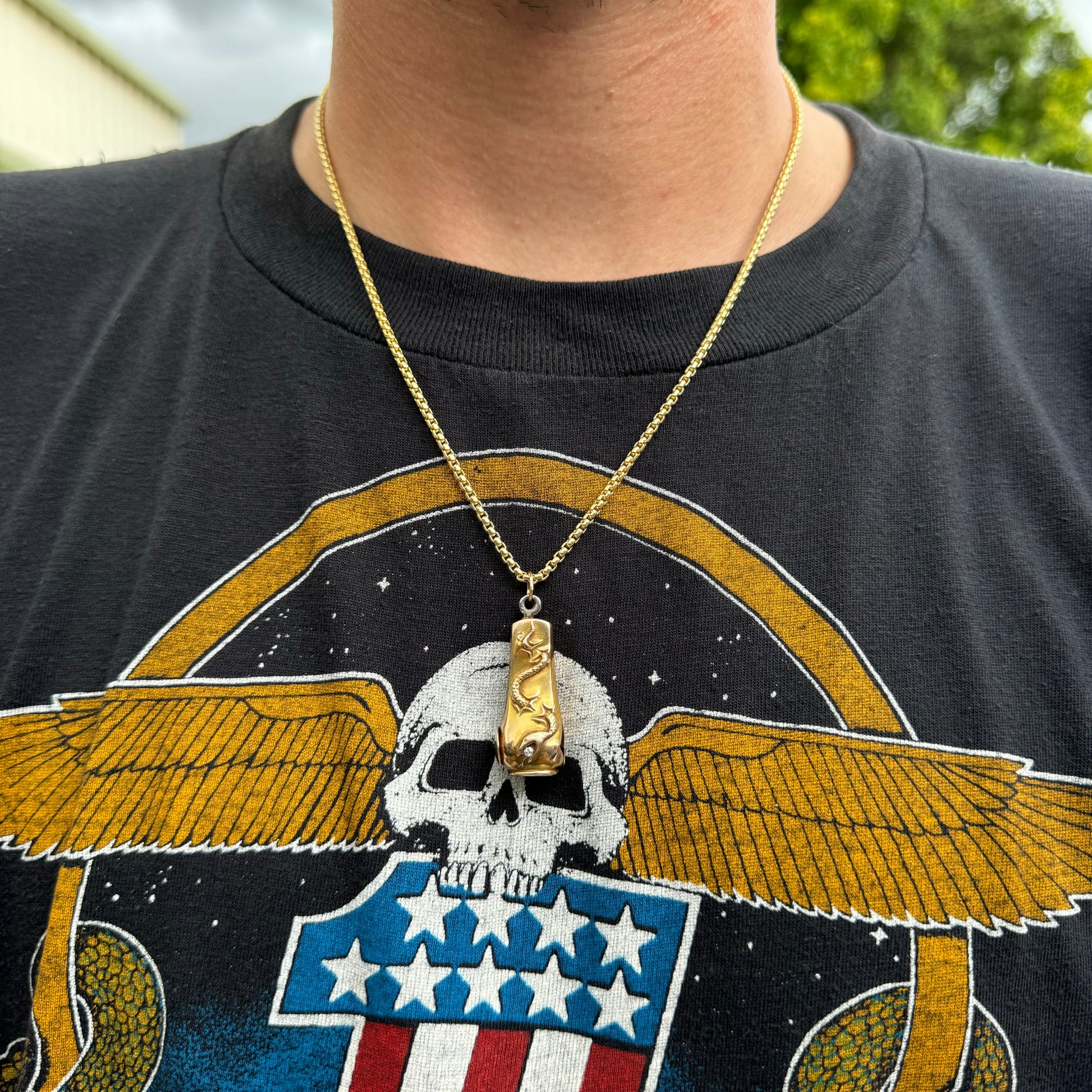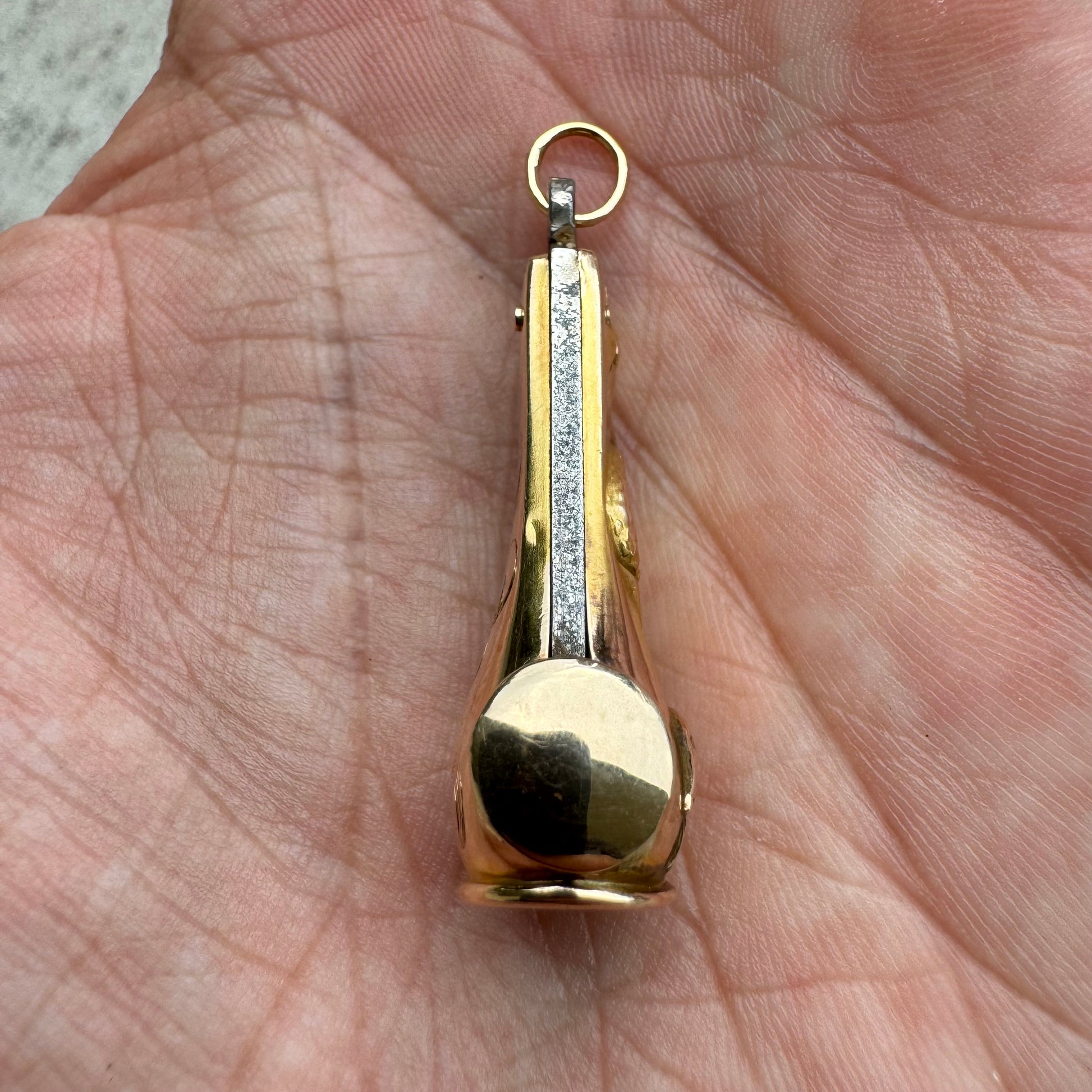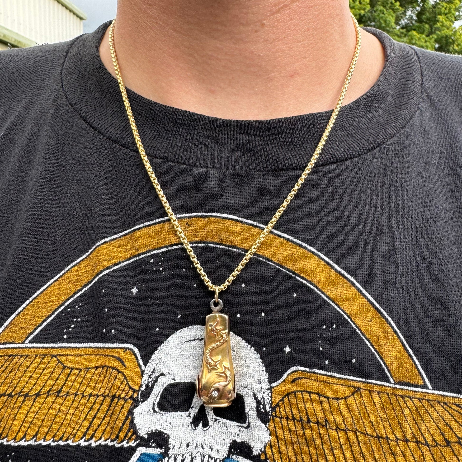 I like to refer to this insanely rare piece as “The Diamond Gag”. Hand chased monogram initials on the back side marked “GAG” with the menacing snake slithering through the front side and breaking through the 3rd wall in 3D as it clutches a natural old euro cut diamond in its powerful jaws (as if it’s gagging on the diamond). If you’re not familiar with what you’re looking at you’re not the only one, this is a piece of the past and something not used in this day and age. This is a cigar cutter fob pendant made sometime around the 1910’s and crafted out of 10k gold. Worn on old watch chains as it would dangle off the end as a fob though this is unlike one that I have ever seen. If you want to be orginal and wear a pendant you won’t see anyone else wearing this is that statement piece for you.