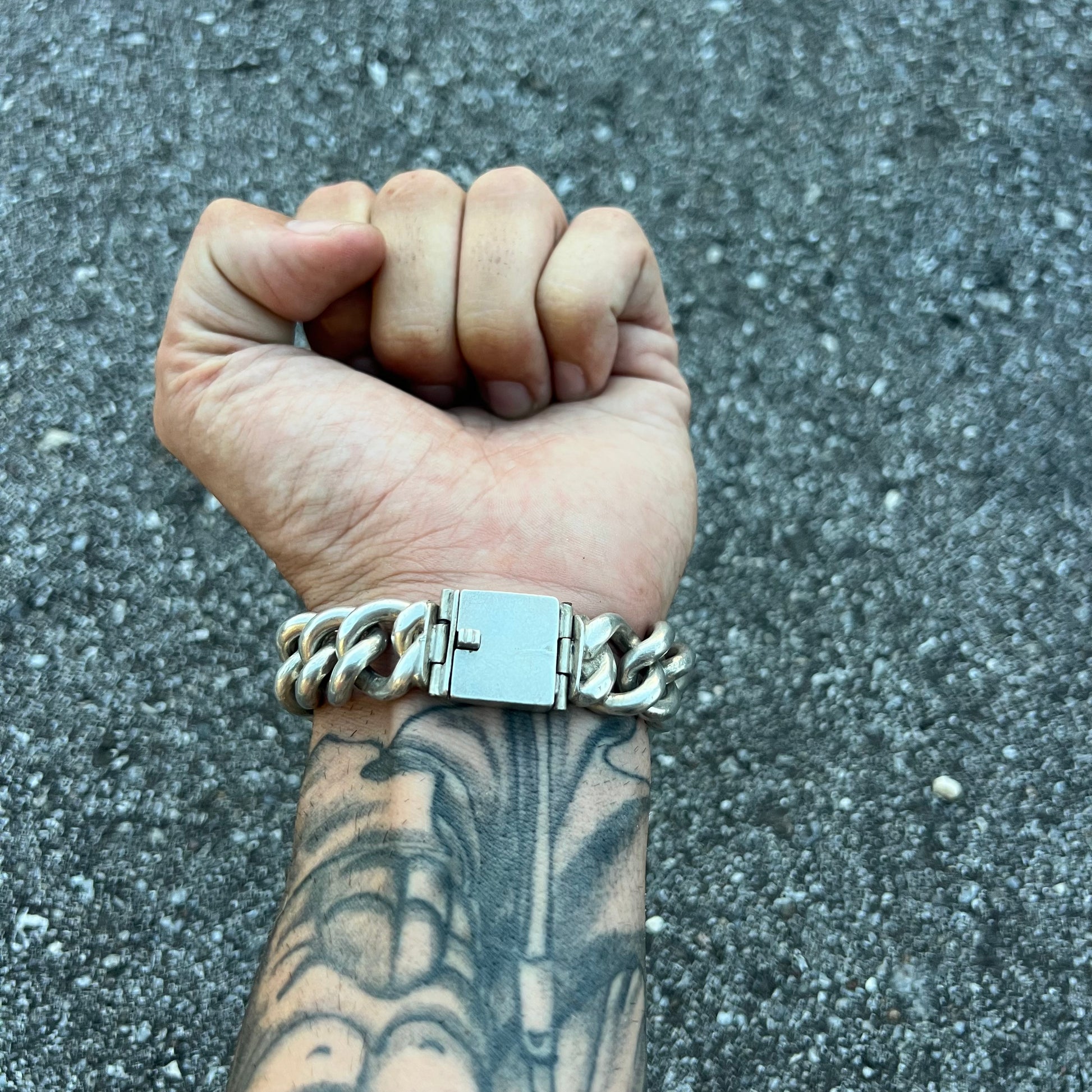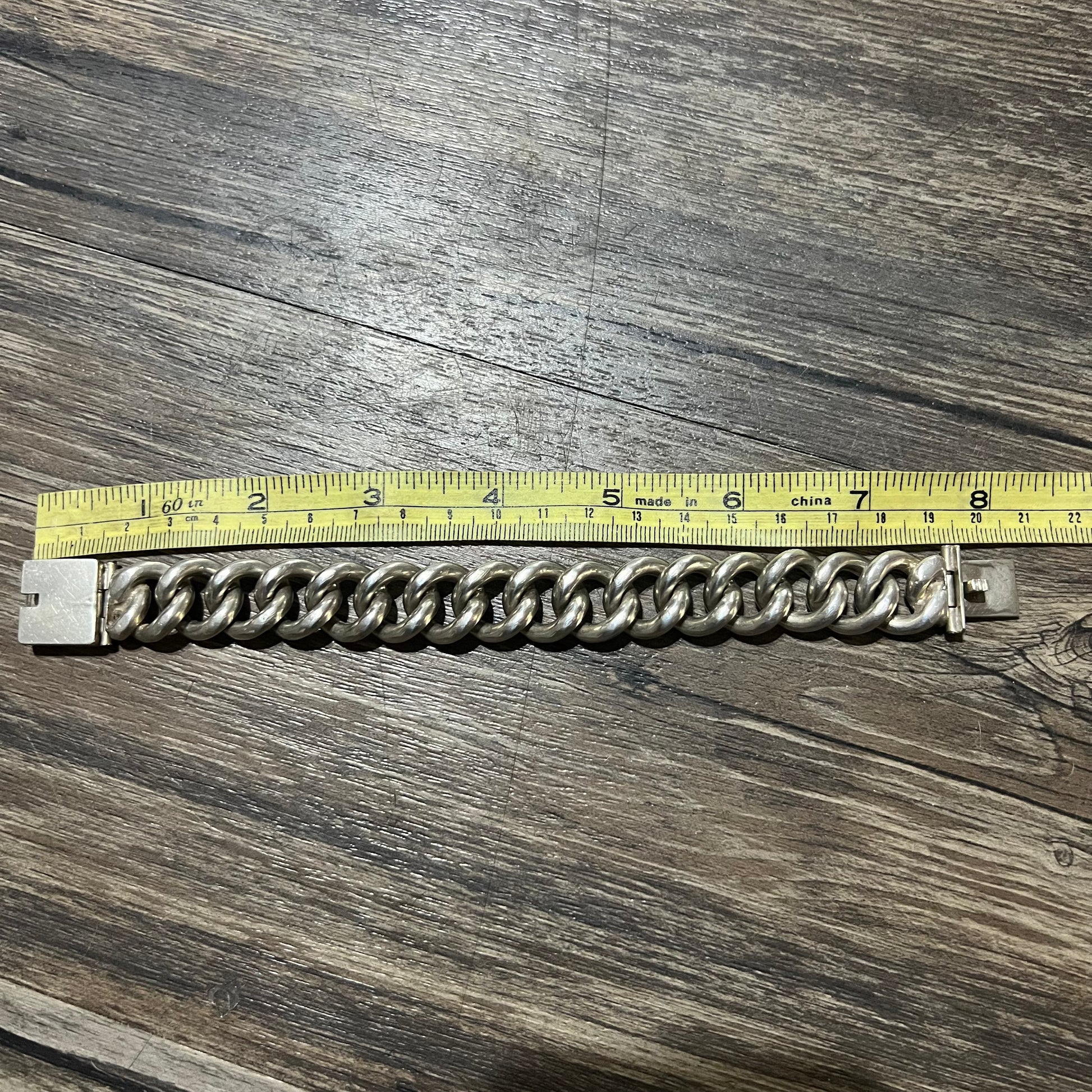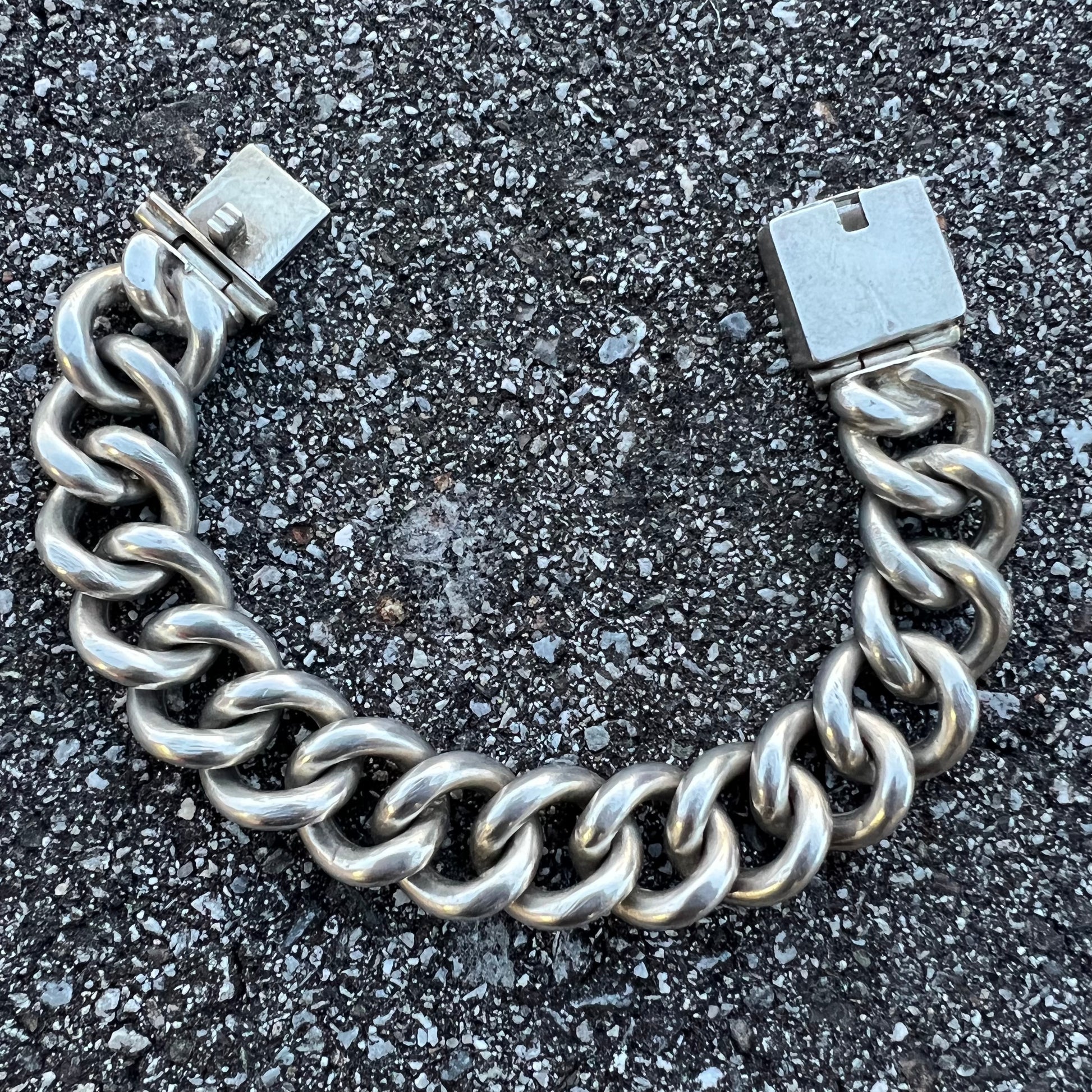 1920’s era solid super heavyweight sterling/.925 handmade curb link. This one is to the extreme weighing in at 109g 17mm wide by 7.5MM thick. It measures 8.25” end to end but by the time it’s clasped (7.75”) and because it’s so thick the surface area takes up about .5” making the length closest to around 7.25”. This is a beautiful bracelet with a long history and patina to show for it.