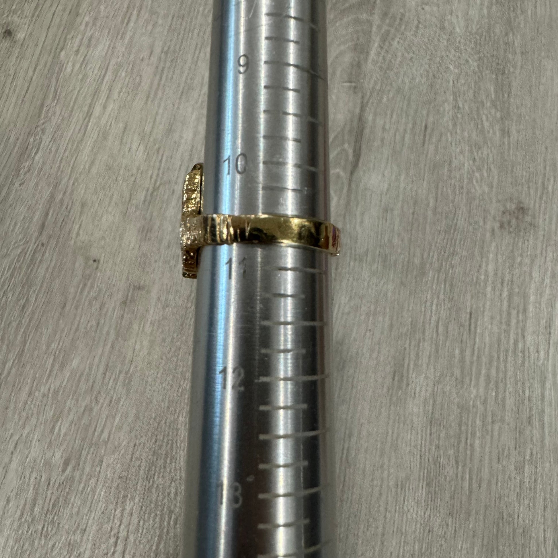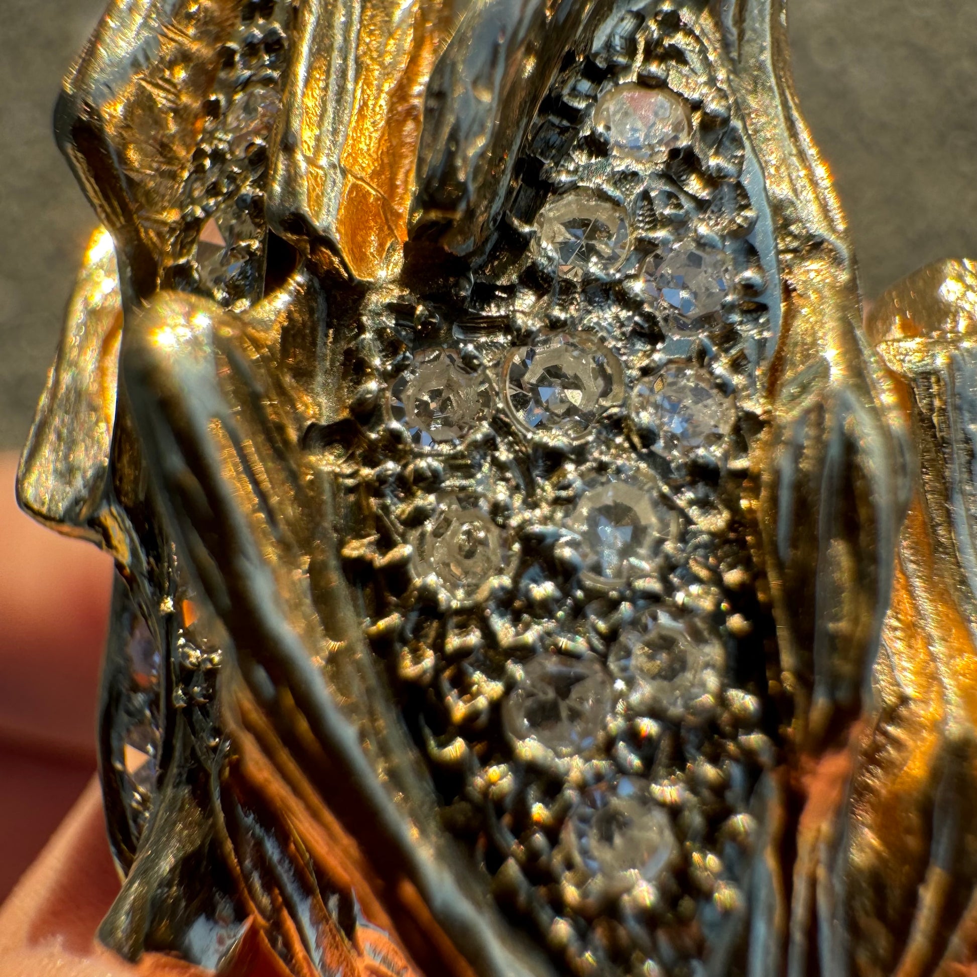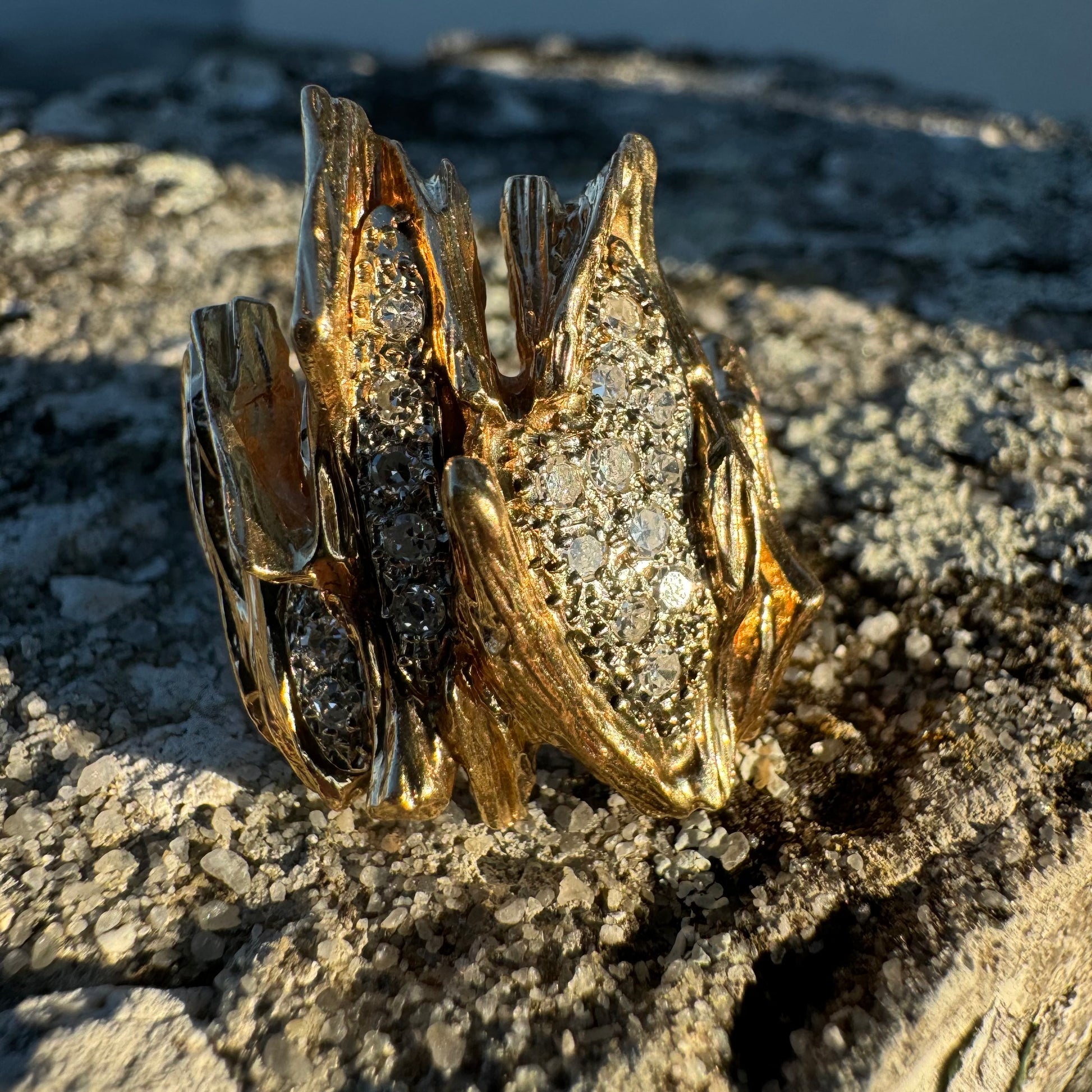 This piece is absolutely massive. Sharp rounded edges reminiscent of kryptonite shards with deep contrasted valleys and .75ctw of all natural single cut diamonds set inside. Hand crafted out of a solid 14k yellow gold weighing in at 18.1g with a large stance of 28mm on the finger and a size:10.75. A true one of one piece from the 1960’s you won’t see anyone else have.