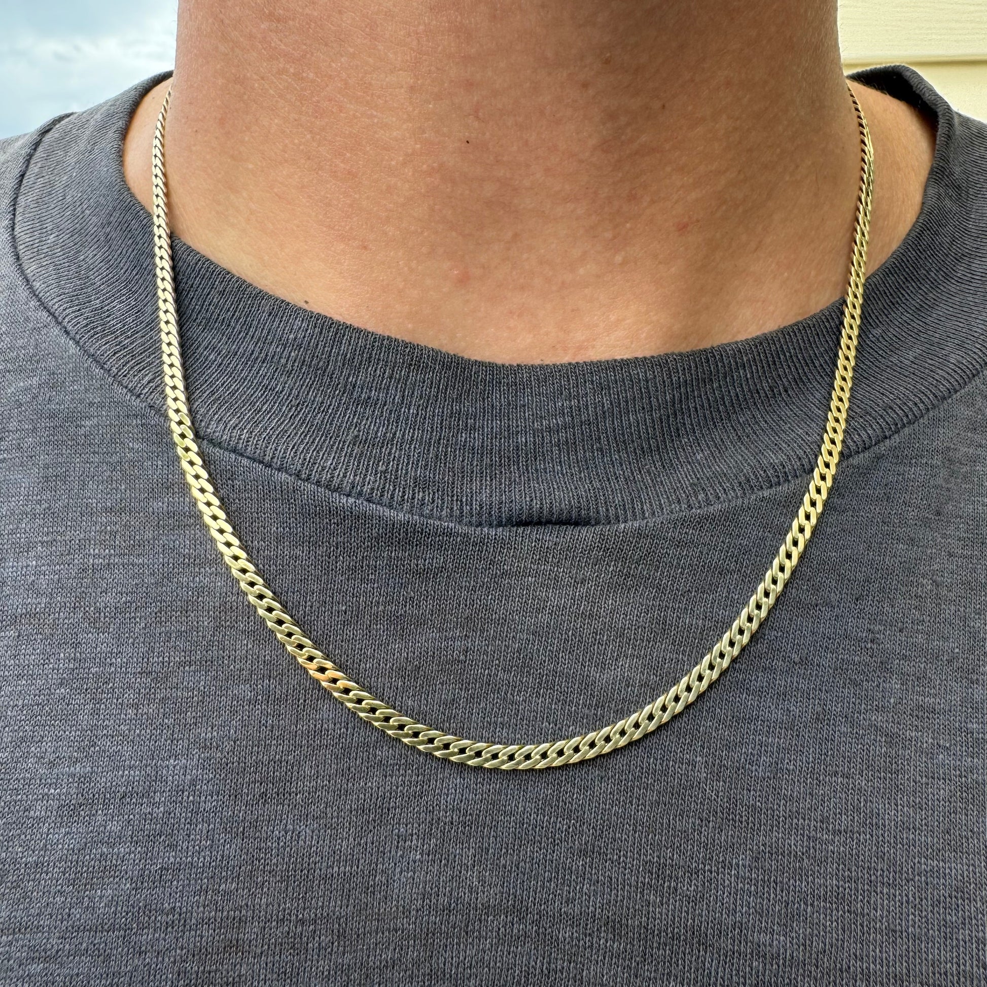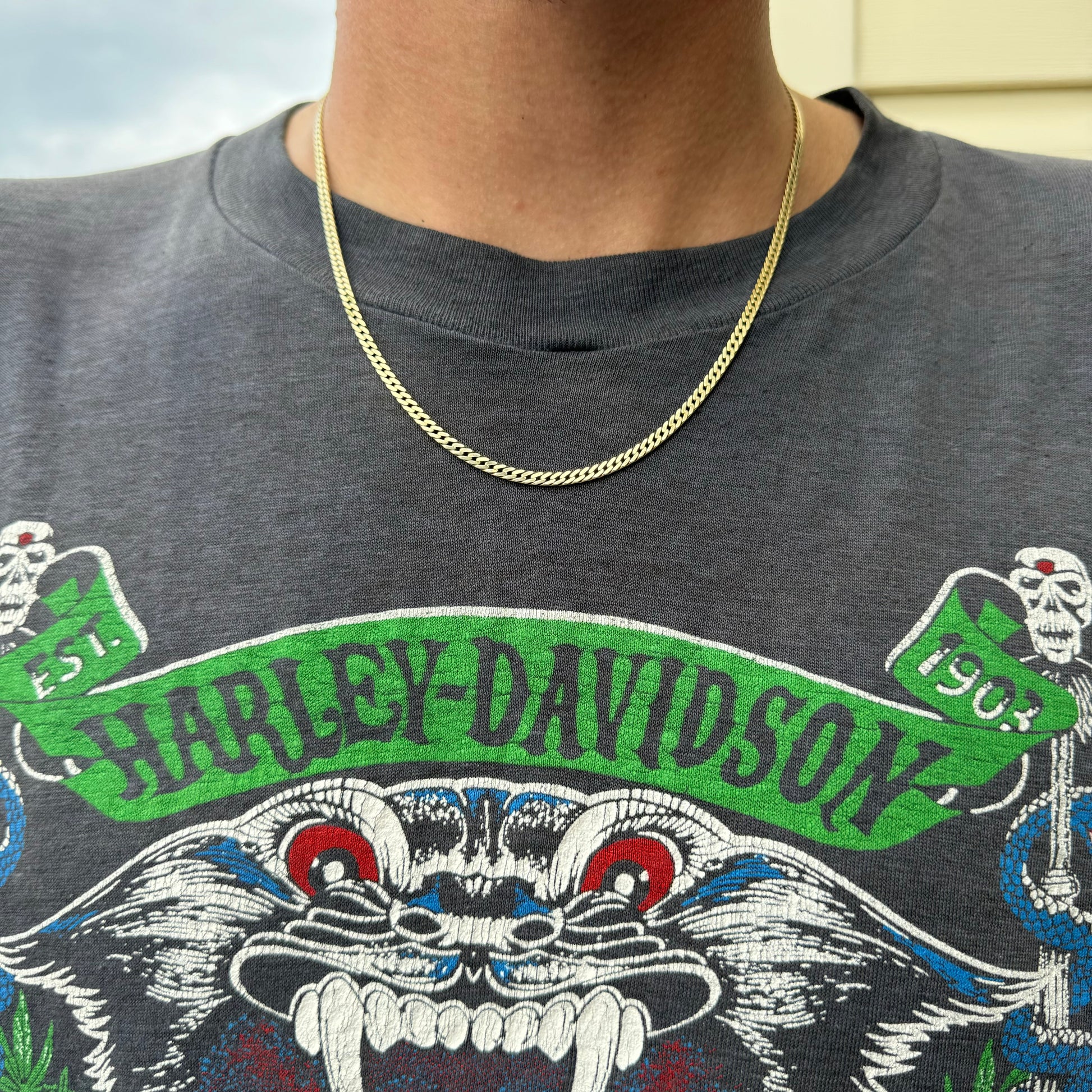 With the clasp style and Italian hallmarks dating from around the 1970’s this is the epitome of the old school style fancy Cuban link. Made out of solid 14k yellow gold in the “herringbone” style this necklace almost acts like a vertebrae bending and forming around the neck like it’s part of your own anatomy as it lays effortlessly and comfortably draped down the neck and over the collarbone. It has one of the most timeless looks to it with that liquid gold mirror finish as it glows bright in day or night. Quite a heavy chunk at 14.88g it measures at a wearable 19.25” length with a width and thickness of 3mm x 1.5mm this chain is something you’d see worn by an Italian mafia don in the most coolest of ways.