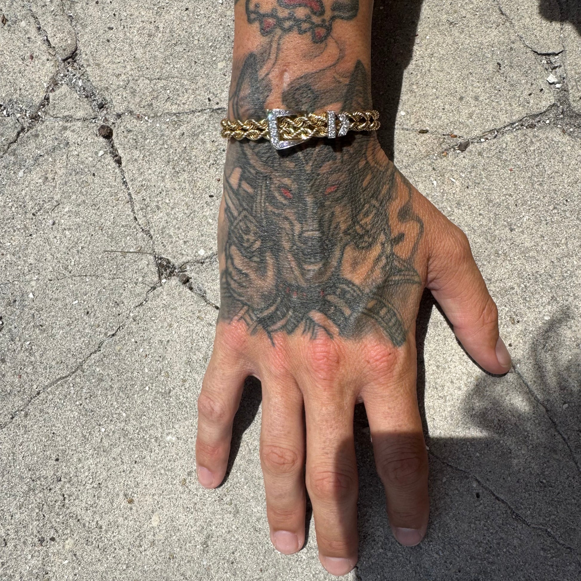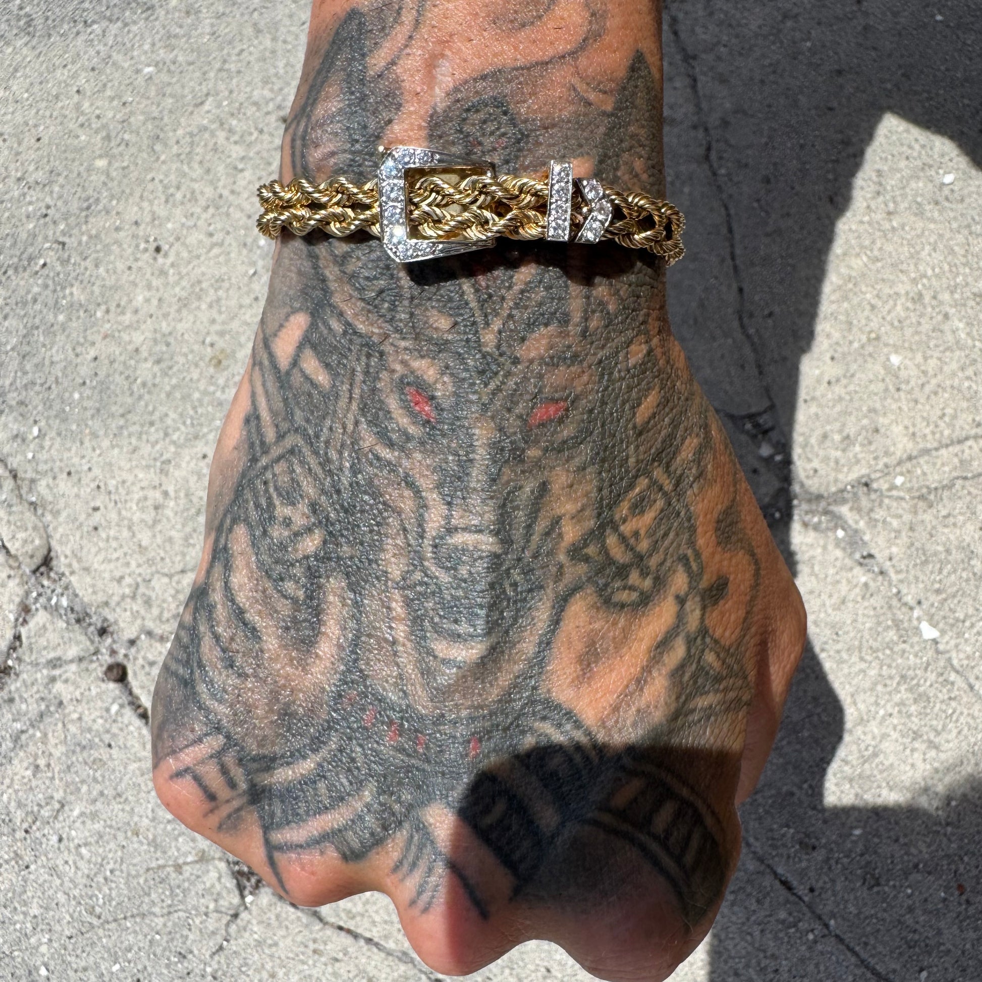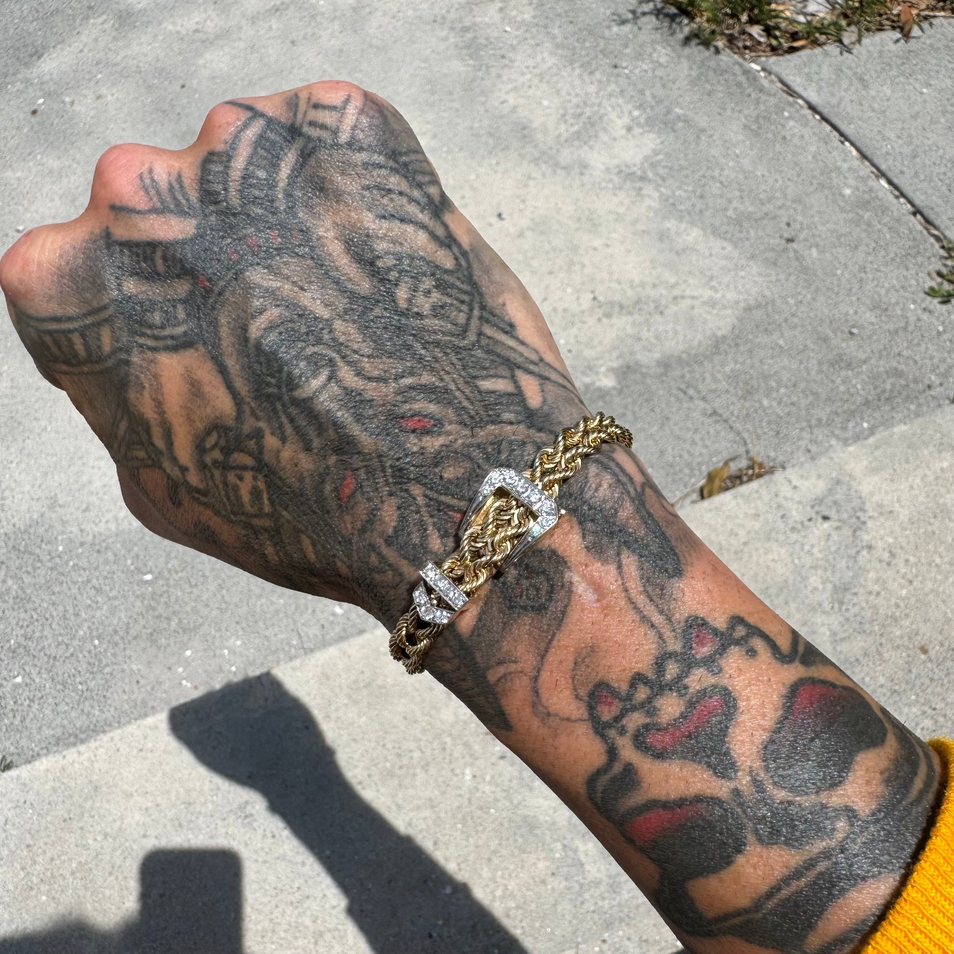 Meticulously crafted by hand sometime around the 1970’s this piece was made by a master jeweler with the utmost attention to detail. Crafted out of a fully solid 14k yellow gold each piece works and articulates just like that of a belt. Encrusted with beautifully clean near VS quality .75ctw of natural diamonds the hardware buckle, belt end, and belt loop has most parts crafted out of white gold giving that added extra pop to the diamonds. This bracelet will fit any size wrist up to 7” but I would recommend it for size:5” through 7” to fit comfortably and look the best. With a chunky build and sturdy weight at 24.1g and 8mm this is really a piece you need to see and wear in person to truly grasp how perfect it is.