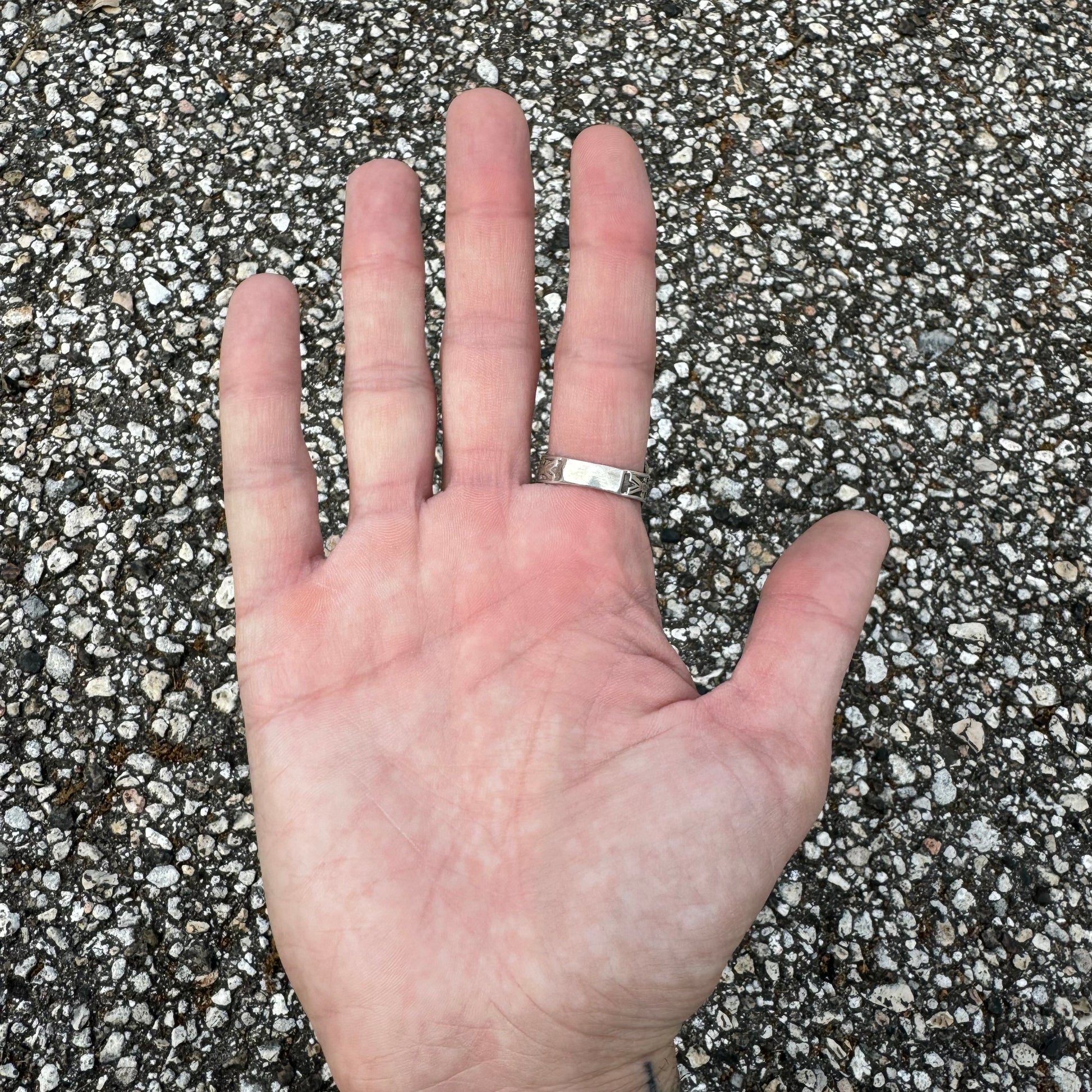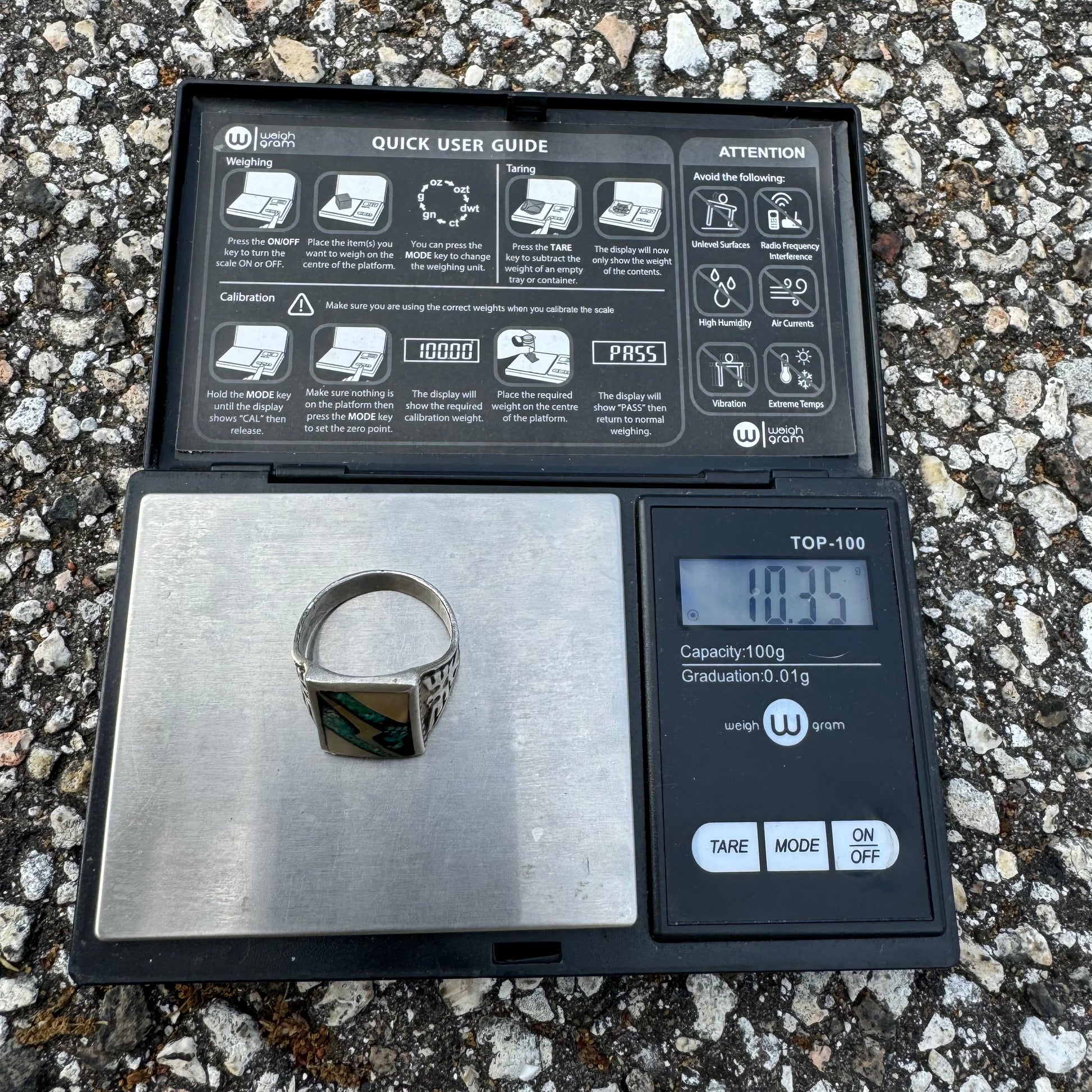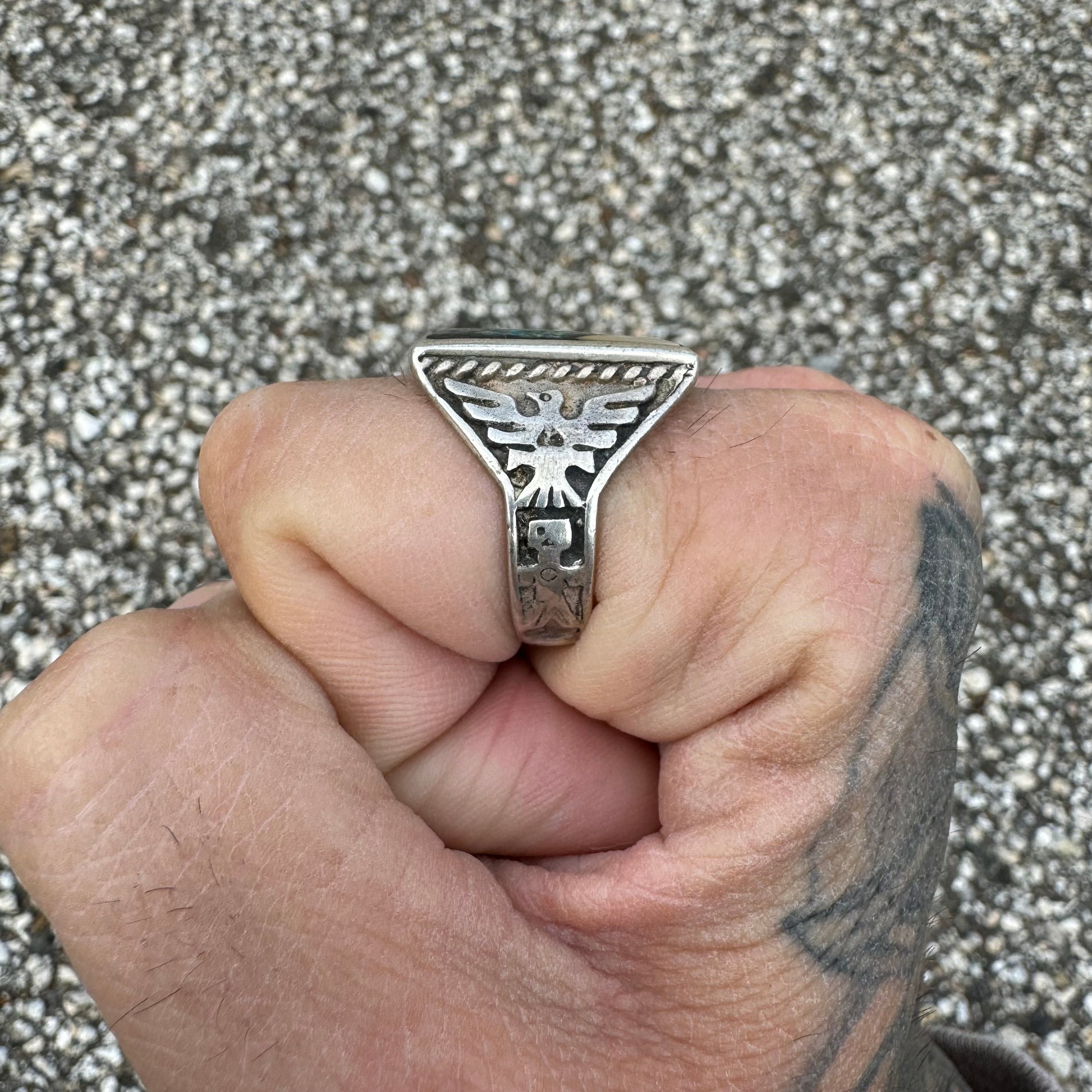 Absolutely beautiful and a rare design at that with the Thunderbird and deity going down each side of the shank on this beautiful solid sterling silver ring. Crafted by hand sometime around the 1970’s with crushed turquoise and a mother of pearl inlay making up a lightning bolt this ring is heavy and for a bigger finger being a size:12 and weighing just about 11g. Most likely Native made, out in the Southwestern United States, this is a craft that was passed down from generation to generation and is a true work of art.