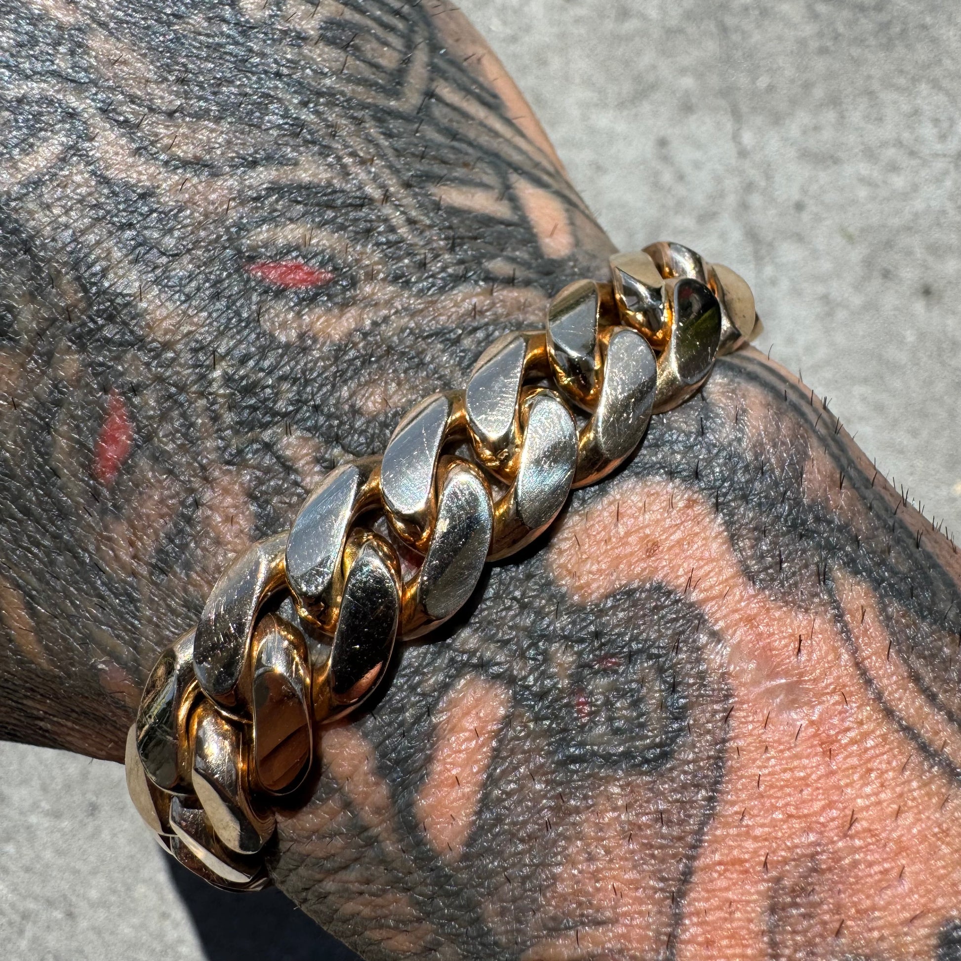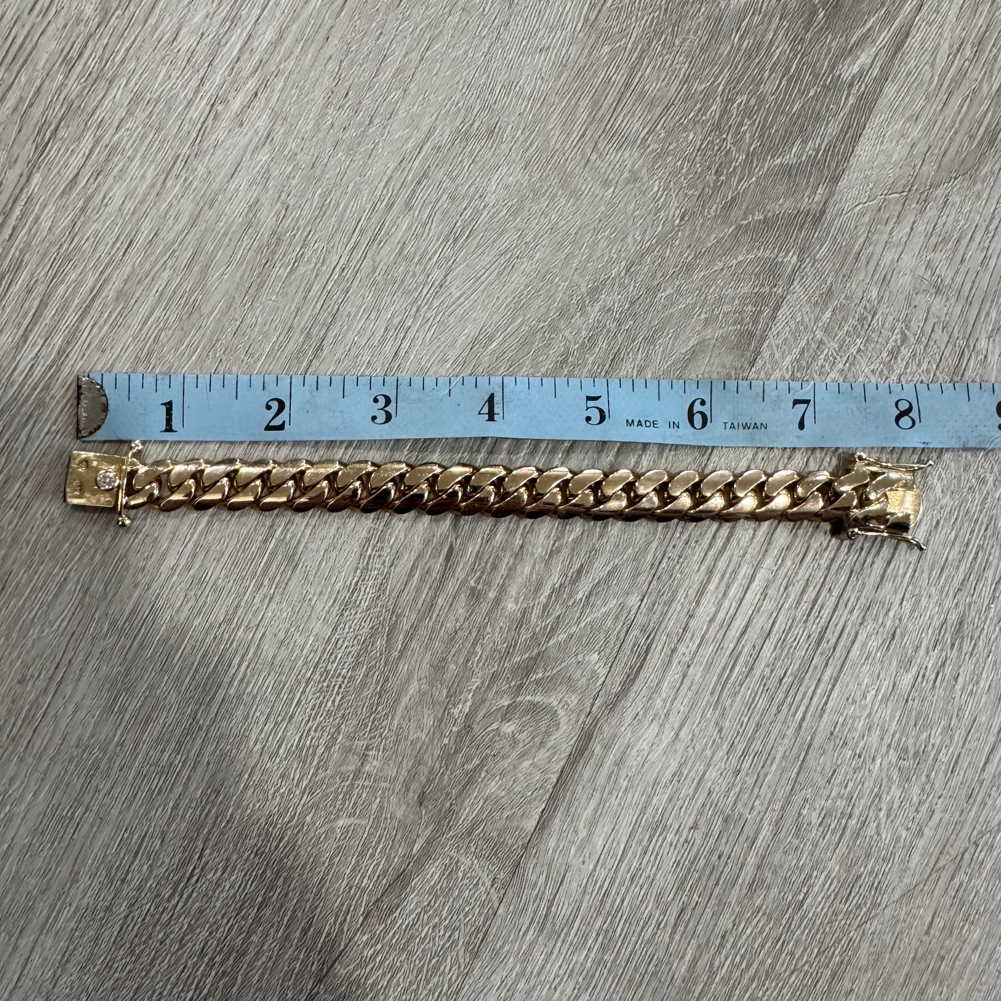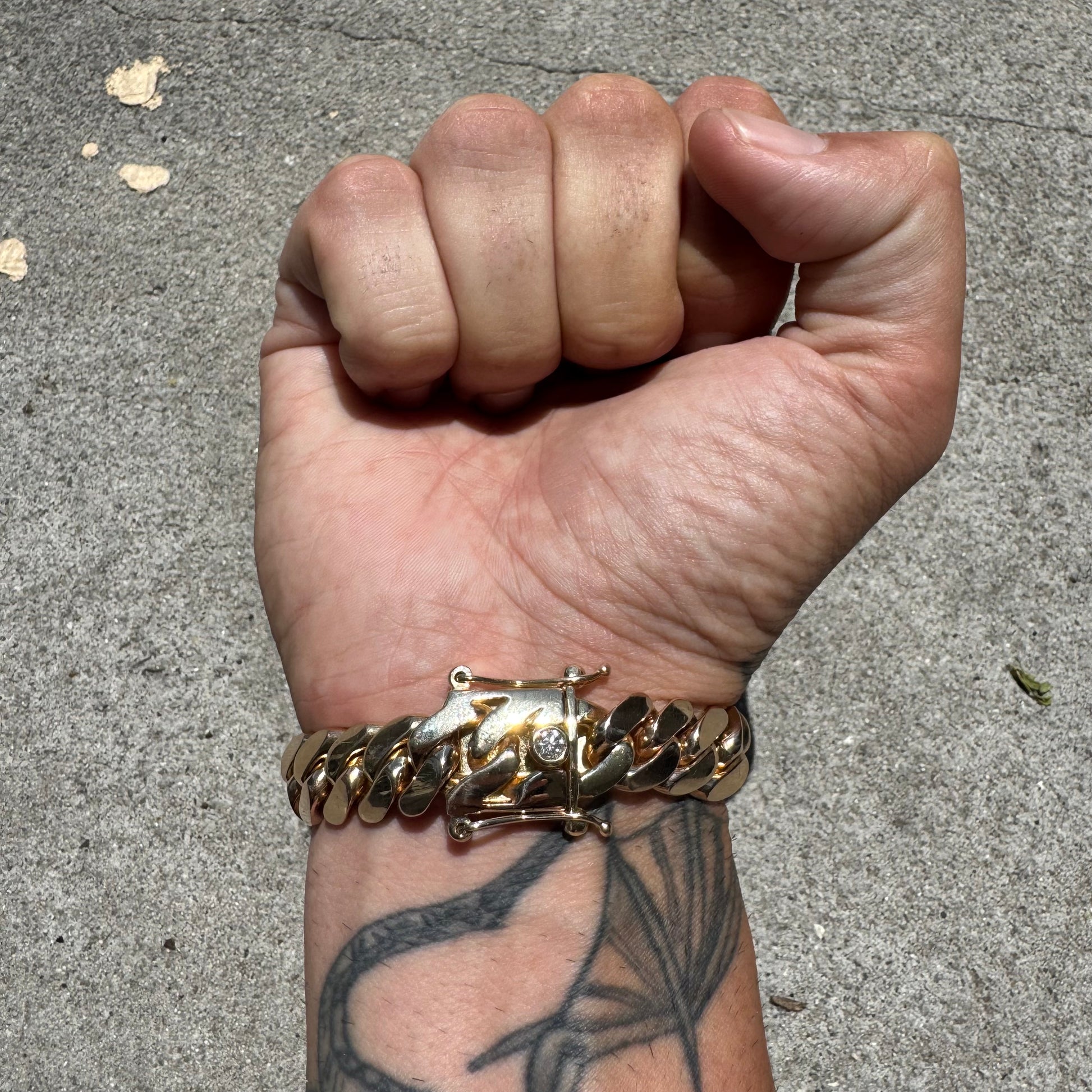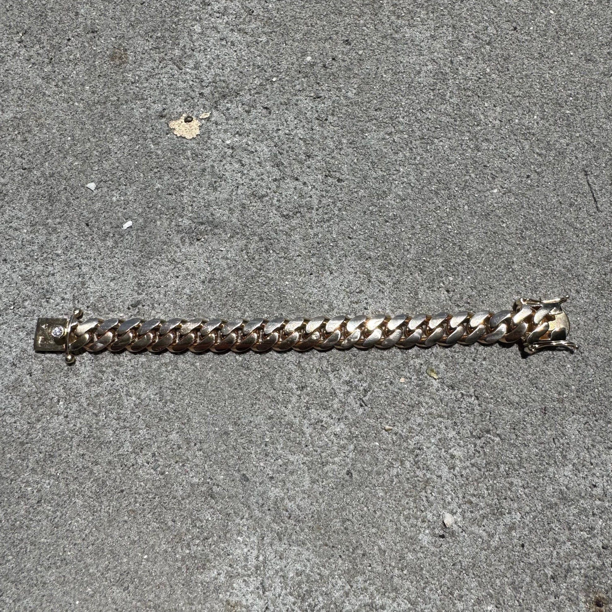This solid (85.29g) 14k yellow gold Miami Cuban link bracelet was all custom made by hand with the utmost attention to detail and quality. Flush set inside the push button clasp is a .25ct natural Vs quality Diamond. Underneath the block clasp is the monogrammed initials S.E in old English. Though the Bracelet measures around 8” end to end because of the take up of the oversized secure box lock and the circumference and thickness of the links (12.5mm x 4mm) it fits best at around 7” give or take with a bit of room to spare. Perfectly tight fitting and smooth links the piece lays exactly as it should on and off the wrist and is extremely comfortable and secure.
