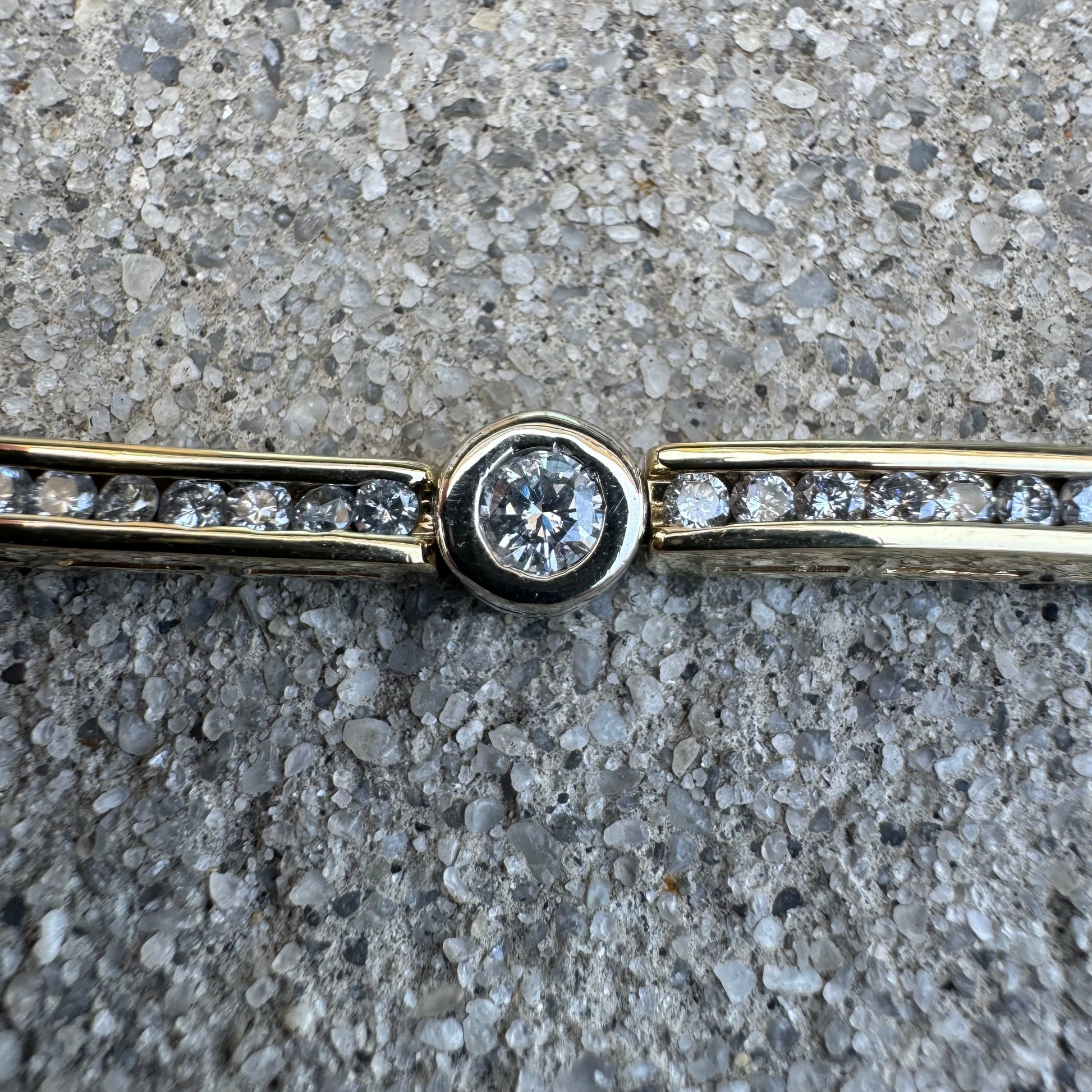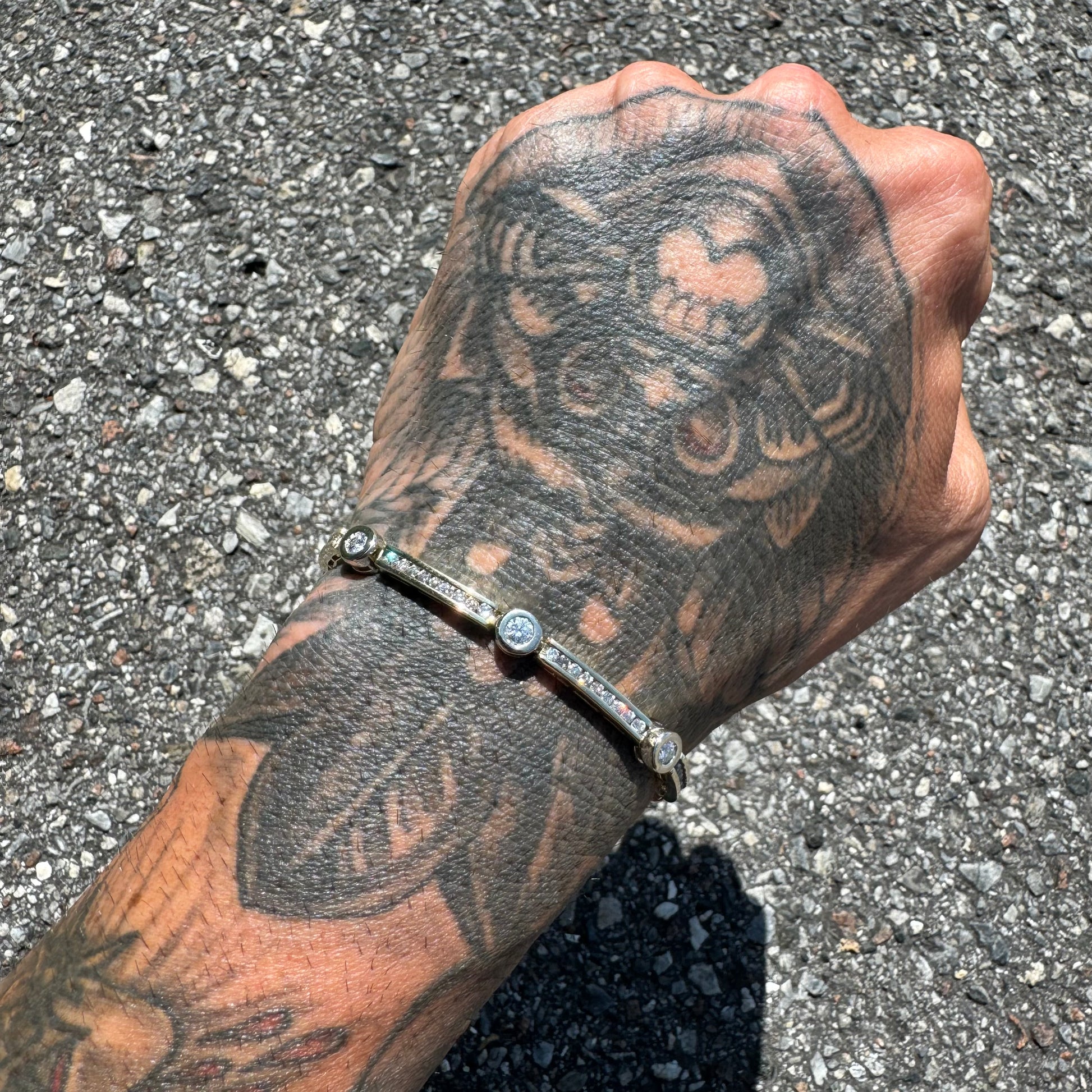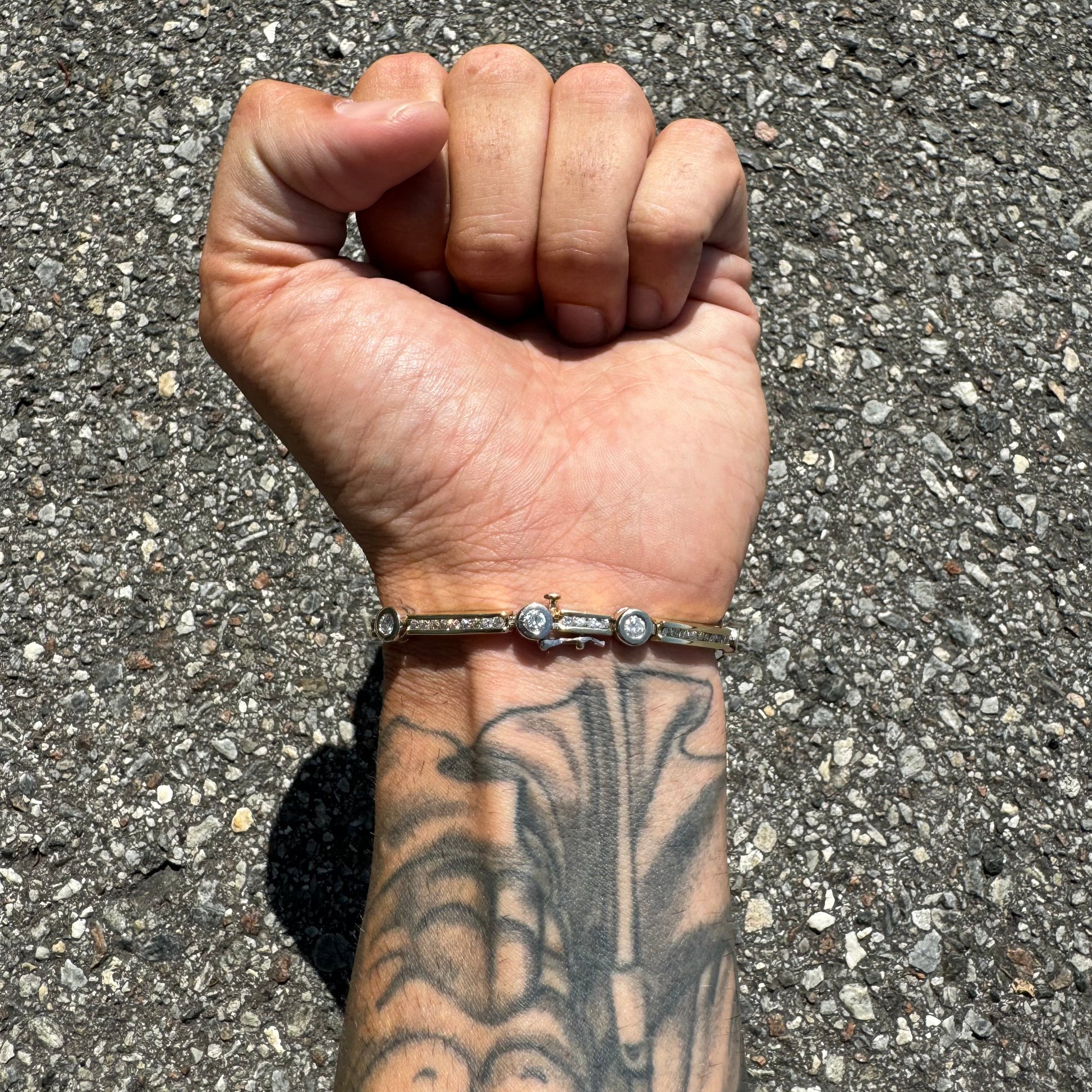 With approximately 58 natural diamonds at .03ct each channel set inside 14k yellow gold and 7 natural diamonds of approximately .25ct each bezel set in white gold you have a stunning hybrid combination bracelet of just around 3.5ctw of shimmering natural diamonds. This piece was all custom made and crafted by hand with a heavyweight structure weighing in at 17.25g thick and bold with a width and thickness of 6mm x 5mm and a wearable length of 6.5”.