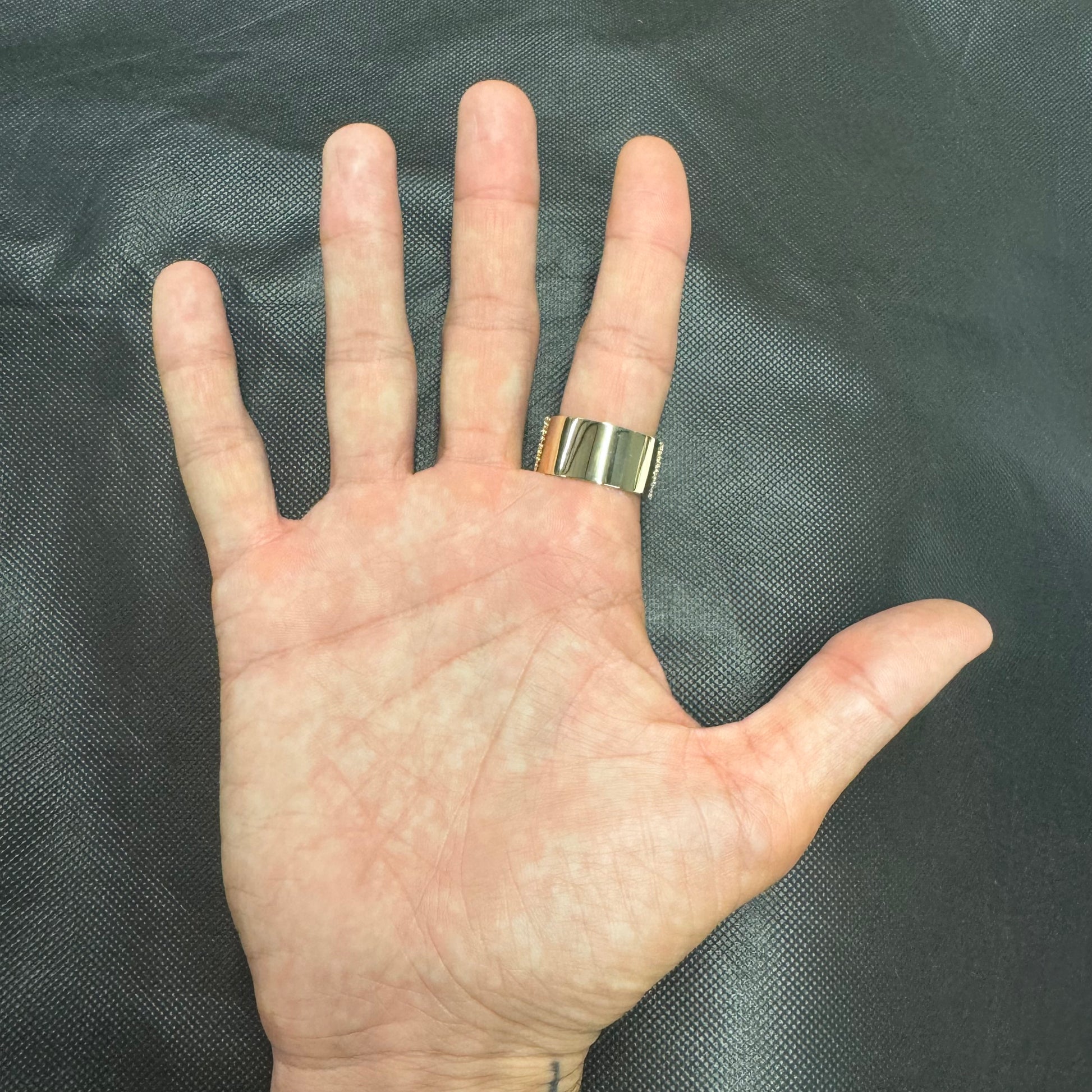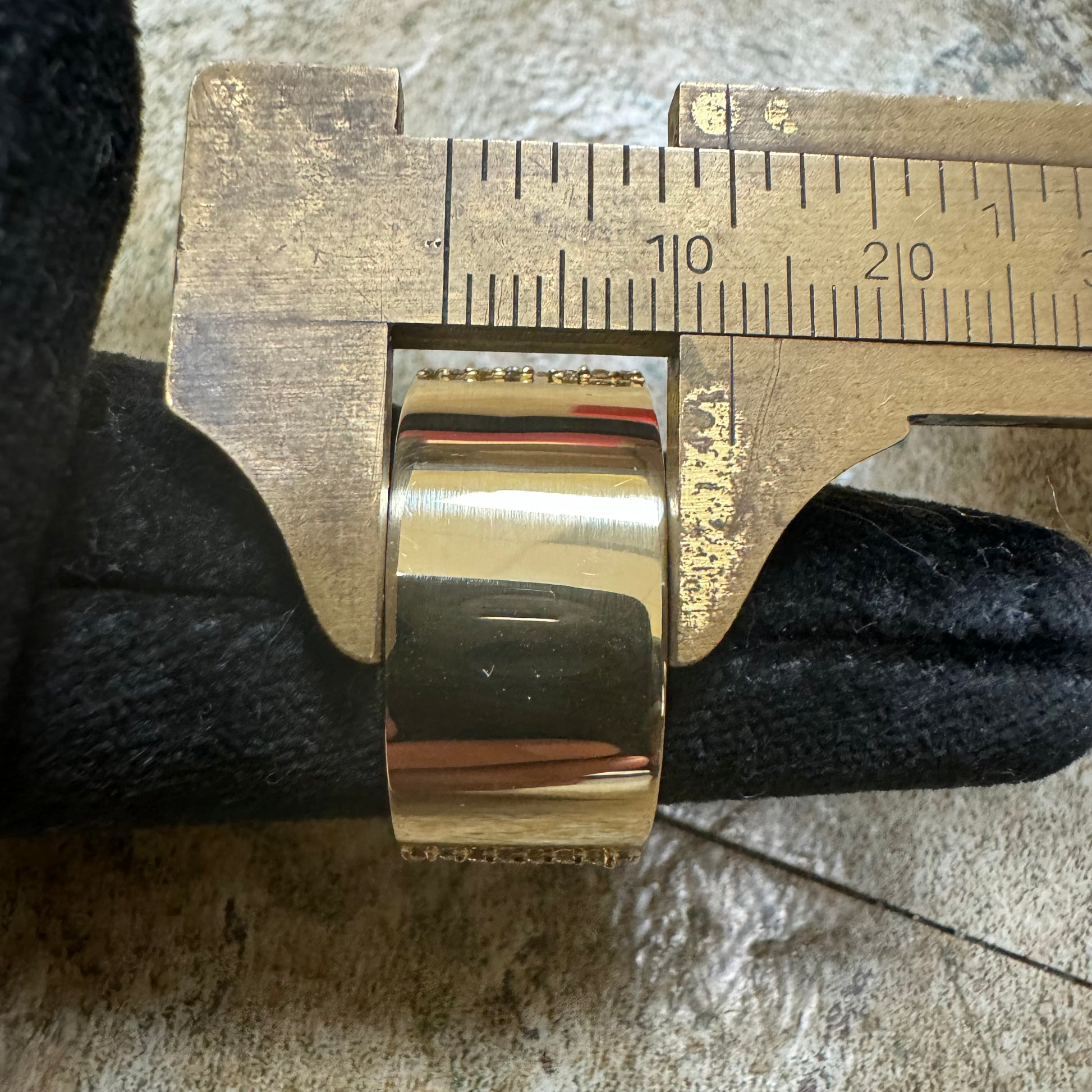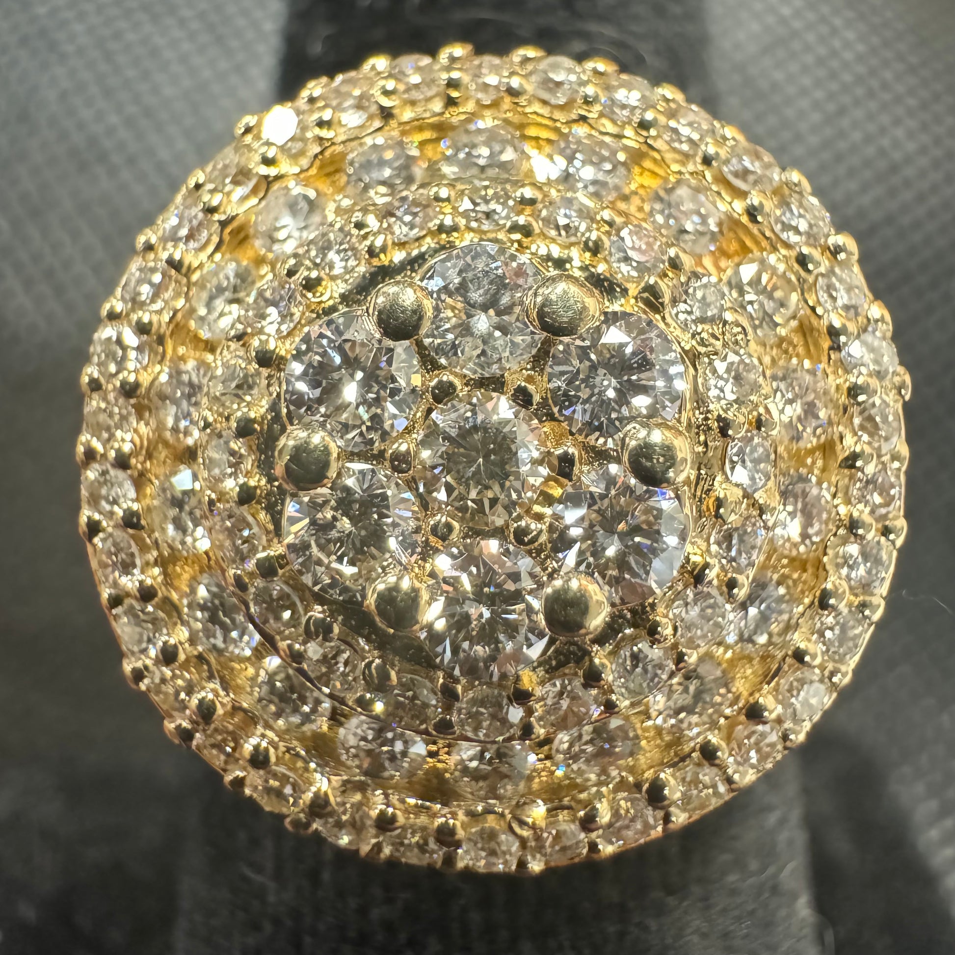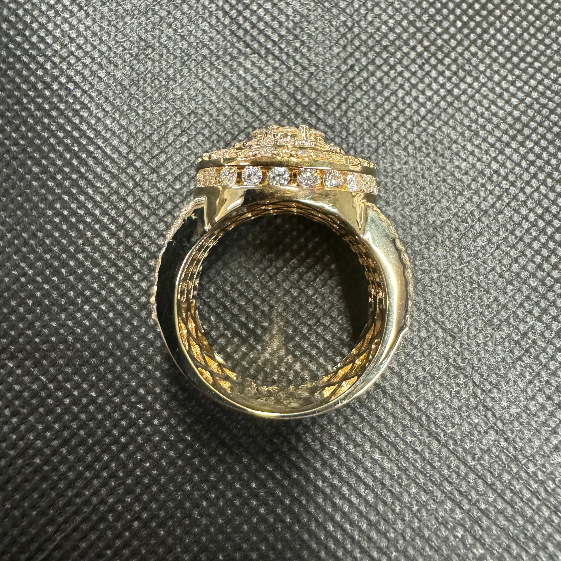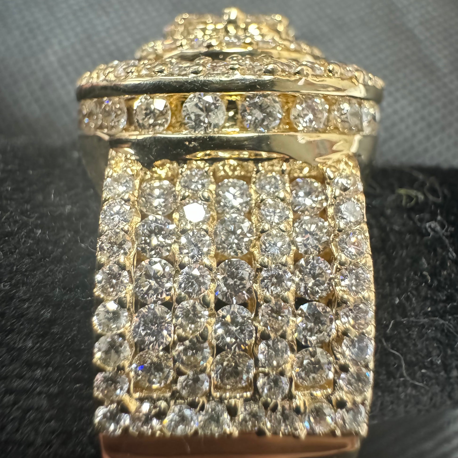 With a retail value of $6000 to $8000 this is an expertly crafted, all custom made, natural VS quality diamond flooded hip hop style championship ring that is priced on a dealer to dealer wholesale level. Very comfortable despite its heavyweight at 18.9g the inside of the ring has a webbed cage keeping the ring nice and stationary on the finger with a smooth and caressing feel. Made out of solid 14k high mirror polished yellow gold this piece has approximately 5.25ctw of natural diamonds all prong or channel set around almost every nook and cranny of the entire ring. Each diamond depending on which section is anywhere from .02ct up to .07ct each. Starting from the top down the main center cluster holds around .50ctw while the surrounding halos that step down from there as well as the channel set area around them each are set with .25ctw to .75ctw respectively. The chunky shanks of the ring hold approximately 1.0ctw on each side as the the thick bottom shank of the ring measures 12.5mm on the bottom side of the finger. Fitting just about perfect for a size:10.5 with a 20mm circumference for the outermost halo this ring is noticed anywhere you go, whether day or night, the diamonds shine like an old crystal chandelier either in person or on video. This is an outstanding piece of jewelry for an even better price that is even bigger, better, and brighter in person. A deal of the century don’t let it pass you by.