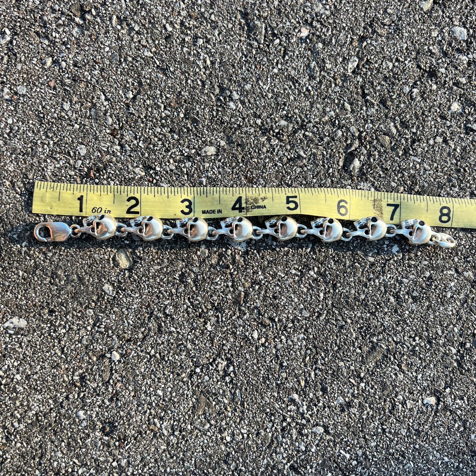 The puffed gucci link used in place as the end clasp is the M.V.P on this custom ghoulish skull bracelet. 50g of silver this heavy bracelet means business and isn’t for the faint of heart. The bracelet measures 8” in length but because of the thickness of each skull link being 9MM x 11MM it shortens it up a bit while it’s on your wrist bringing it to fit best at about 7.25”-7.5”