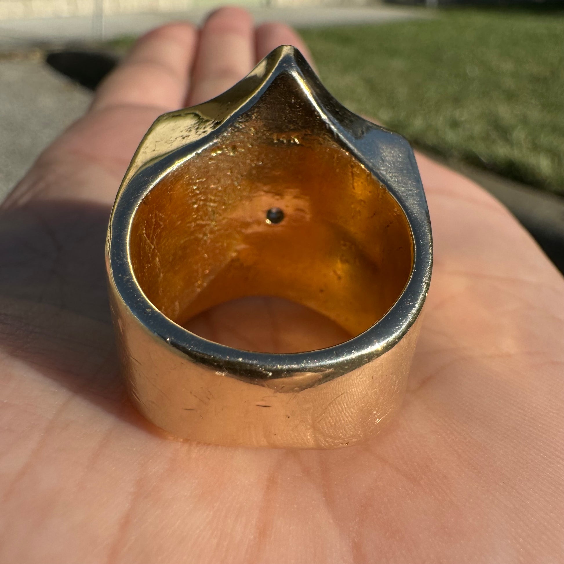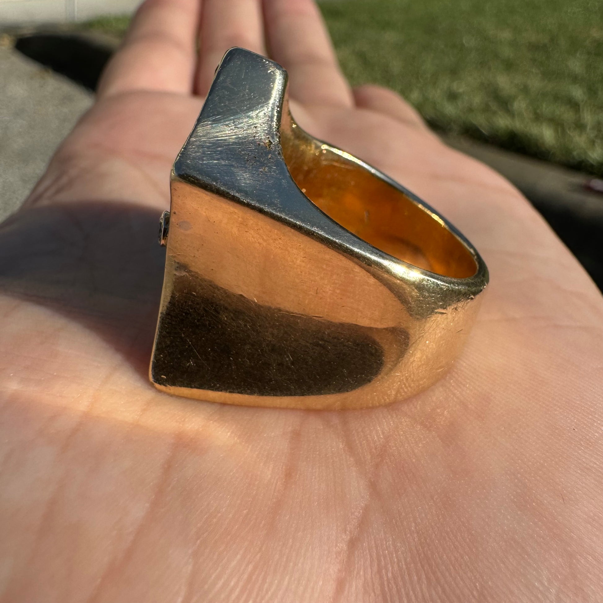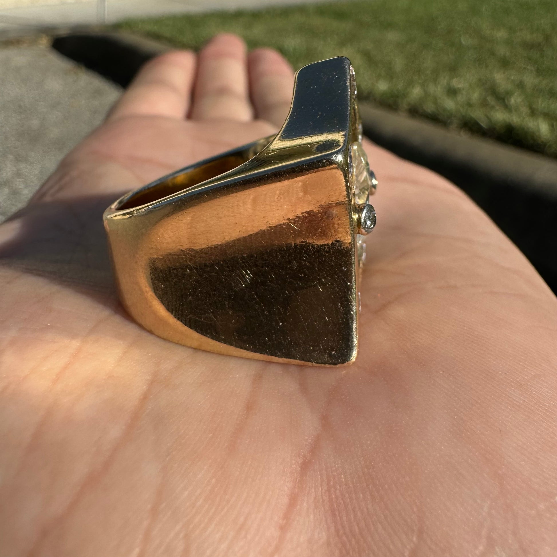 Talk about an excessive brick of gold, this is an investment piece with a whole lotta look at a fraction of the price. I bought this ring from a high end gambler who had it custom made while gambling out in Vegas. Weighing in at a stout 41.5g the center stone is Moissanite at approximately 6.0ct while the other 5 stones flush set inside of the ring and bezel set holding the Moissanite in place are all crisp and clean natural diamonds totaling up to approximately 1.25ctw. A size:9.5 despite its overly demanding size the ring is extremely comfortable and soft feeling while on the finger. Invest in something that not only you can wear but that will get drooled on by anybody trying to take a glance at it.