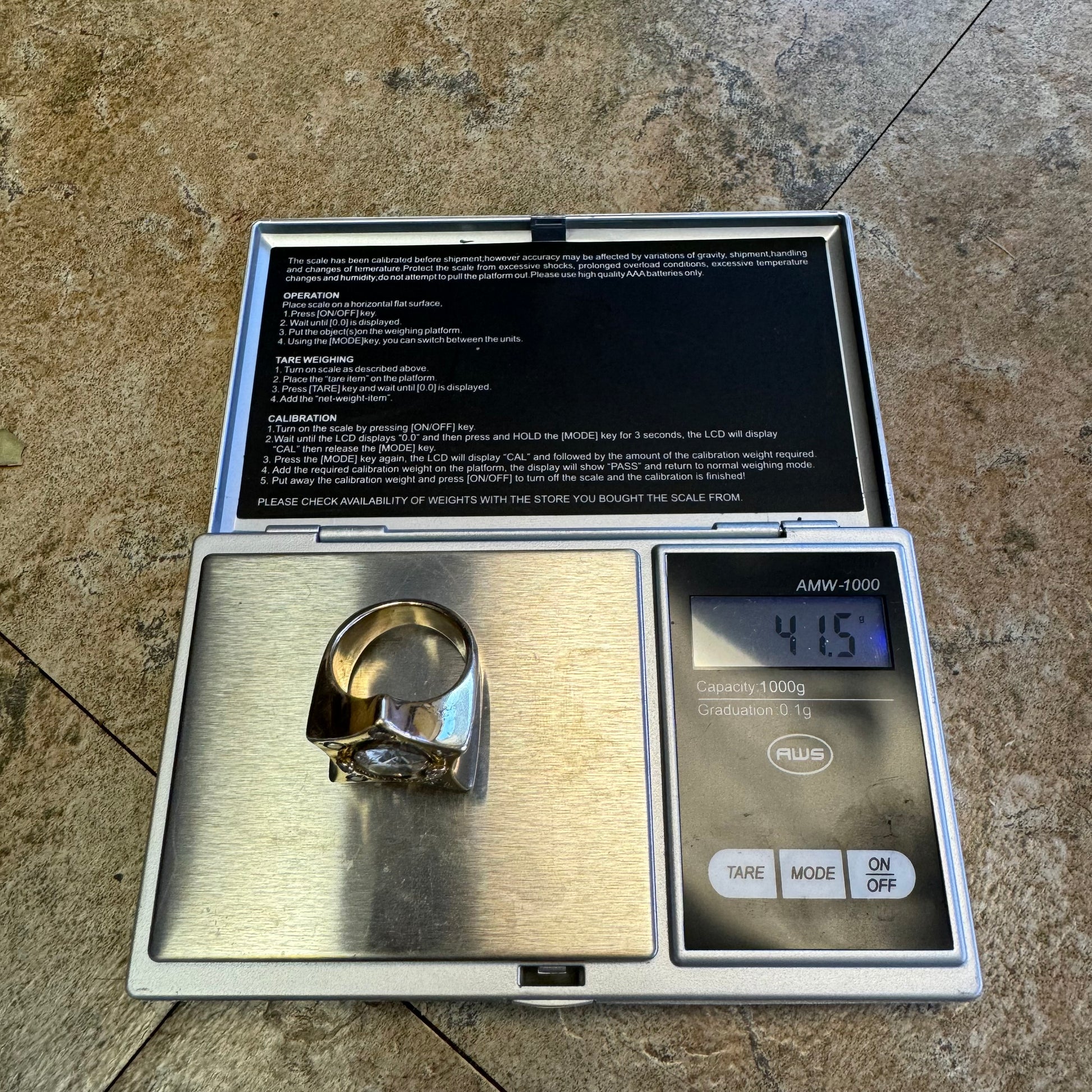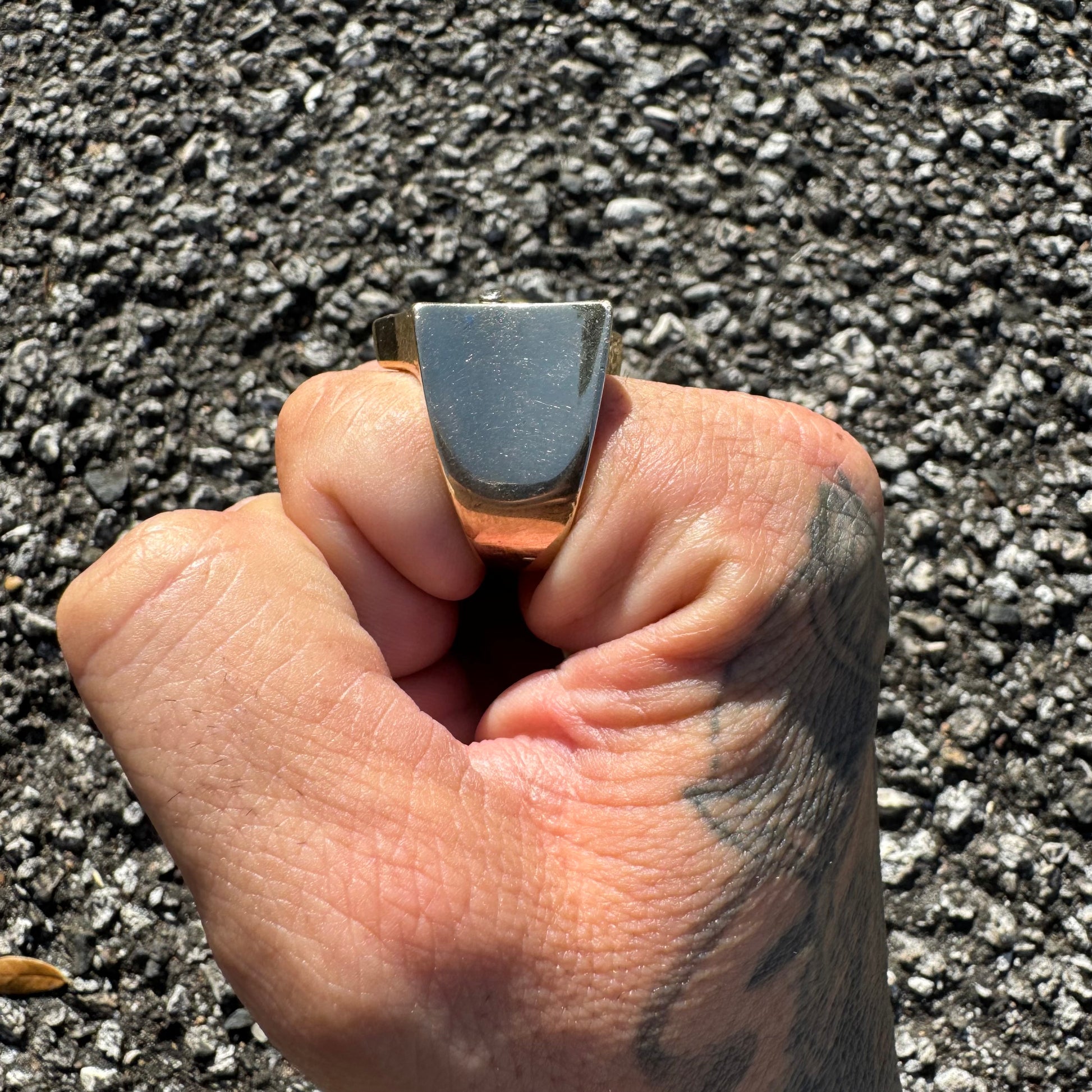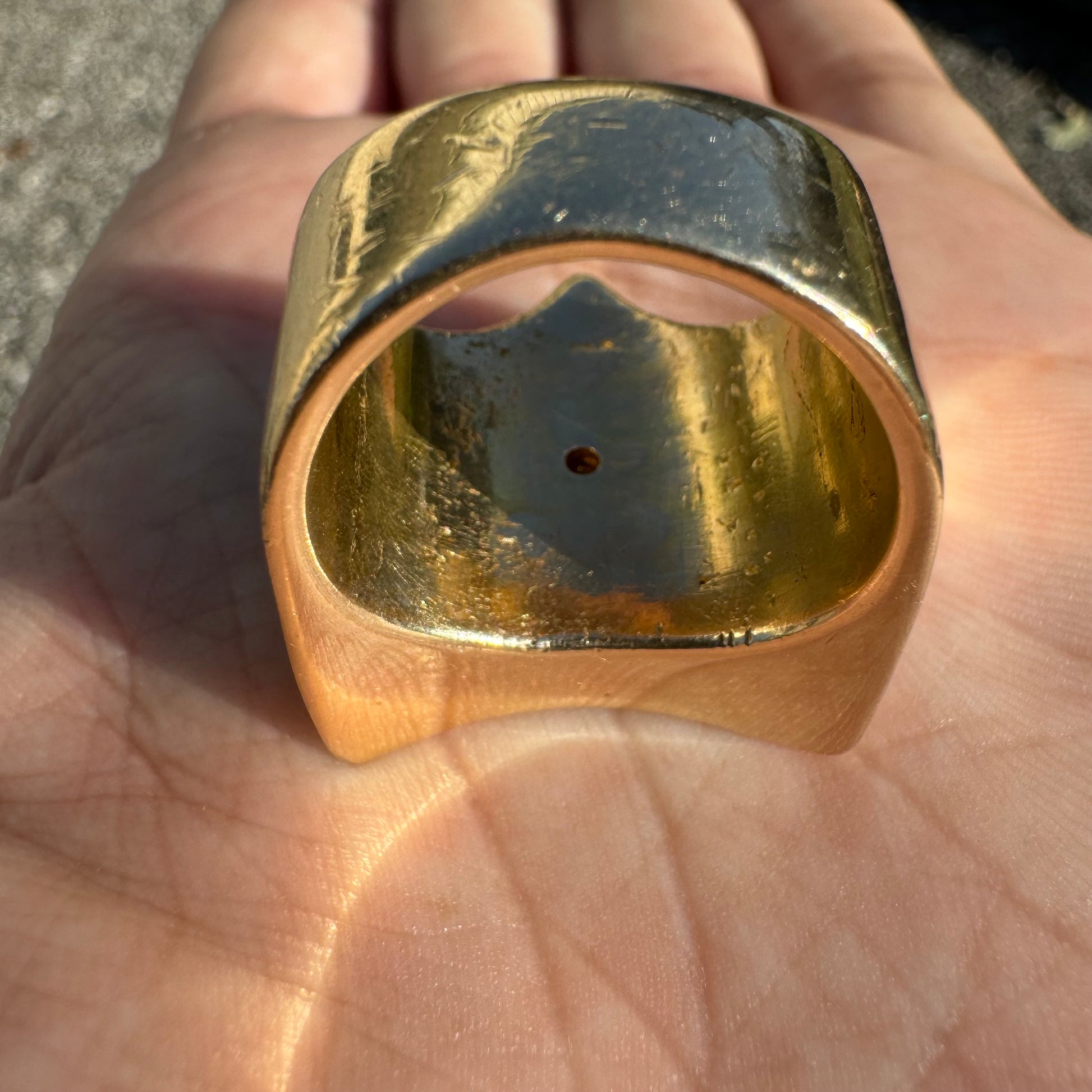 Talk about an excessive brick of gold, this is an investment piece with a whole lotta look at a fraction of the price. I bought this ring from a high end gambler who had it custom made while gambling out in Vegas. Weighing in at a stout 41.5g the center stone is Moissanite at approximately 6.0ct while the other 5 stones flush set inside of the ring and bezel set holding the Moissanite in place are all crisp and clean natural diamonds totaling up to approximately 1.25ctw. A size:9.5 despite its overly demanding size the ring is extremely comfortable and soft feeling while on the finger. Invest in something that not only you can wear but that will get drooled on by anybody trying to take a glance at it.