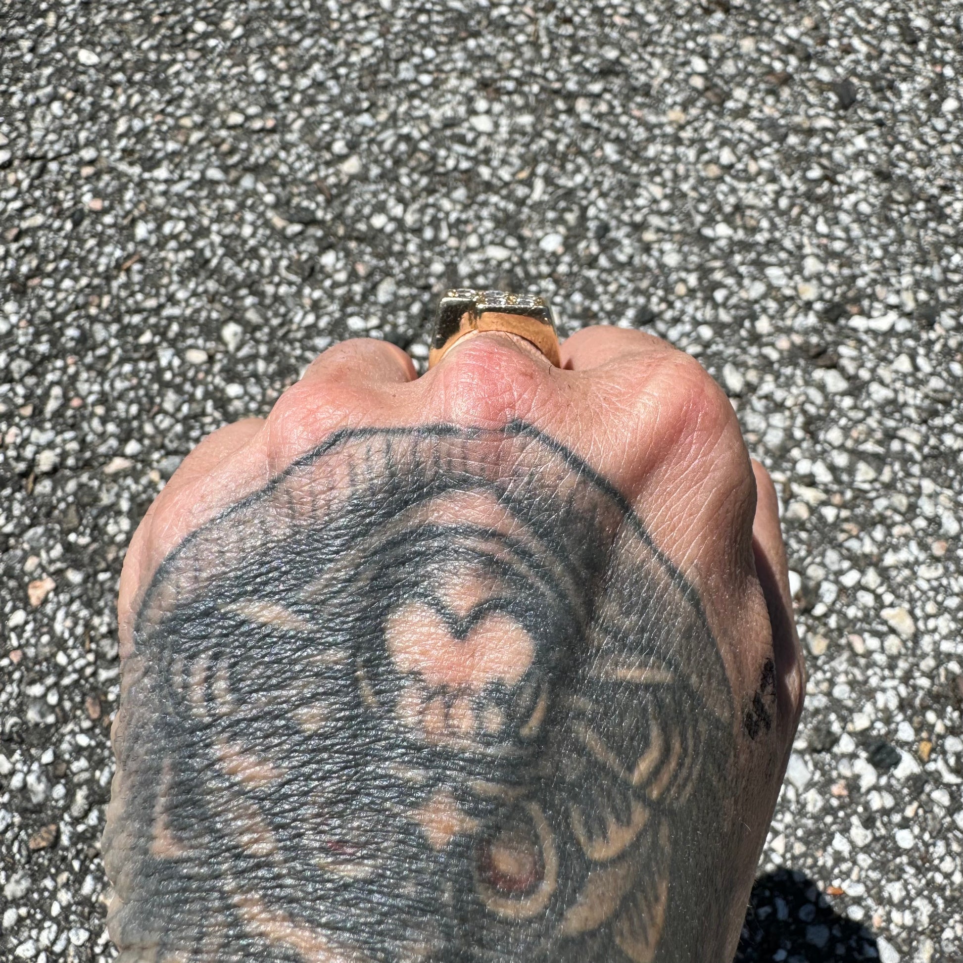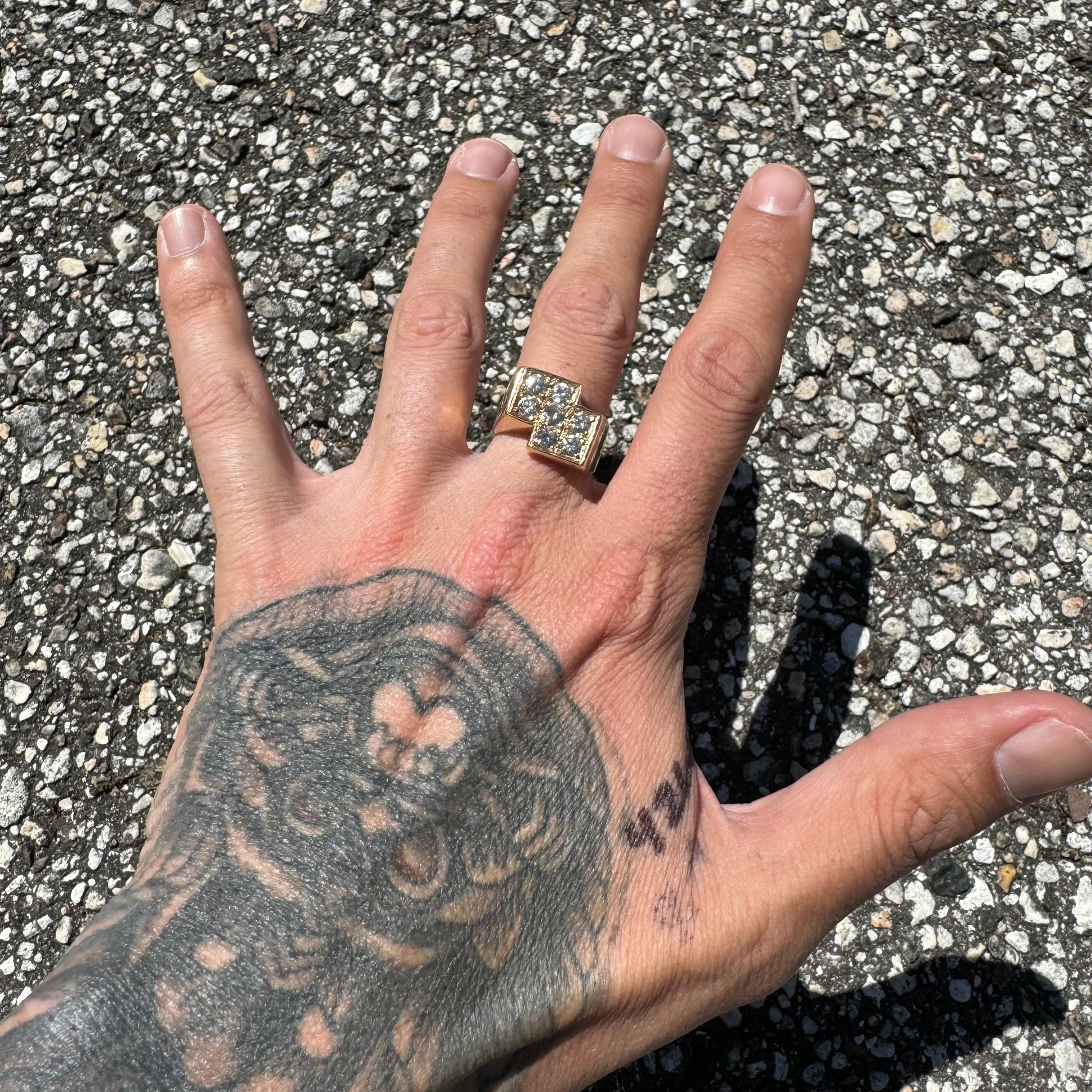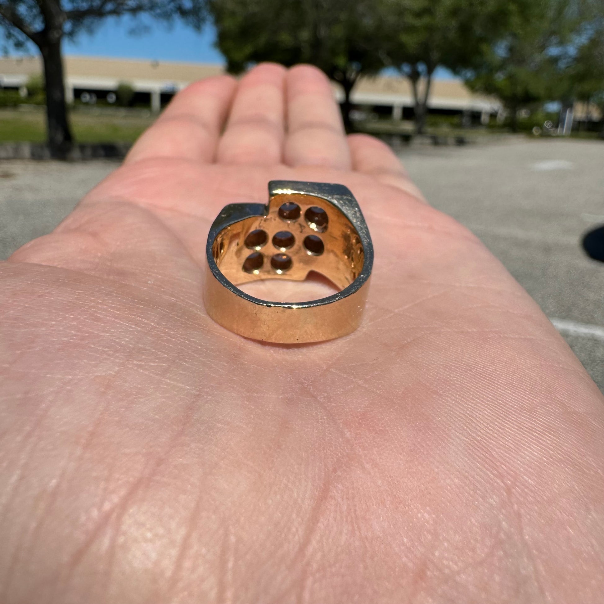 Meticulously custom made by hand is a beautiful heavy block of 14k yellow gold all solid backed with approximately 1.5ctw of prong set glowing natural VS Diamonds. Lucky number 7 in the gambling world with the center diamond totaling approximately .28ct and the other surrounding 6 stones at .22ct each. A heavy solid weight at 18g and a size:8 with a broad dimension perched on top of the finger at just about 15mm. This is a truly gangster ring. Whether you like to gamble or want to bring good luck your way this is the ring to do it while it sparkles along the way.