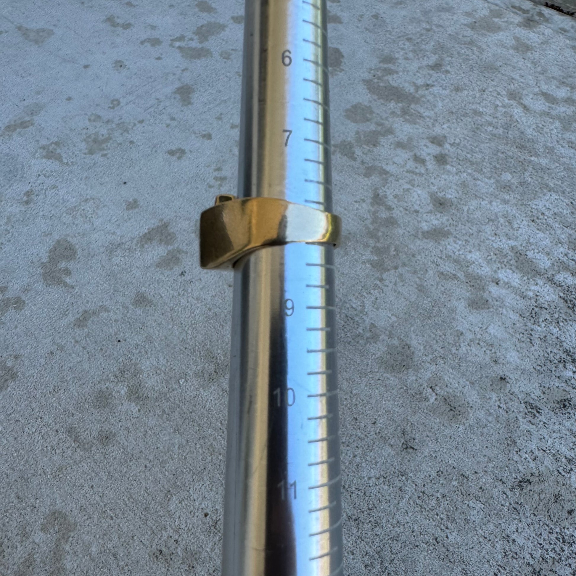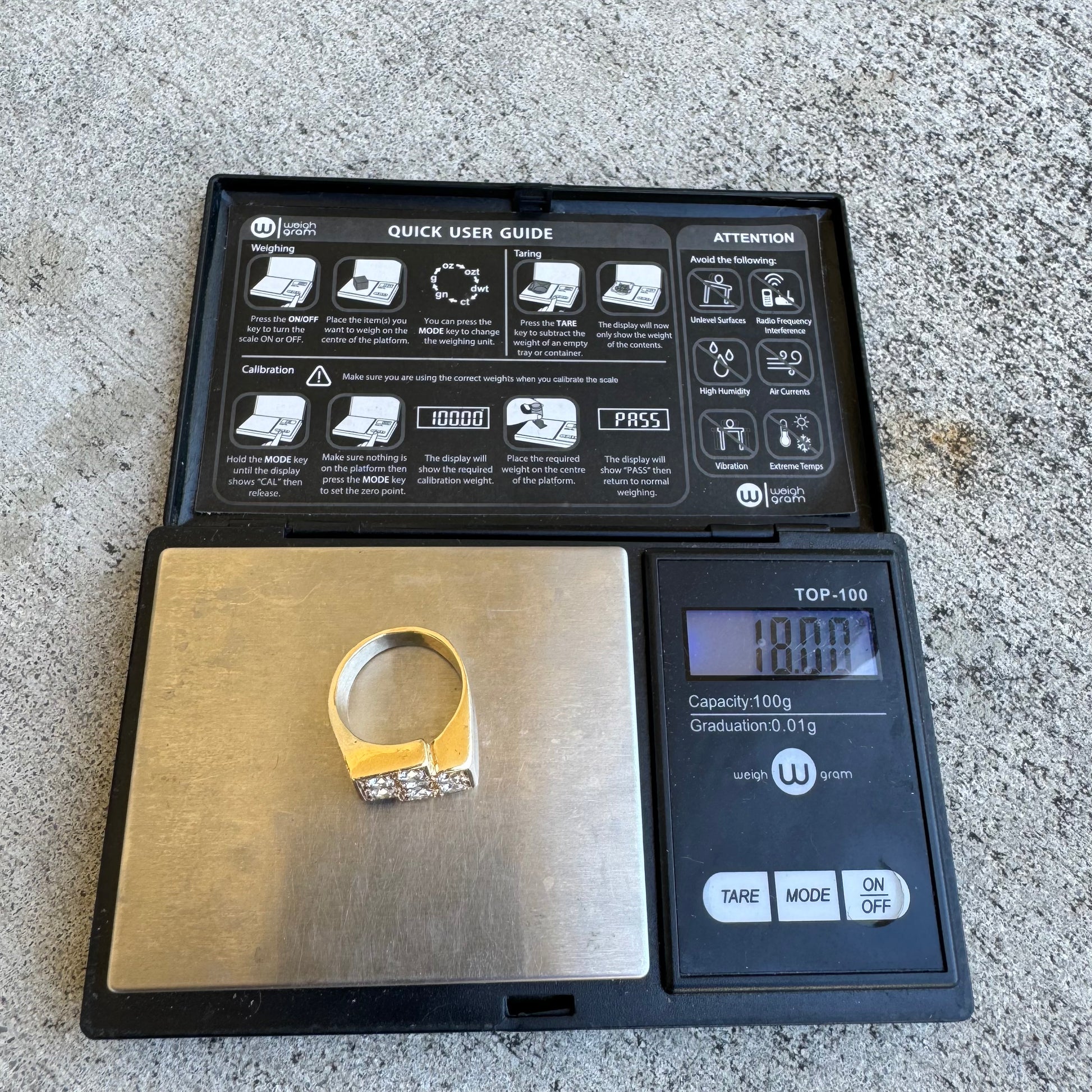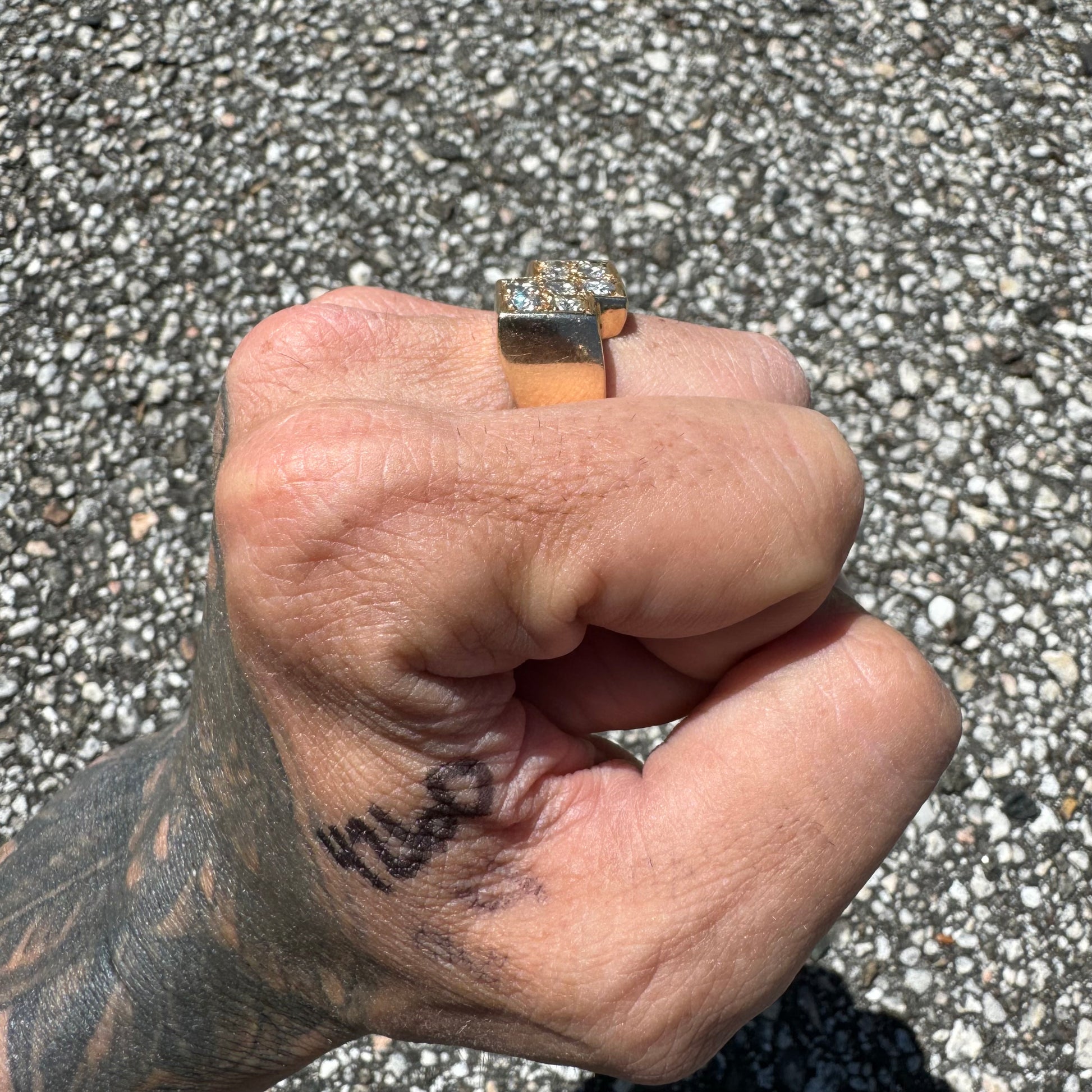 Meticulously custom made by hand is a beautiful heavy block of 14k yellow gold all solid backed with approximately 1.5ctw of prong set glowing natural VS Diamonds. Lucky number 7 in the gambling world with the center diamond totaling approximately .28ct and the other surrounding 6 stones at .22ct each. A heavy solid weight at 18g and a size:8 with a broad dimension perched on top of the finger at just about 15mm. This is a truly gangster ring. Whether you like to gamble or want to bring good luck your way this is the ring to do it while it sparkles along the way.