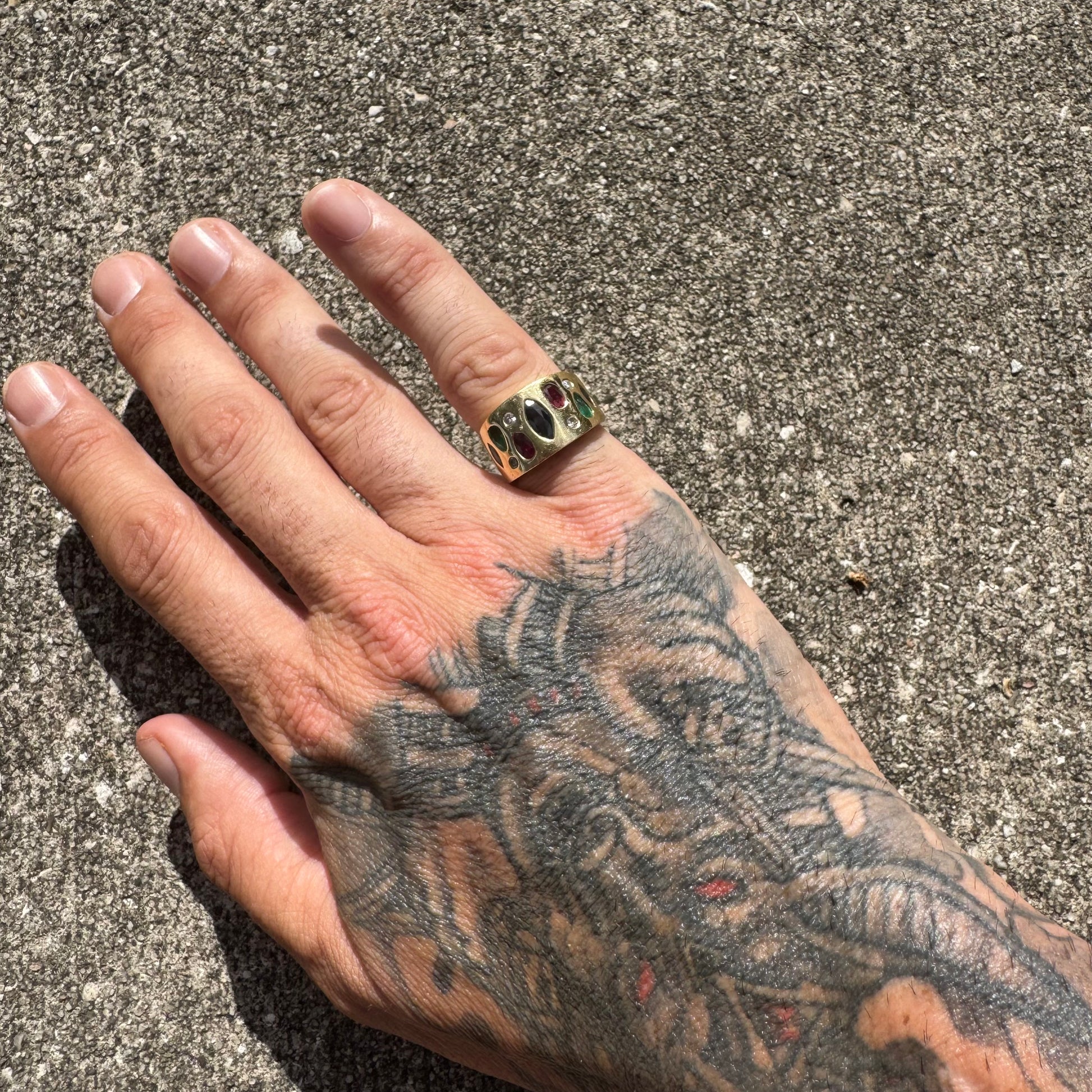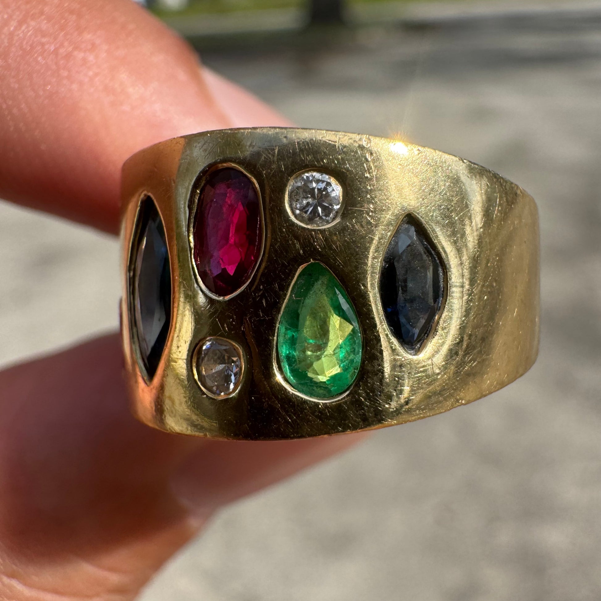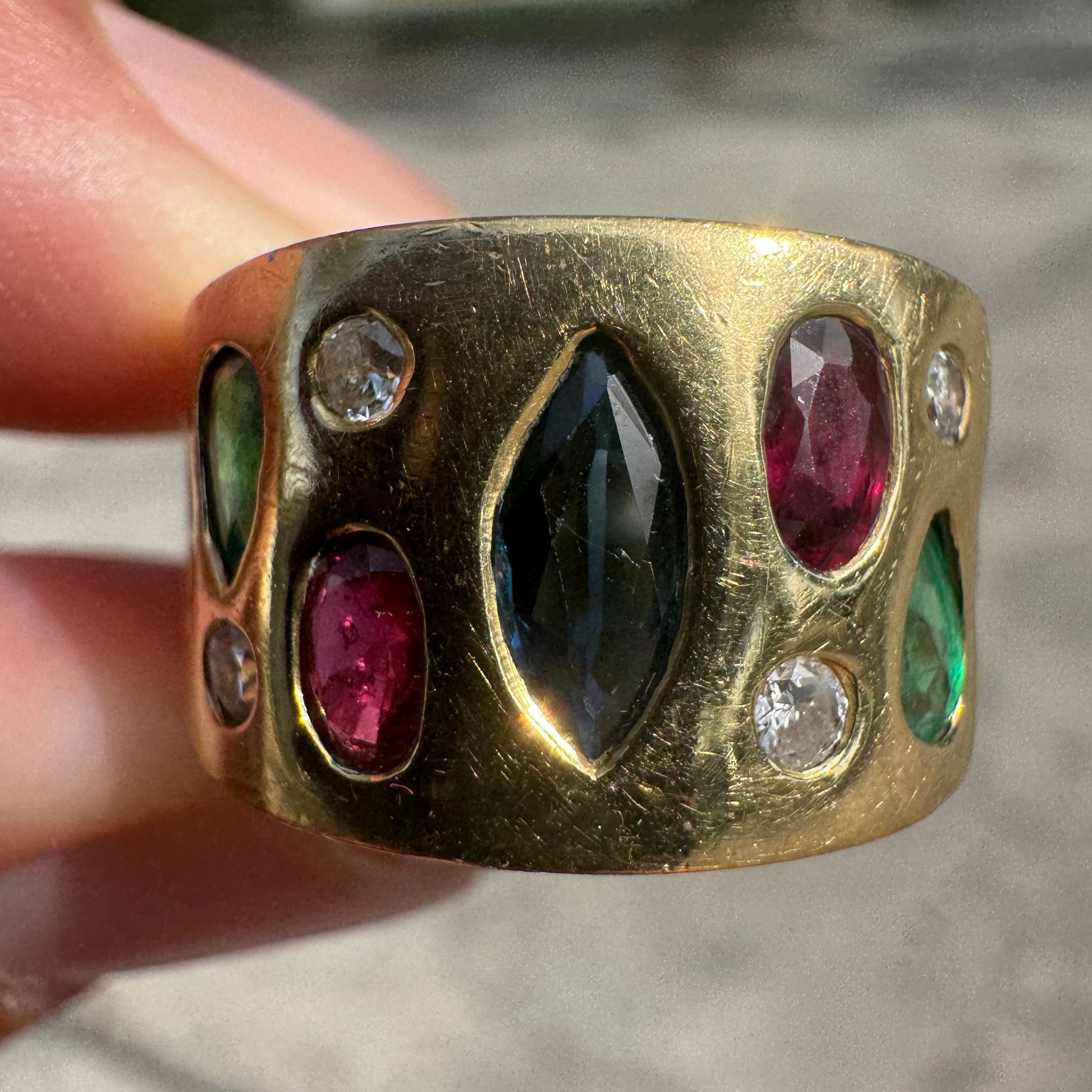 Absolutely stunning with full attention to detail and the best quality of materials were used in crafting this ring. Vivid and vibrant colors shine through clearly on all the natural gemstones flushed set throughout this solid 18k yellow gold tapered cigar band. Starting with the center and sides are 3 marquise cut natural blue sapphires (1.15CTW) that is flanked by 2 oval cut natural rubies (.50ctw) followed by 2 pear cut natural emeralds (.50ctw) and surrounded by all natural diamonds (.20ctw). A very prominent and wide stance on top of the finger at 12mm as it tapers down to the bottom underside at 6mm and weighs in at a hefty weight of 10.3g and a size:7. You would have to pay at least double the price to have an established jeweler buy these materials and custom make this exact ring again.