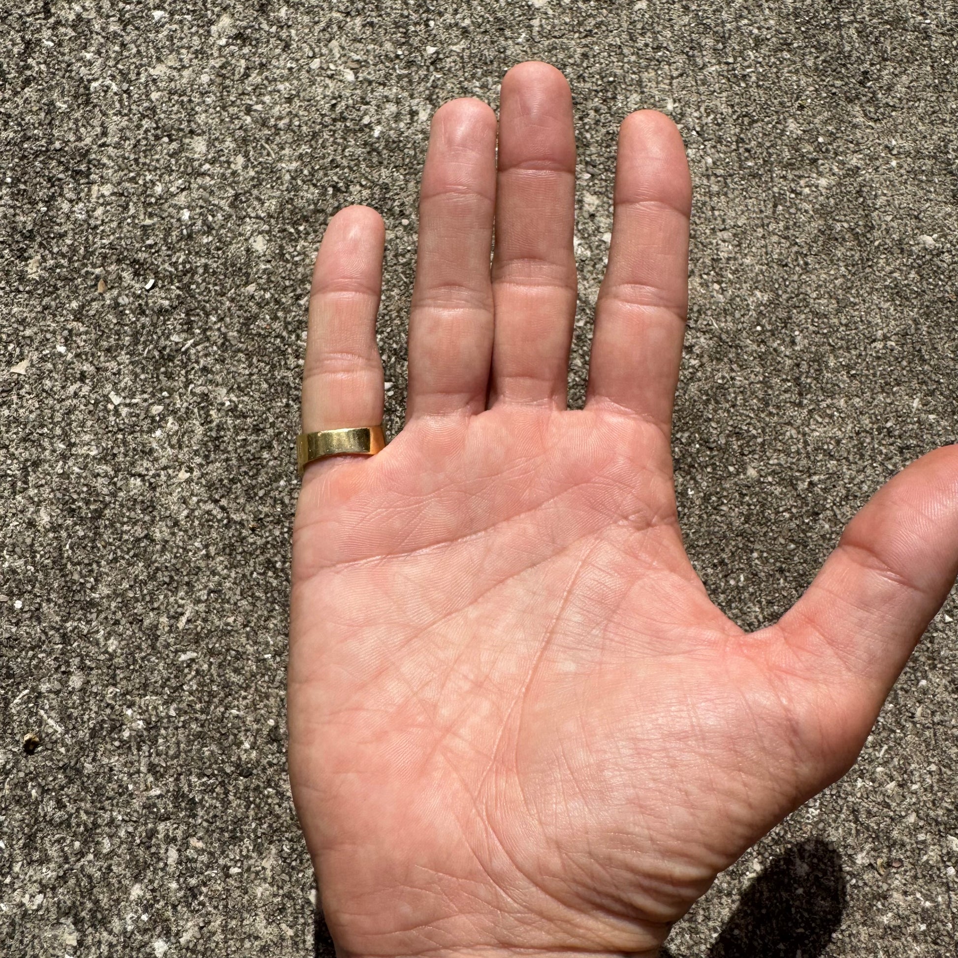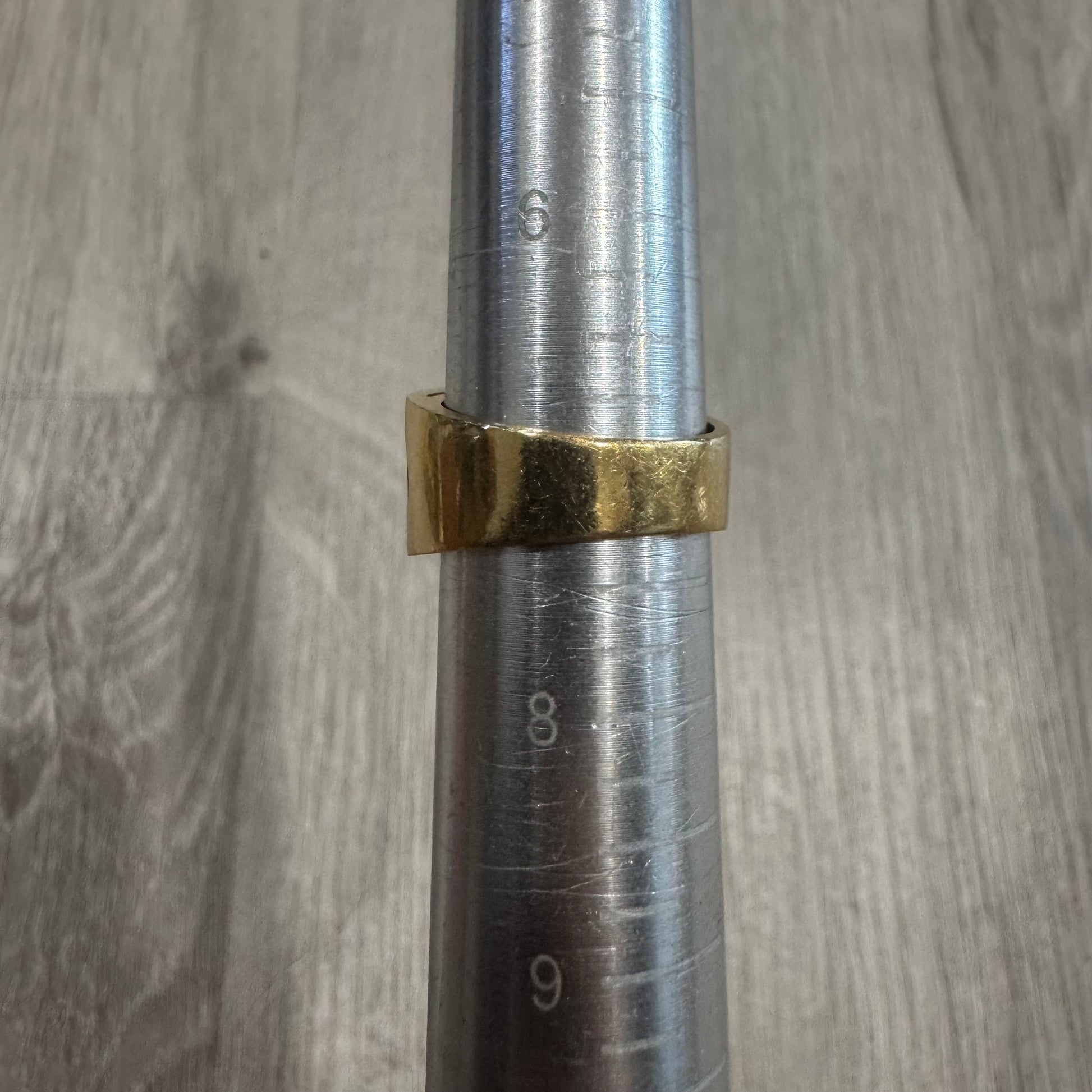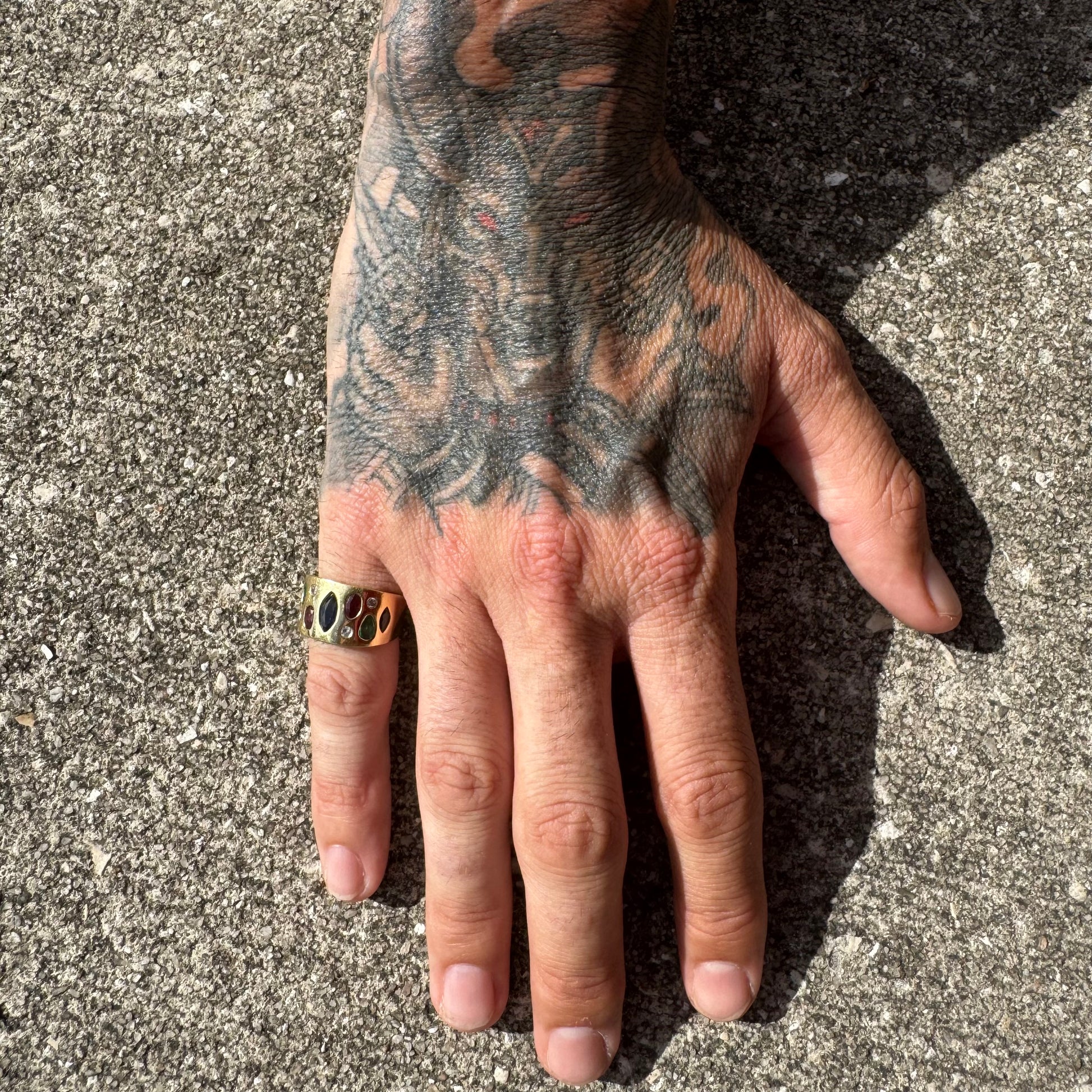 Absolutely stunning with full attention to detail and the best quality of materials were used in crafting this ring. Vivid and vibrant colors shine through clearly on all the natural gemstones flushed set throughout this solid 18k yellow gold tapered cigar band. Starting with the center and sides are 3 marquise cut natural blue sapphires (1.15CTW) that is flanked by 2 oval cut natural rubies (.50ctw) followed by 2 pear cut natural emeralds (.50ctw) and surrounded by all natural diamonds (.20ctw). A very prominent and wide stance on top of the finger at 12mm as it tapers down to the bottom underside at 6mm and weighs in at a hefty weight of 10.3g and a size:7. You would have to pay at least double the price to have an established jeweler buy these materials and custom make this exact ring again.