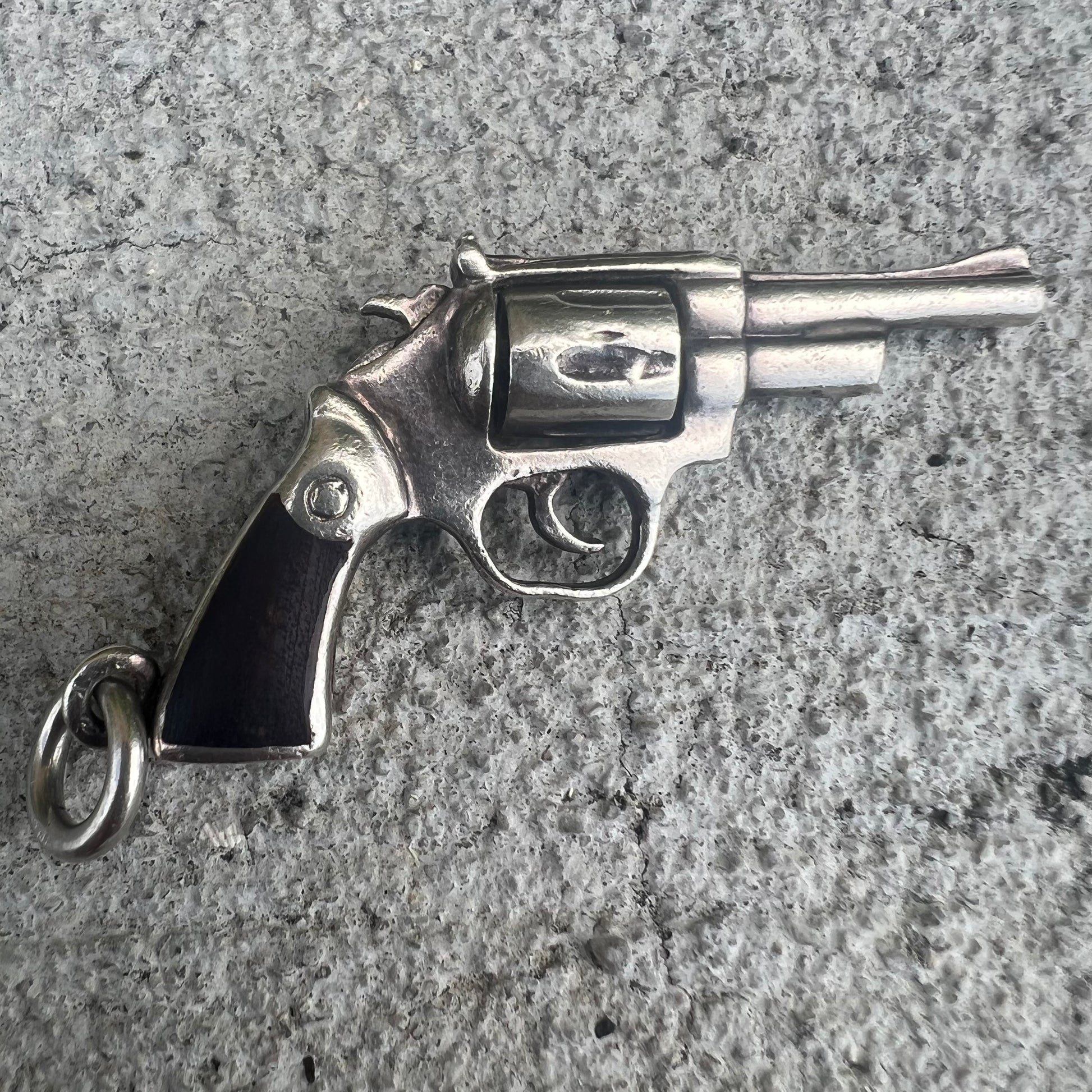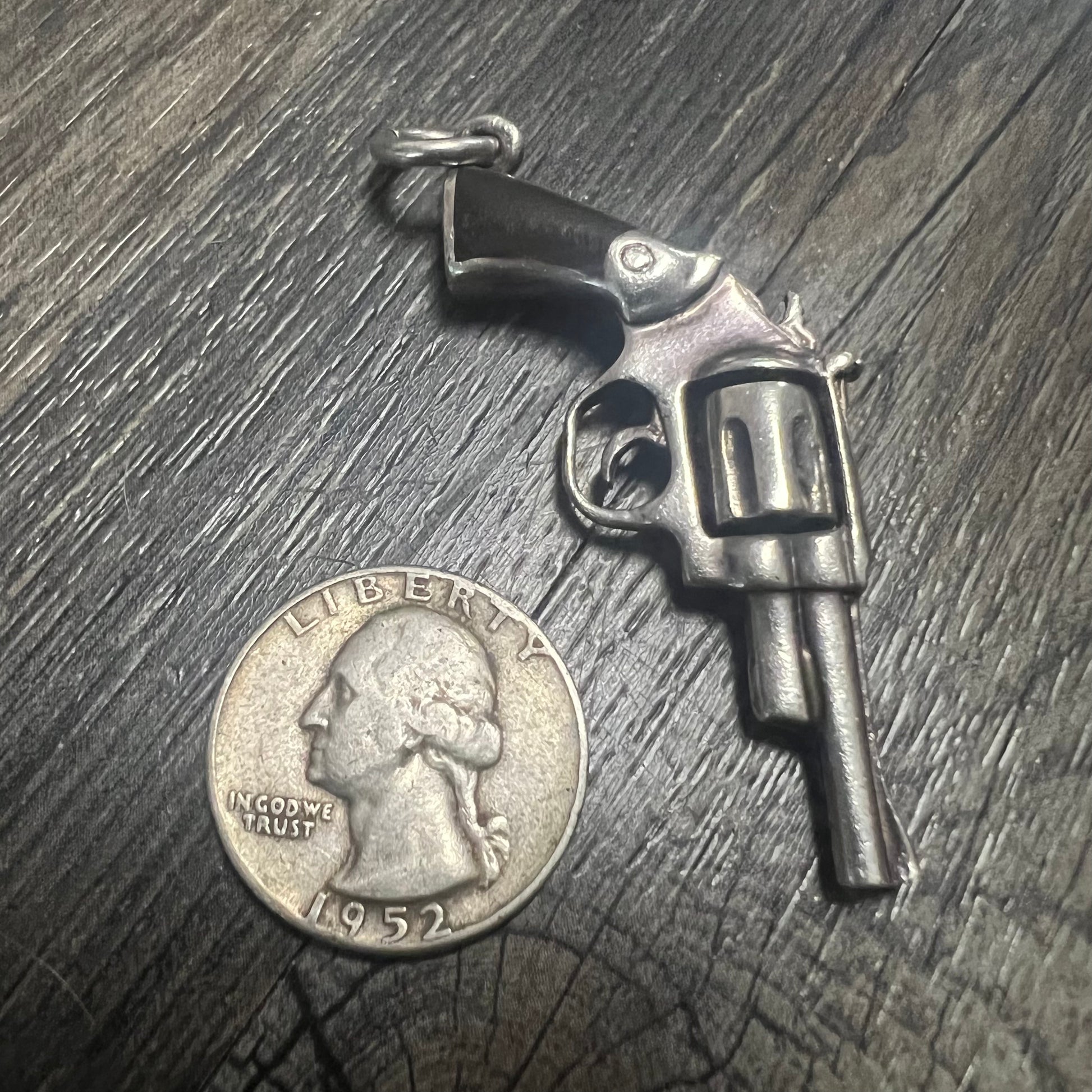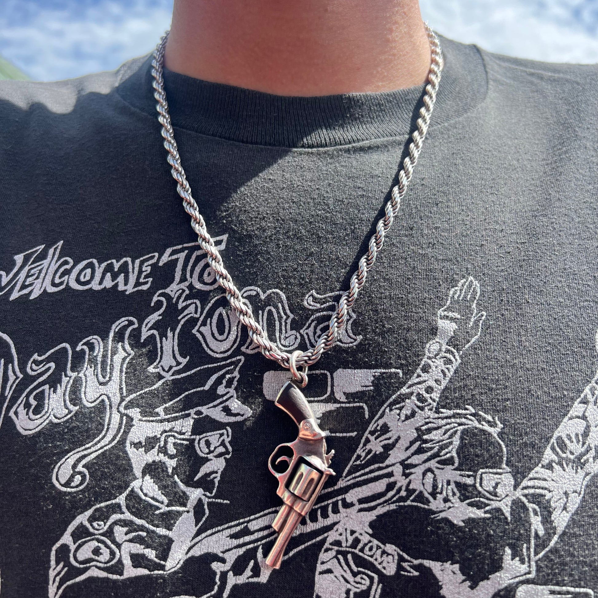 One of the best hand made silver pendants I’ve ever had. Articulating spinning barrel of the revolver all the way down to the inlaid Ebony wood handle. It took real time and craftsmanship to make a piece like this and make it this detailed and life like to scale. Included in this purchase is a solid sterling/.925 Italian made Diamondcut heavy and thick rope chain measuring 22” by 5MM. The size of the chain is exactly the perfect size and weight to go along with this pendant and that’s why they are being sold together.