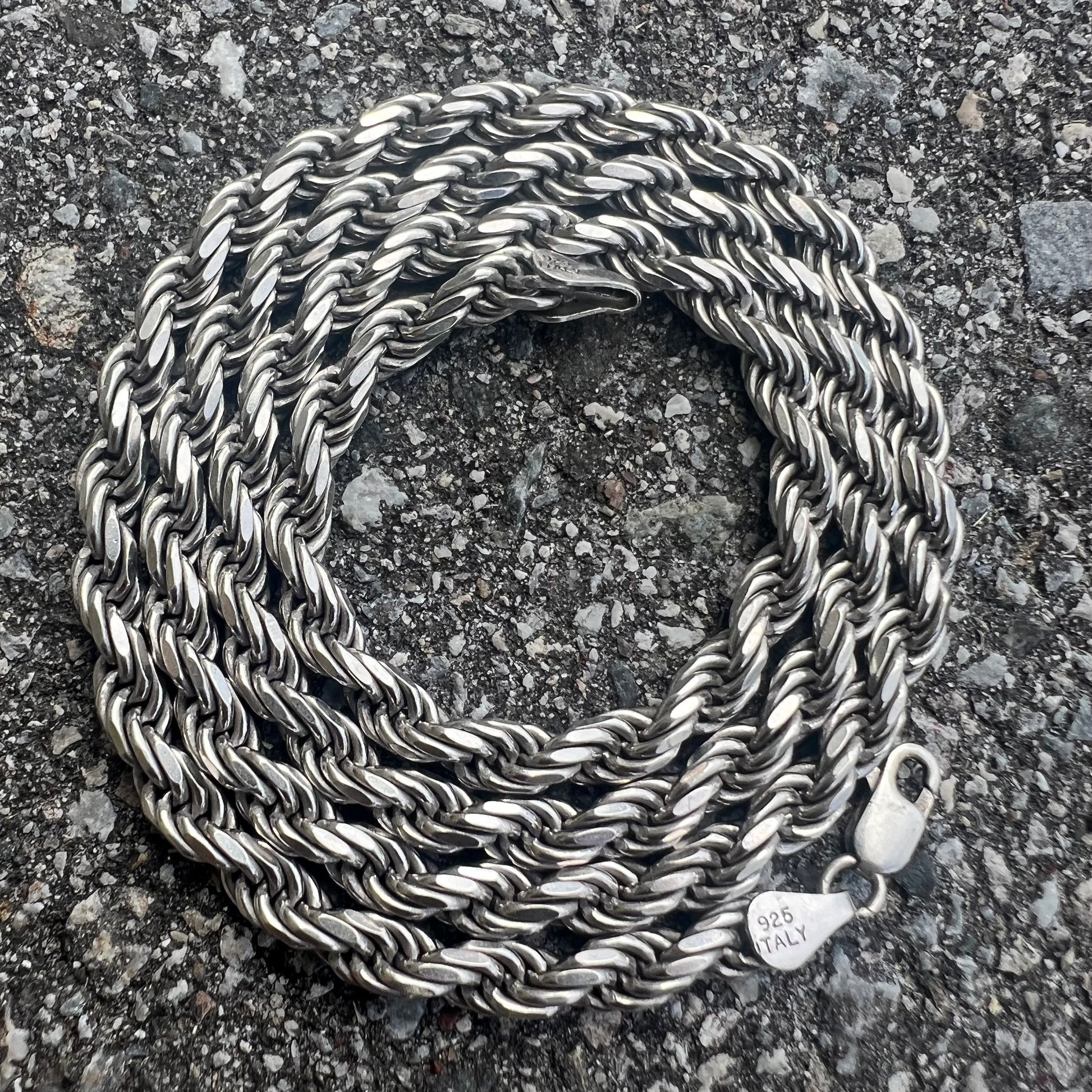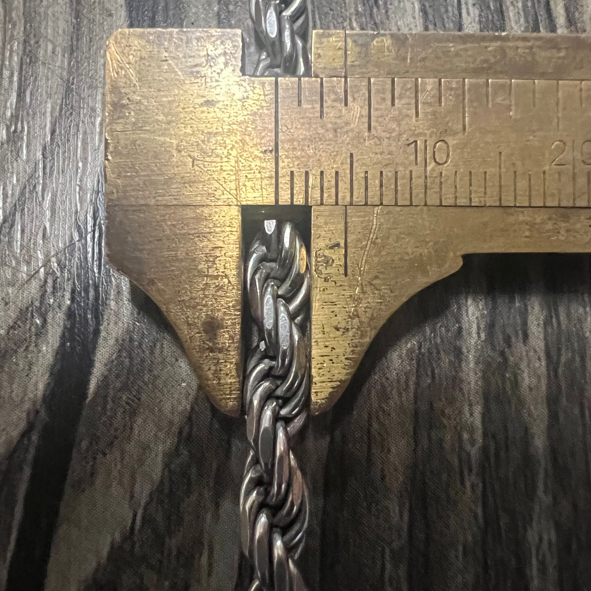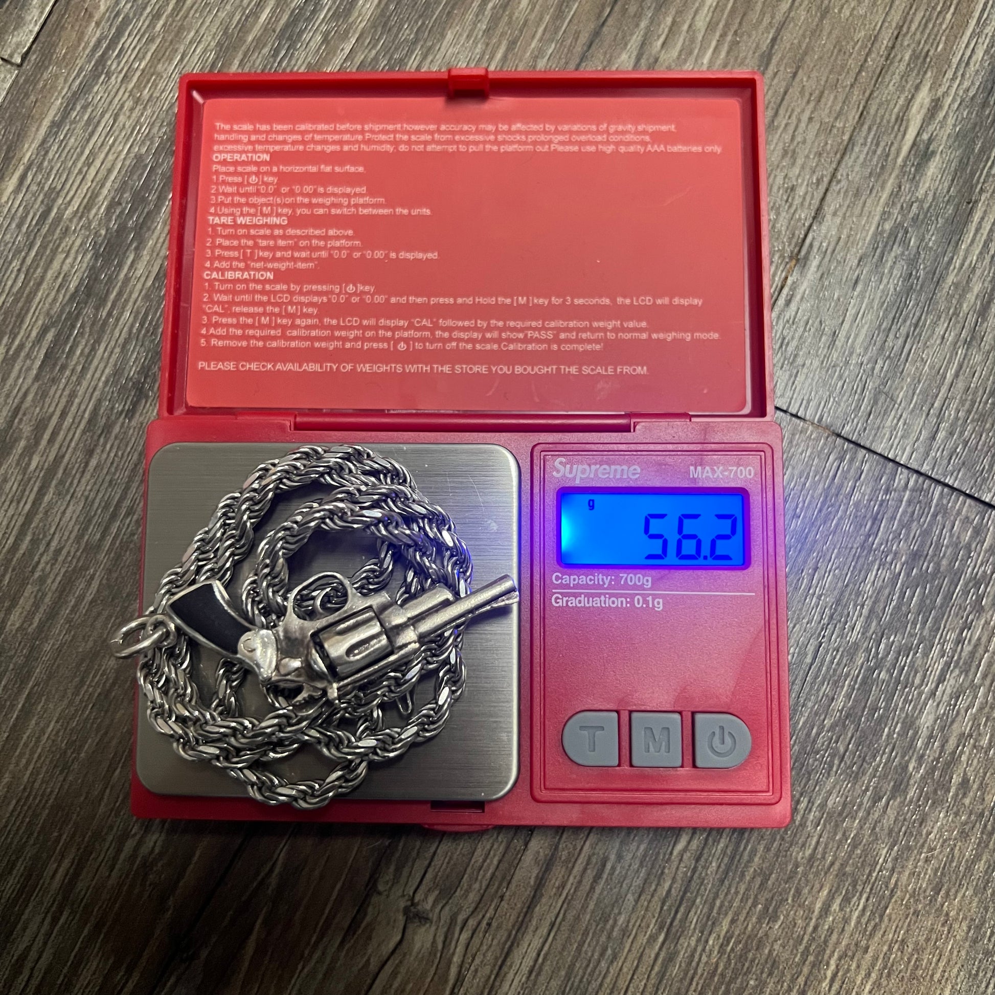One of the best hand made silver pendants I’ve ever had. Articulating spinning barrel of the revolver all the way down to the inlaid Ebony wood handle. It took real time and craftsmanship to make a piece like this and make it this detailed and life like to scale. Included in this purchase is a solid sterling/.925 Italian made Diamondcut heavy and thick rope chain measuring 22” by 5MM. The size of the chain is exactly the perfect size and weight to go along with this pendant and that’s why they are being sold together.