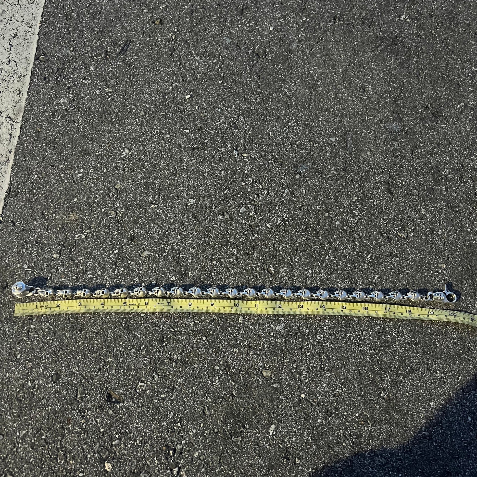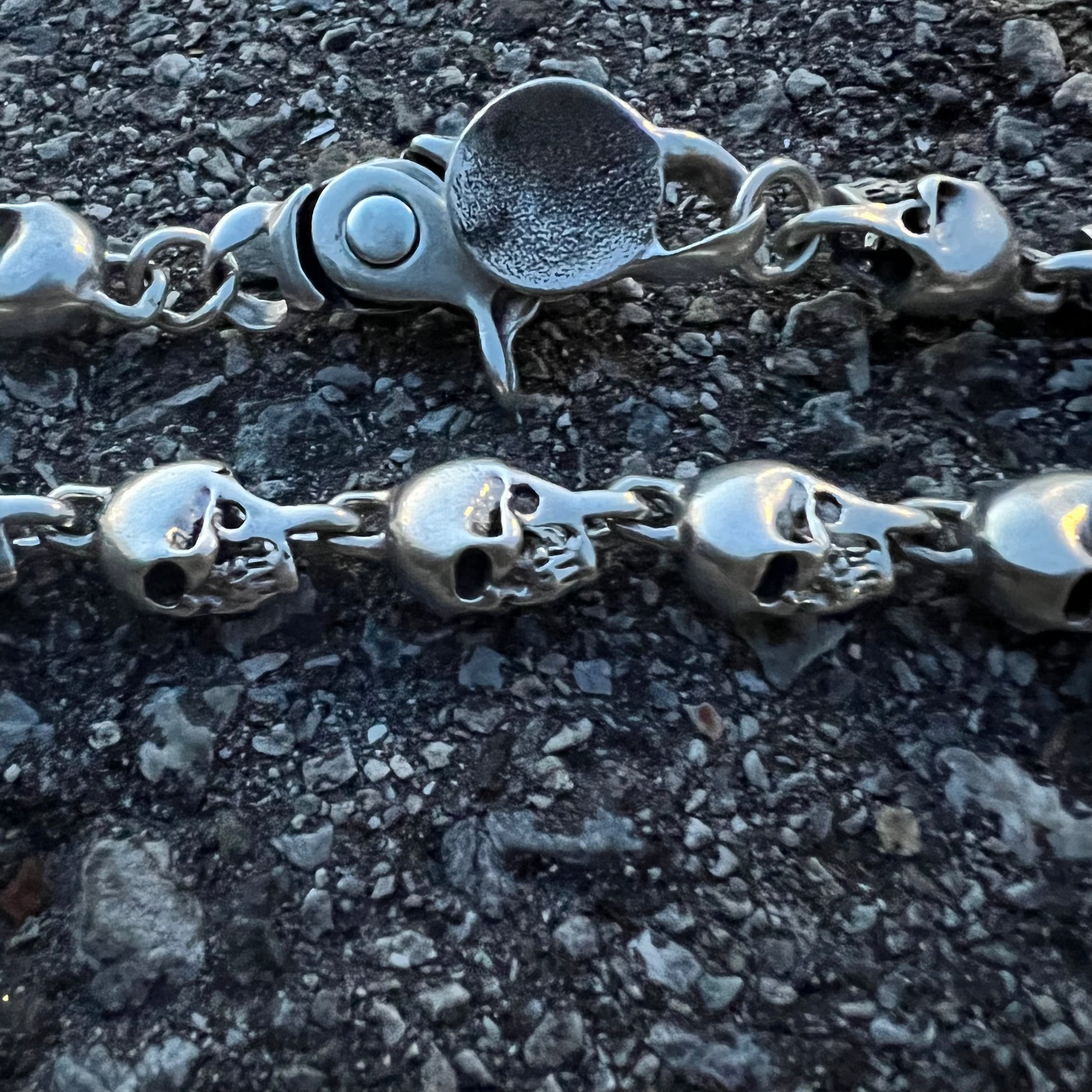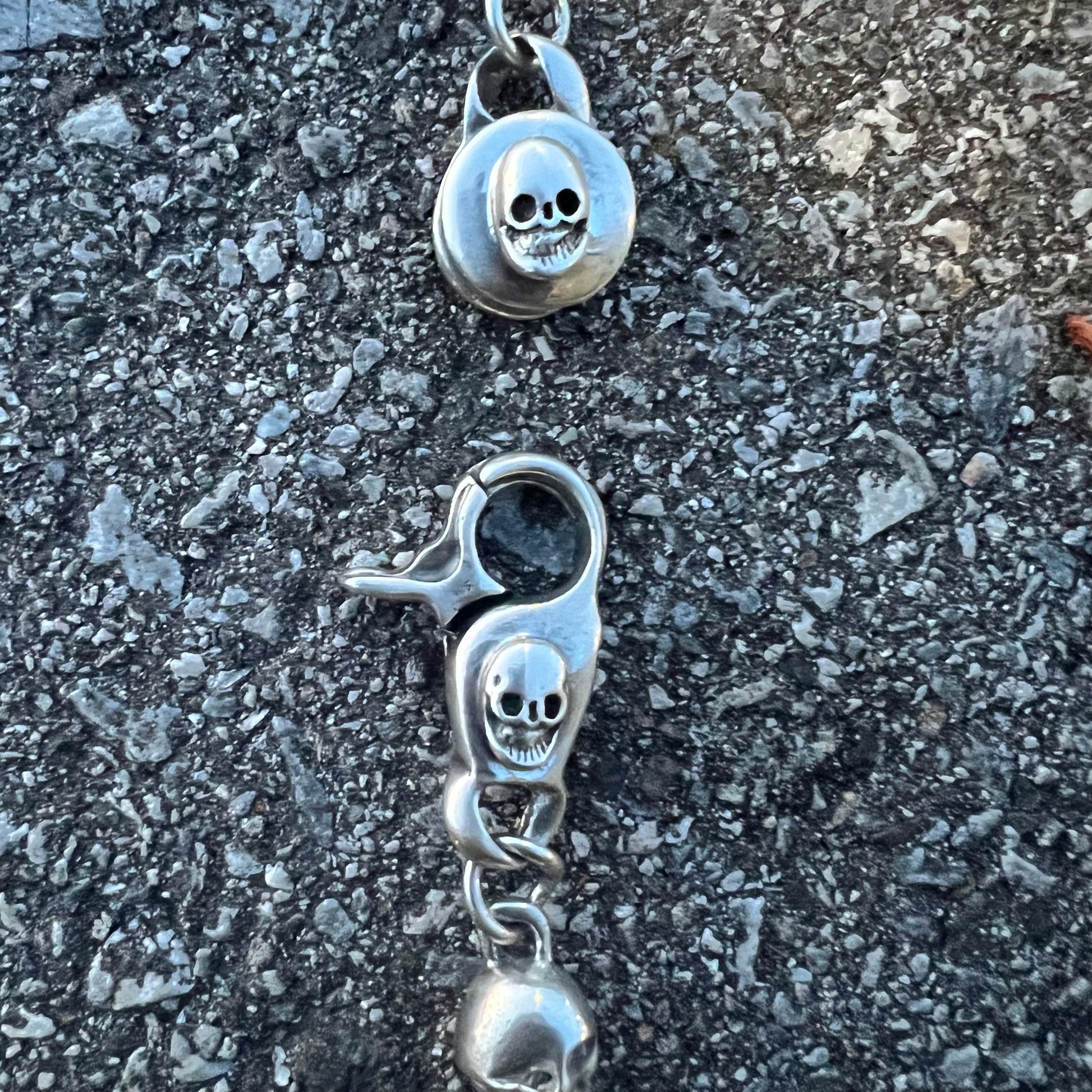 Really should not even need to say this but with the squeeze hook style toggle clasp with adorned skulls it’s a wrap, the showstopper. Casted one by one with solid .925 silver the skulls are hand pieced together. This one weighs the neck down a bit at 140g and really shows anyone looking at you who’s boss. 20” in length with the width of the skulls at 9MM X 12mm. This is the skull chain to end all skull chains at an even more affordable price.
