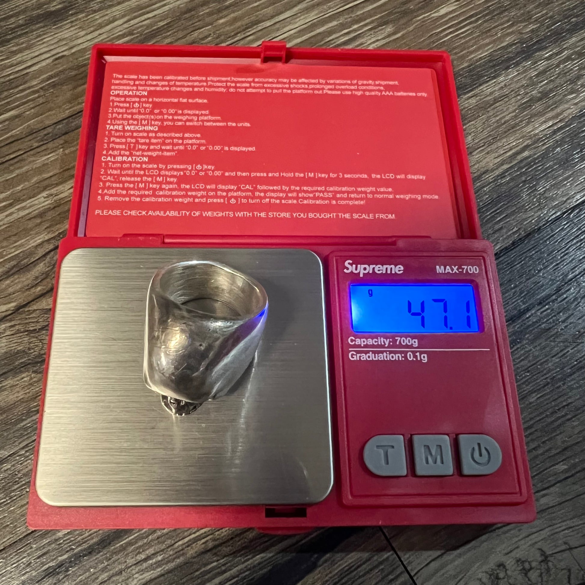 This Goliath of a ring weighs in at just under 50g. This was custom made here in the USA with premium materials and craftsmanship. Not your average ring that you will be able to just go and buy in any store. If you’re looking for a top of the line and special ring with a nasty look to it this is the one. Size:11.5