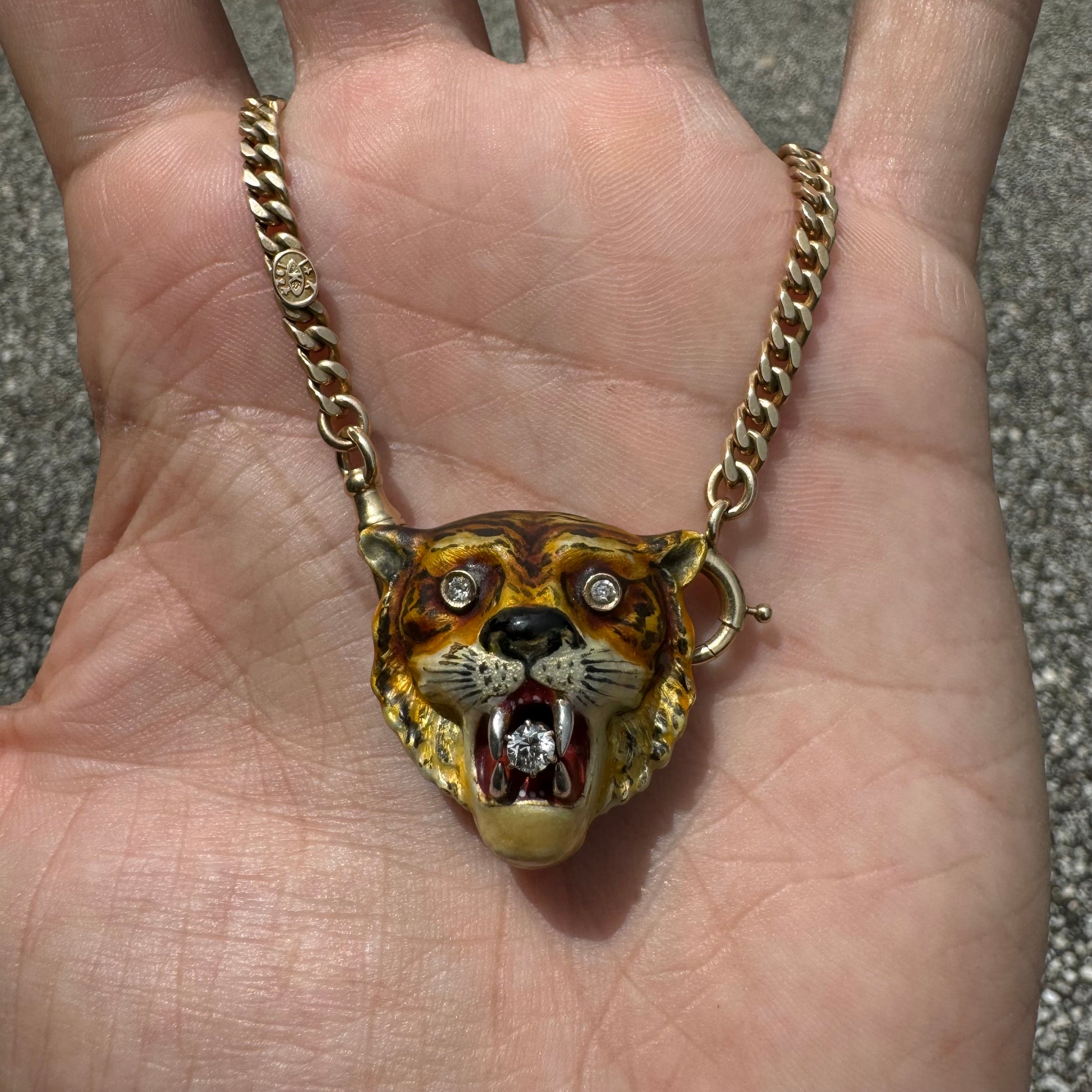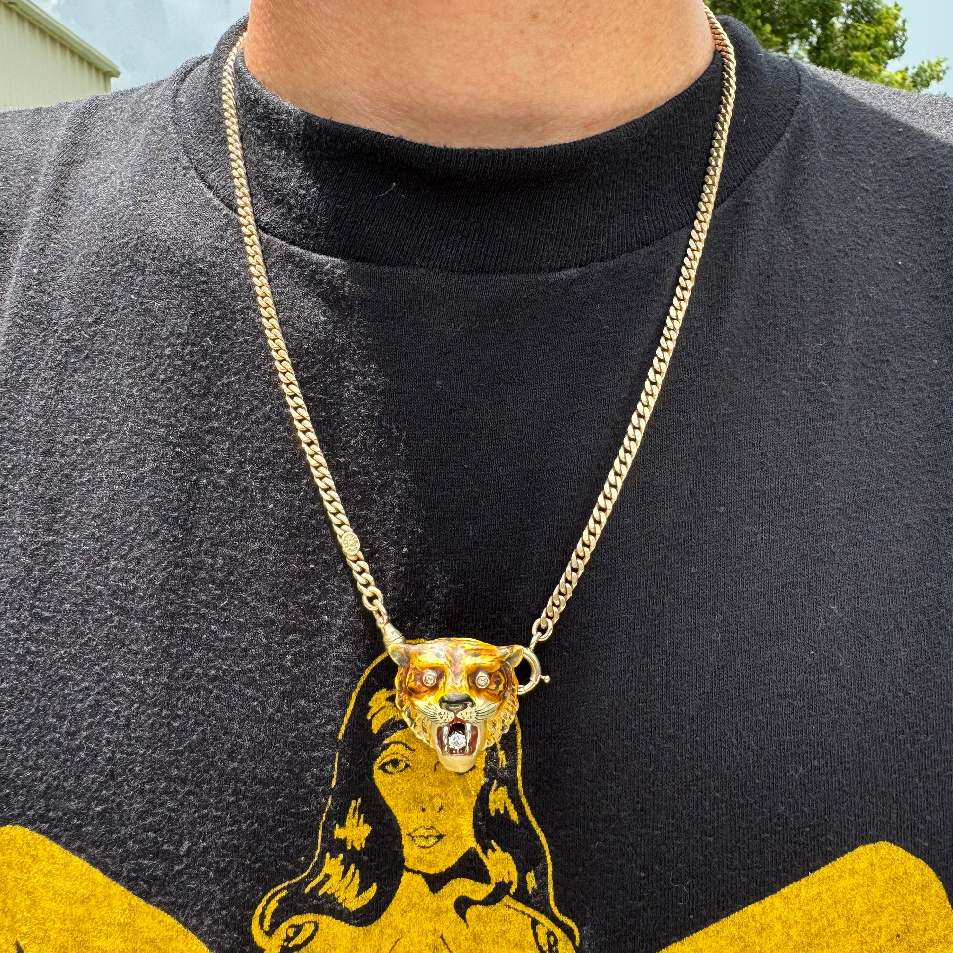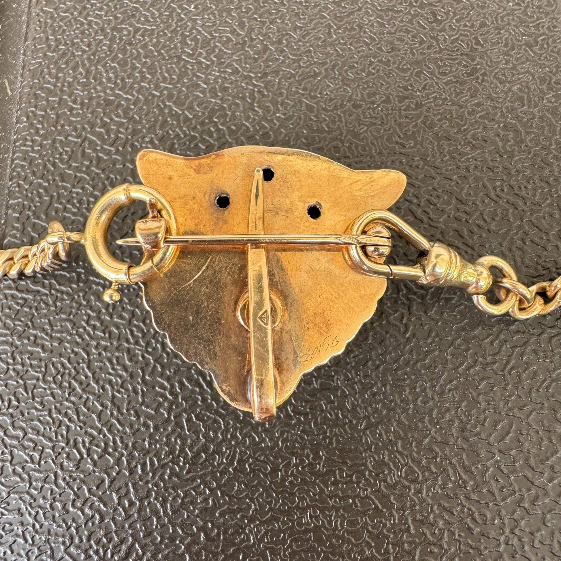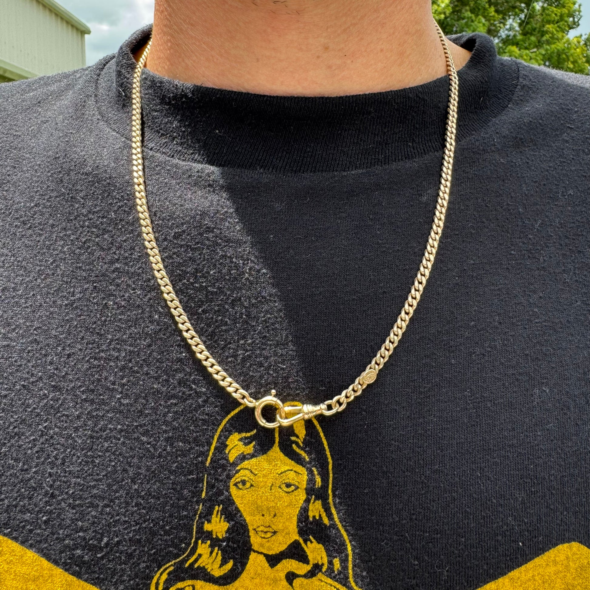 By far the best antique watch chain you can ask for encompassed with everything you need all in one. Any jewelry nerd loves a good hallmark and better yet a hallmarking with dates. Dated 1924 this is an above average and hard to find length at approximately 21.5” with the most sought after link style for any classic watch chain seeker as this is a Cuban style curb link. Nice and chunky at 3.5mm by 2mm, all solid and hefty at 26.77g these necklaces have so many suited dual purposes. Pictured here I have shown just a few ways to style this piece whether it be the straight forward classic way or the most common is with the original dog clip and spring ring clasp shown hanging down and in front either With a pendant or without. If you choose to wear this with pendants you can add them to either the dog clip side or the spring ring side as shown and best of all you can convert any pin or brooch to be worn by connecting the hardware to each end of the pin back allowing it to be worn as a pendant. After years of hunting I can assure you it’s extremely hard to find the perfect watch chain as they are either too short or too long, too thin or the wrong karat, a boring link style or something just too intricate. This one has everything you need for the perfect watch chain necklace as you can see for yourself.