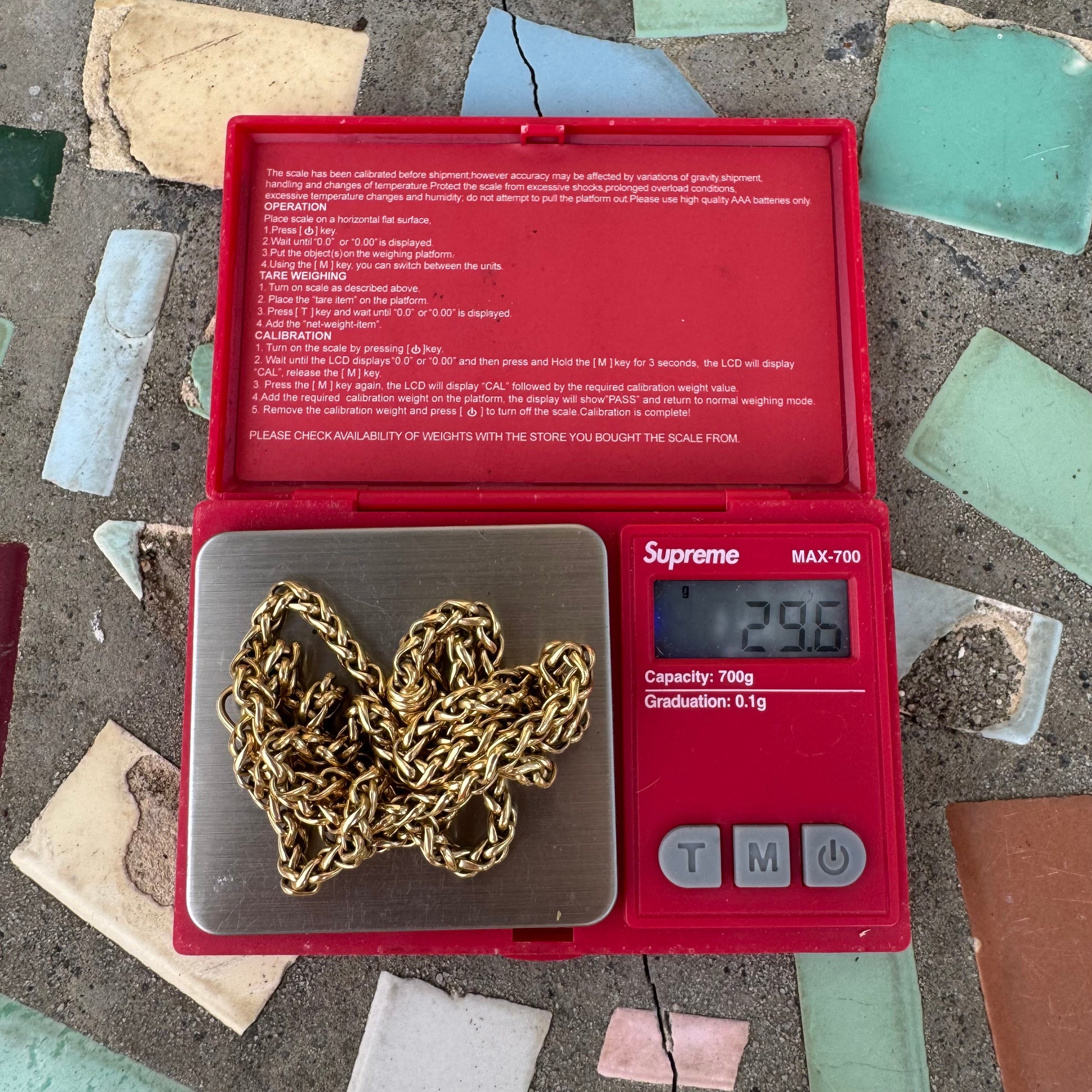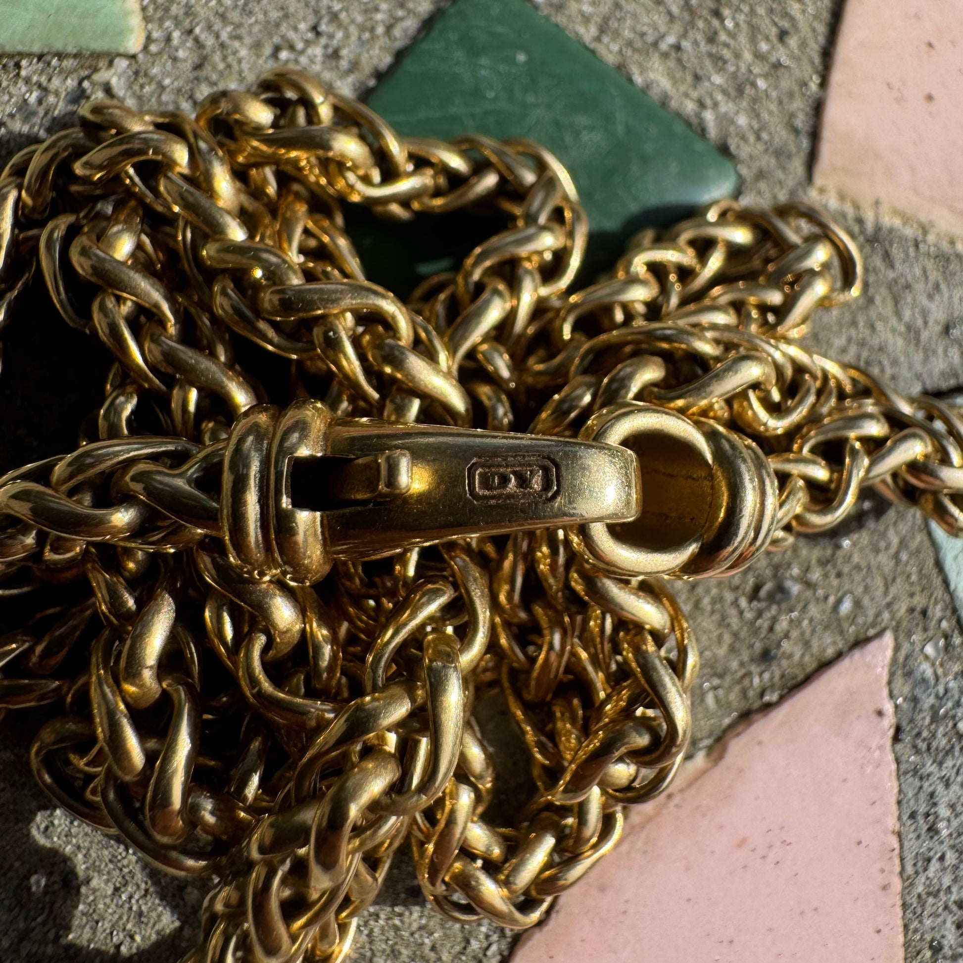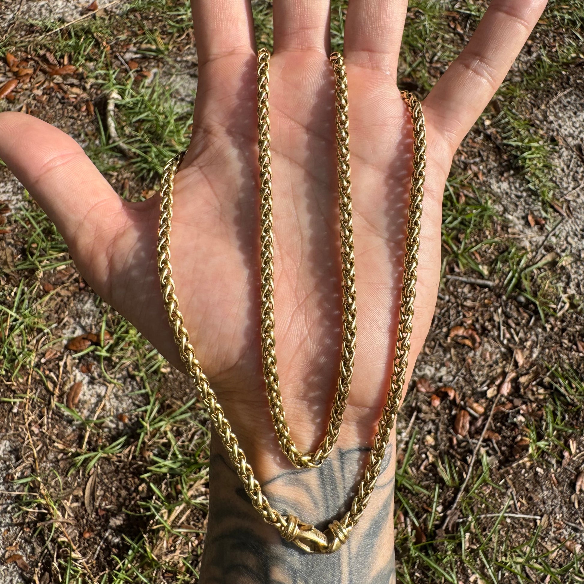 In excellent condition at less than half the retail price of $9400 is one of the most coveted brands and necklaces out of the entire David Yurman catalog, the “Wheat Link Necklace”. Measuring 26” in wearable length and 4mm thick in circumference weighing in at a hefty 29.6g. Crafted out of a vibrant 18k yellow gold with oversized, strong, and secure terminal ends and lobster clasp. The wheat link allows for extreme maneuverability as it can twist and ball up into any shape therefore giving off flexibility with all movements and not “kinking” with extreme everyday activities or wear. Meant to be worn not just solo but in a stack with other necklaces or with pendants attached, this is a beautiful versatile necklace for anybody looking for any style. The DY brand is just the icing on the cake to an already fabulous chain.