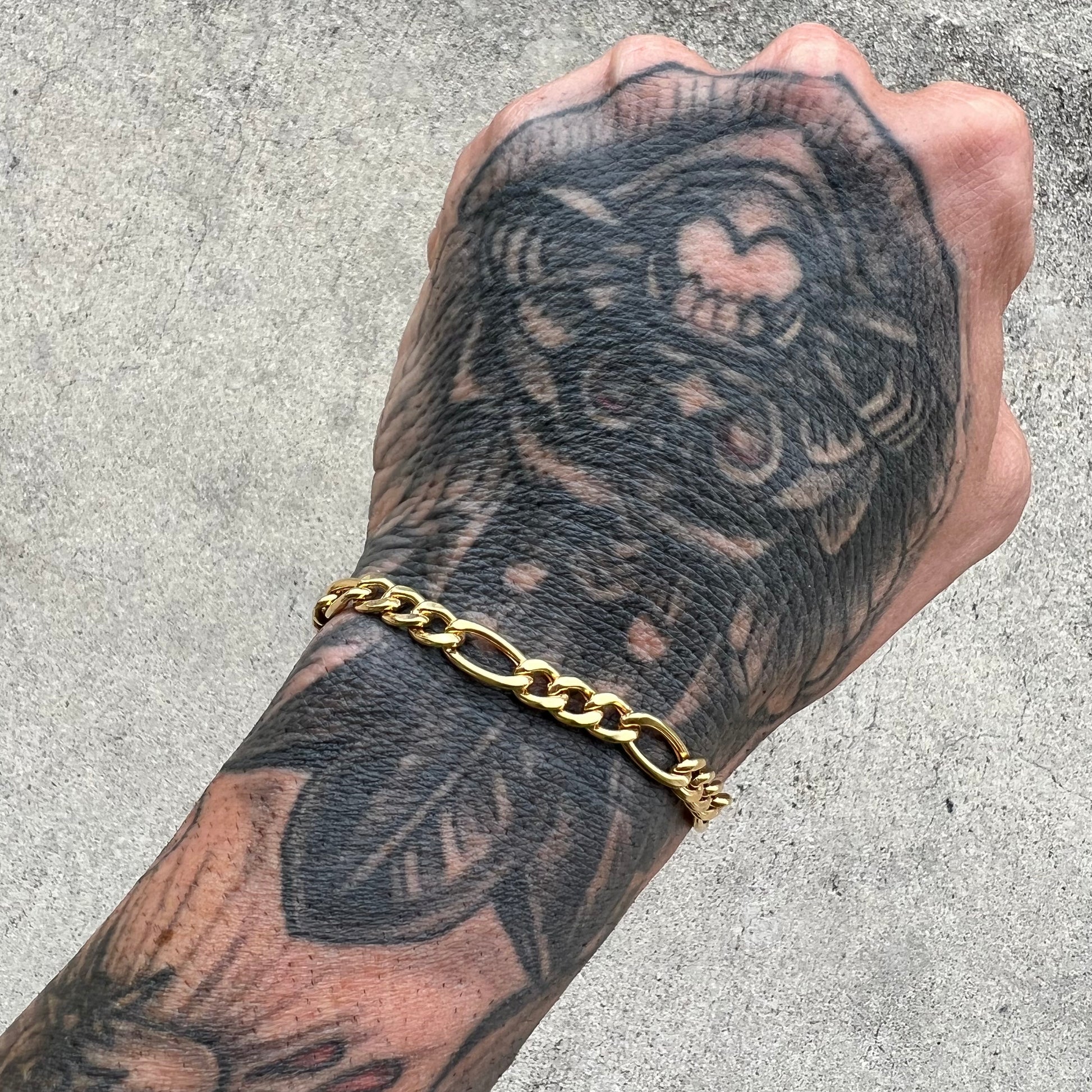 Crafted out of deep golden yellow 18k gold in Arezzo, Italy is this immaculate classic Figaro link bracelet. Measuring 8.25” by 6.25mm and just over 9g this is a textbook definition of a beautiful Italian made piece of jewelry.