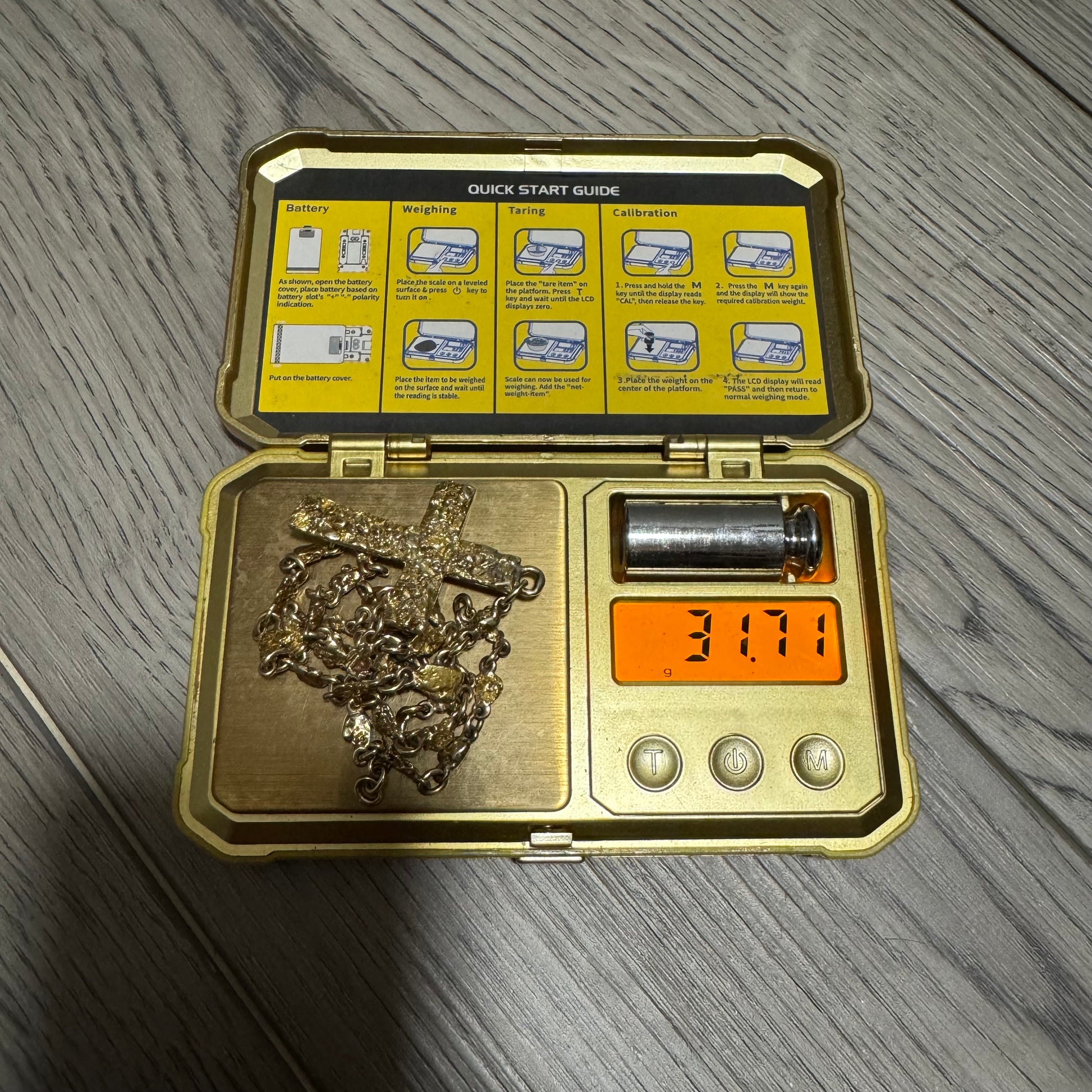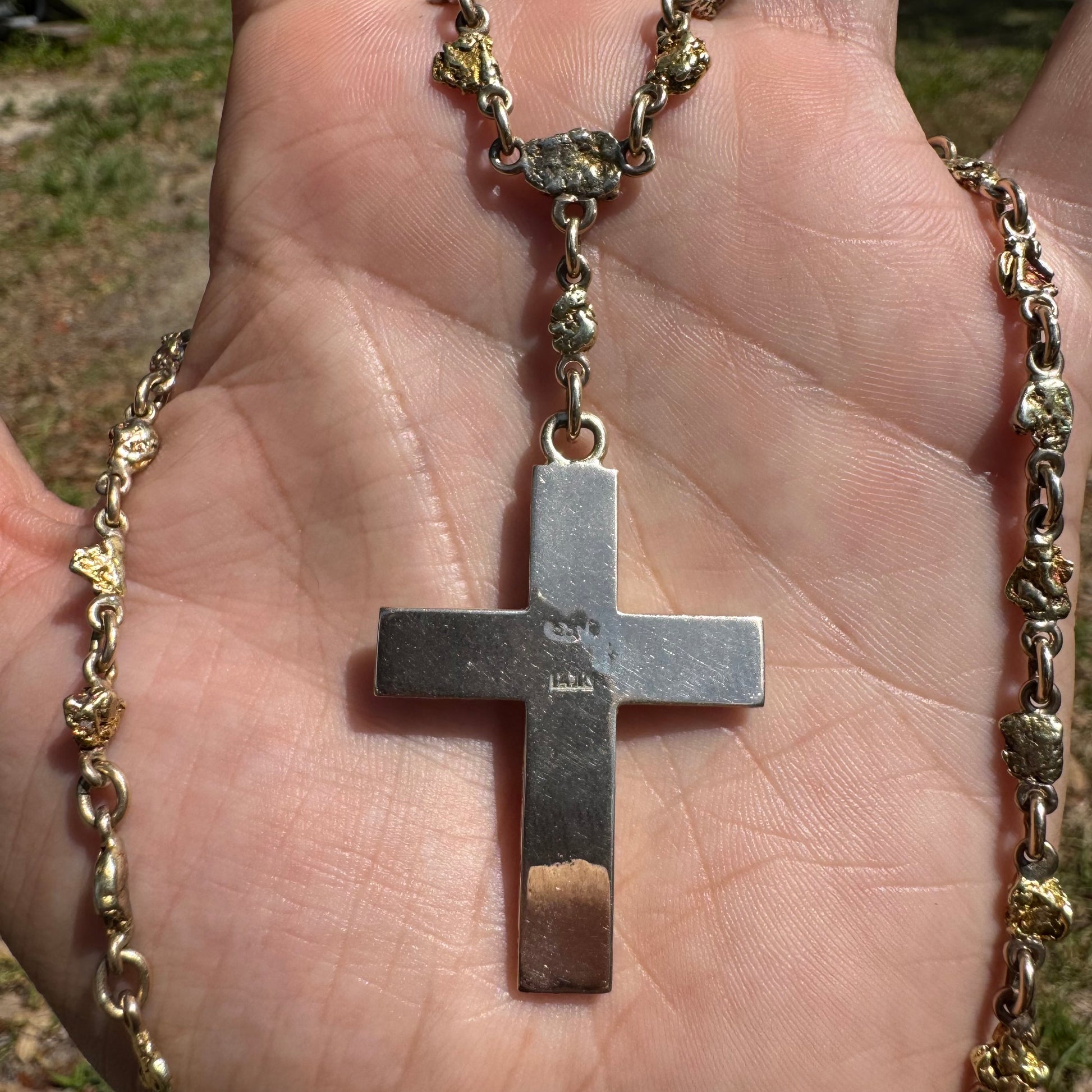 A true piece of history, this is not only a rare and astounding piece of jewelry but an antique artifact of the past. During the middle to late 1890’s the second North American gold rush was in full effect yet this time further north of California and into the Yukon Klondike region of Canada and Alaska. These raw gold nuggets are formed over millions of years by hot temperatures, hydro thermal fluids, and the pressure of the earths core releasing through cracks into the earths crust. Natural weather phenomenon then deposits these nuggets up and into rivers and streams which then knock loose, shape, and erode over time. Unlike gold from quartz vein deposits, these deep seated placer deposits are far less common. Hundreds of thousands headed north in the harsh environment to strike it rich yet very few came back with anything. Those who did were sure to flaunt it and they did that in many ways with the jewelry they had made with their findings. This chain is a true representation of the beliefs and wealth amongst that time. The 16.5” necklace portion of the chain uses 31 raw nuggets all similar in size and tone attached to one another by 14k yellow gold handcrafted and soldered circular links at 4mm wide with a large spring ring clasp on the end as the center of the chain has a 2.5” drop including the large cross centerpiece. As you see the cross was crafted by hand out of 14k yellow gold and then embedded and thickly encrusted over the top with raw natural nuggets. As you see in pictures #10-12 the nuggets throughout the entire piece themselves test out anywhere from around 16k-21k in the multiple spots that were tested. This is indicative of the natural gold alloy content of raw Klondike nuggets. At a chunky and heavyweight of 31.71g this is not only a conversation starting piece of jewelry but an investment monetarily and socially. Museum quality pieces like this are not making it out for sale on the open public often and if they do they are fetching huge premiums. This is one I can honestly say I do not mind one bit if it never sells and I end up keeping forever, especially at this low price point I’m selling it for.