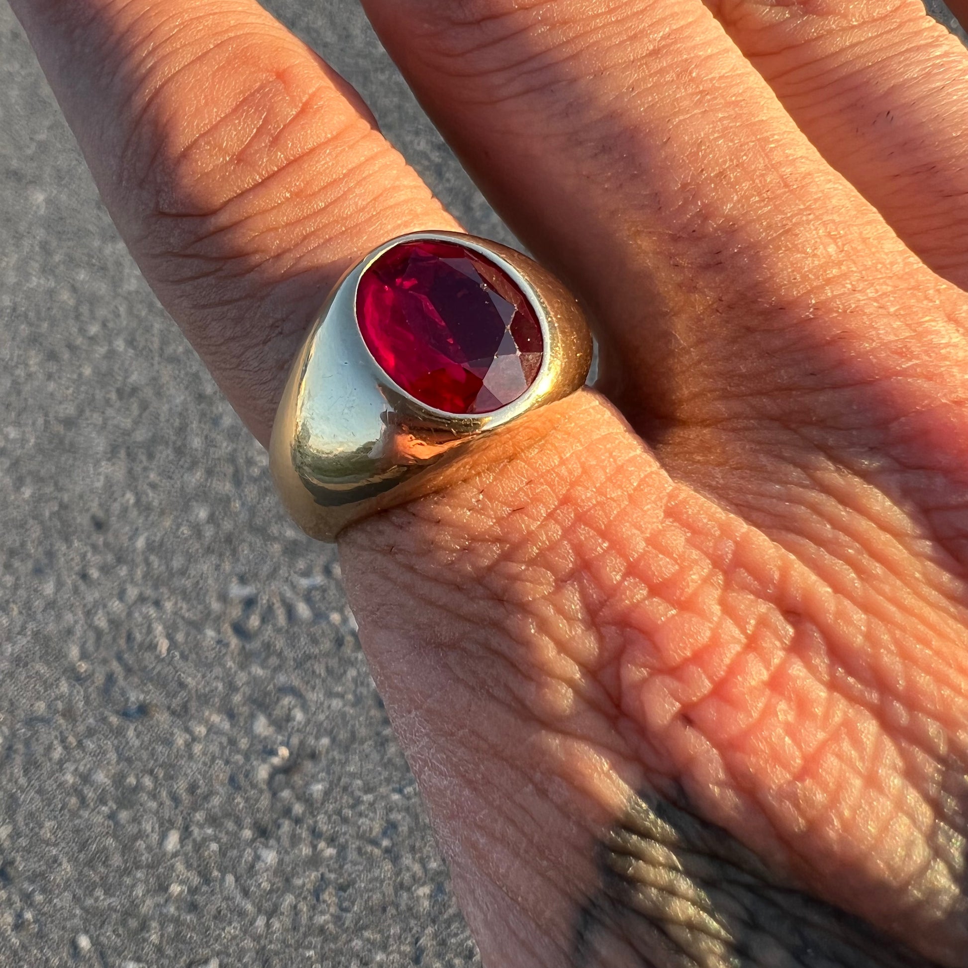 Beautifully cut large red spinel stone set inside a heavy solid backed comfort fit 10k yellow gold ring. This is a real mafia Don style ring whether for your pinky or on a larger finger like your index, middle, or ring finger. You can’t go wrong either way you pull it off. Size:9
