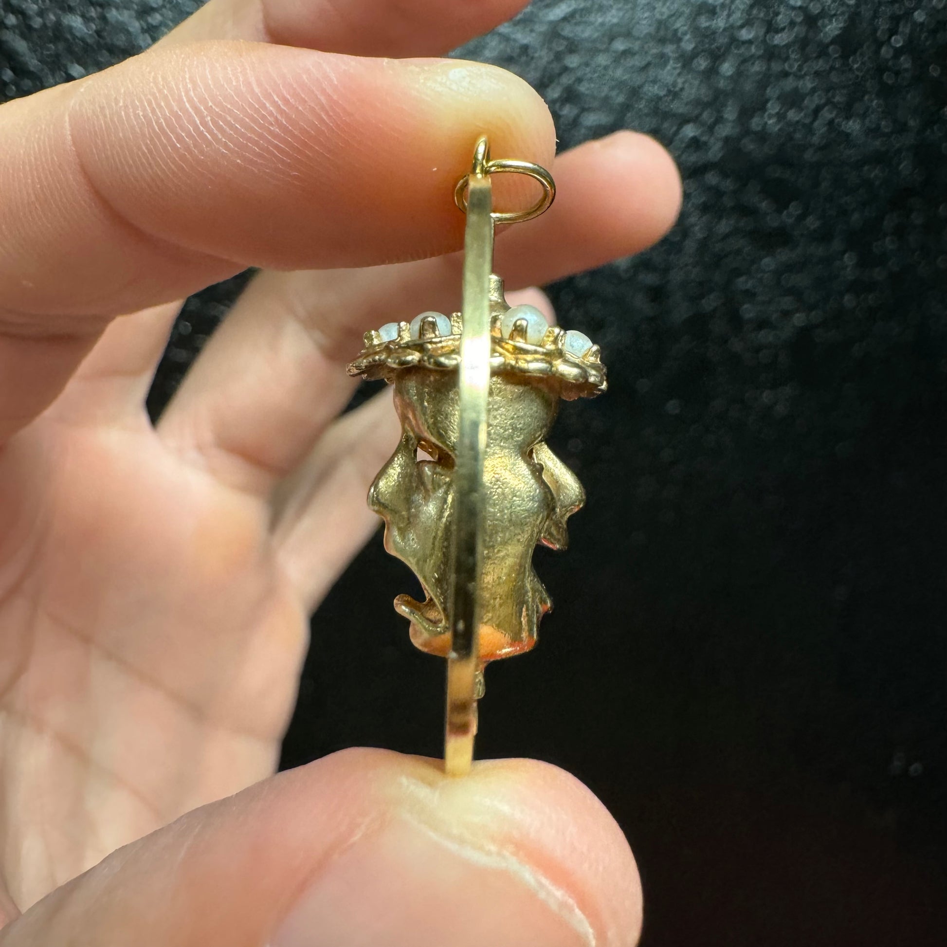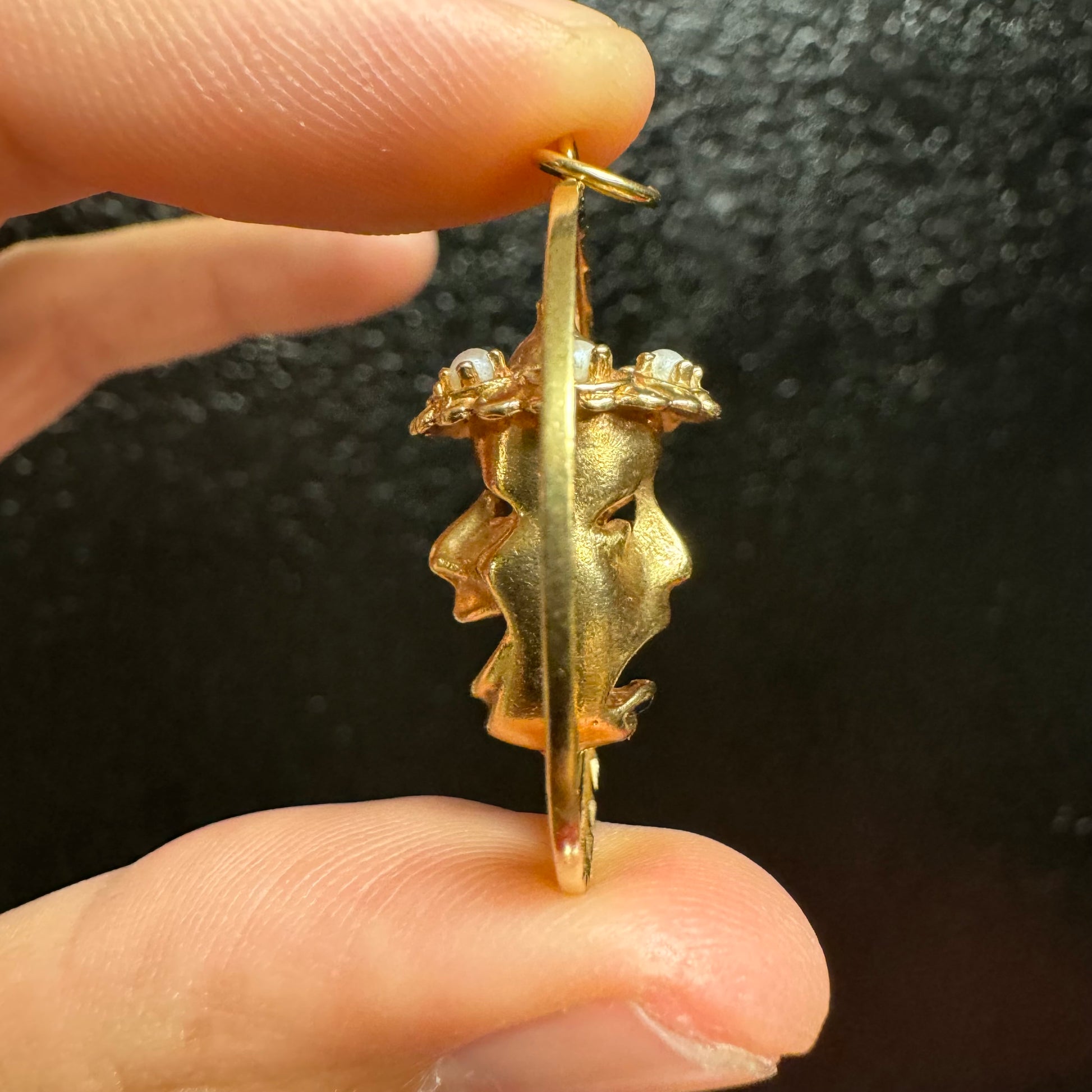The epitome of old school this circa 1950’s solid 14k yellow gold prong set seed pearl “Laugh Now Cry Later” pendant is fully actuating. Spinning a full 360 degrees you can set the happy face to the front or the sad face out to the front for whatever representation of self you want to put out to the world that day. Based on the comedy and tragedy masks of theater from Greek mythology this one is relatively large weighing 8.1g and measuring 1.5” by 1.25” with a bail opening is approximately 4mm. If you want a piece nobody else will have this is definitely the one.