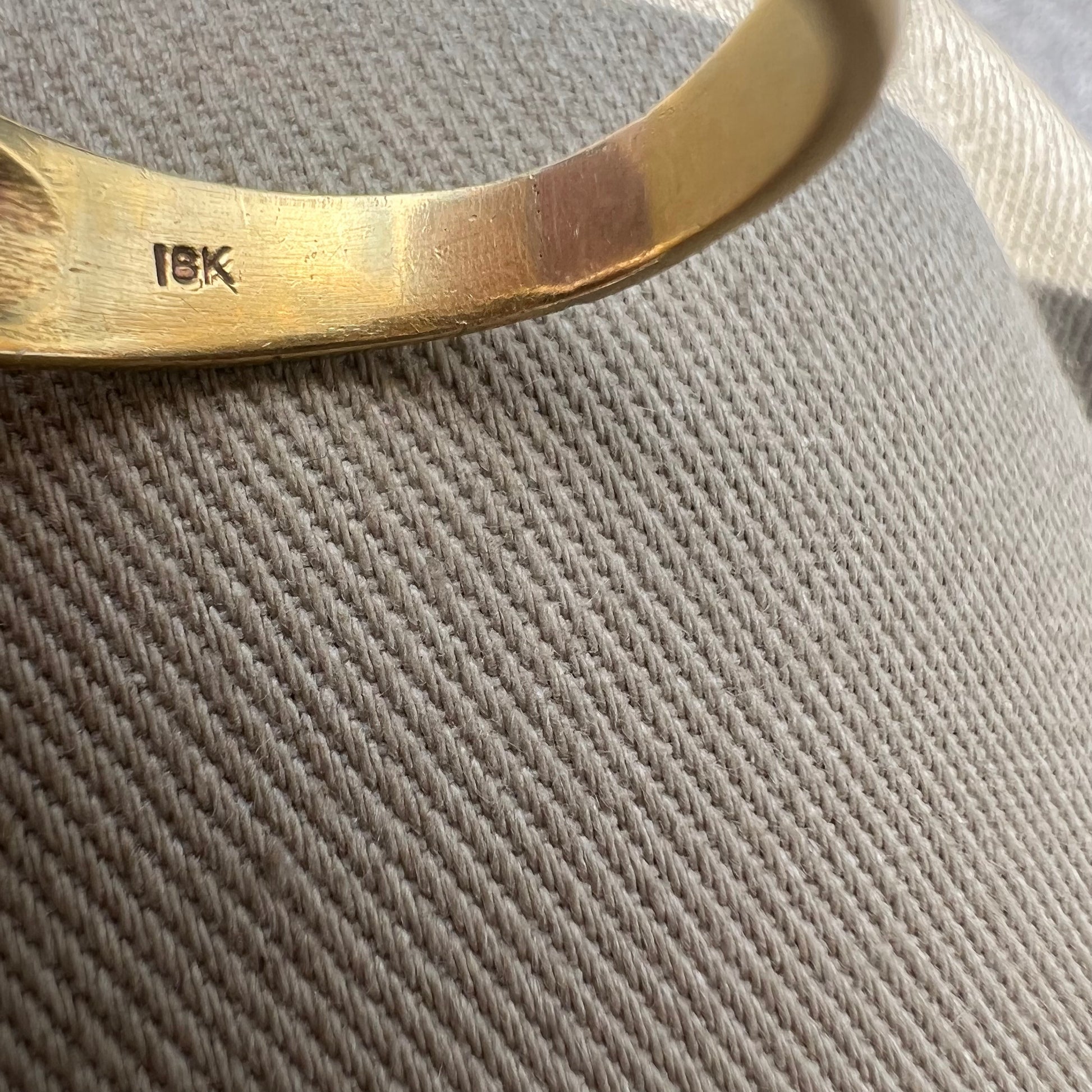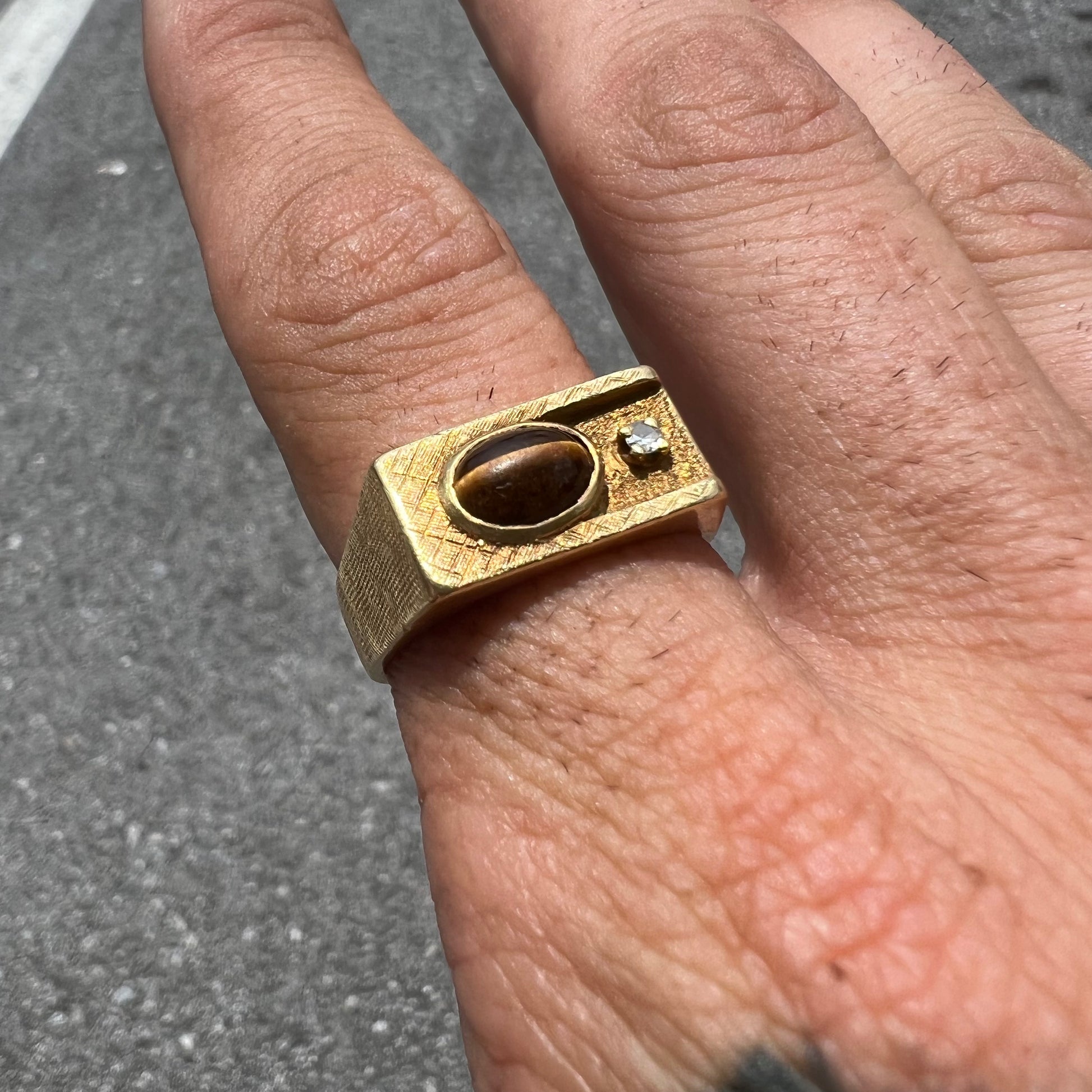 Old school style with a dark golden yellow 18k gold half of the ring has a Florentine finish, which was very popular in the middle half of the 20th century, followed by a flat high polish on the bottom shank of the ring. Sitting on top is a beautiful tigers eye stone and natural Diamond solitaire. Size:10.75 weighing in at 10.1g