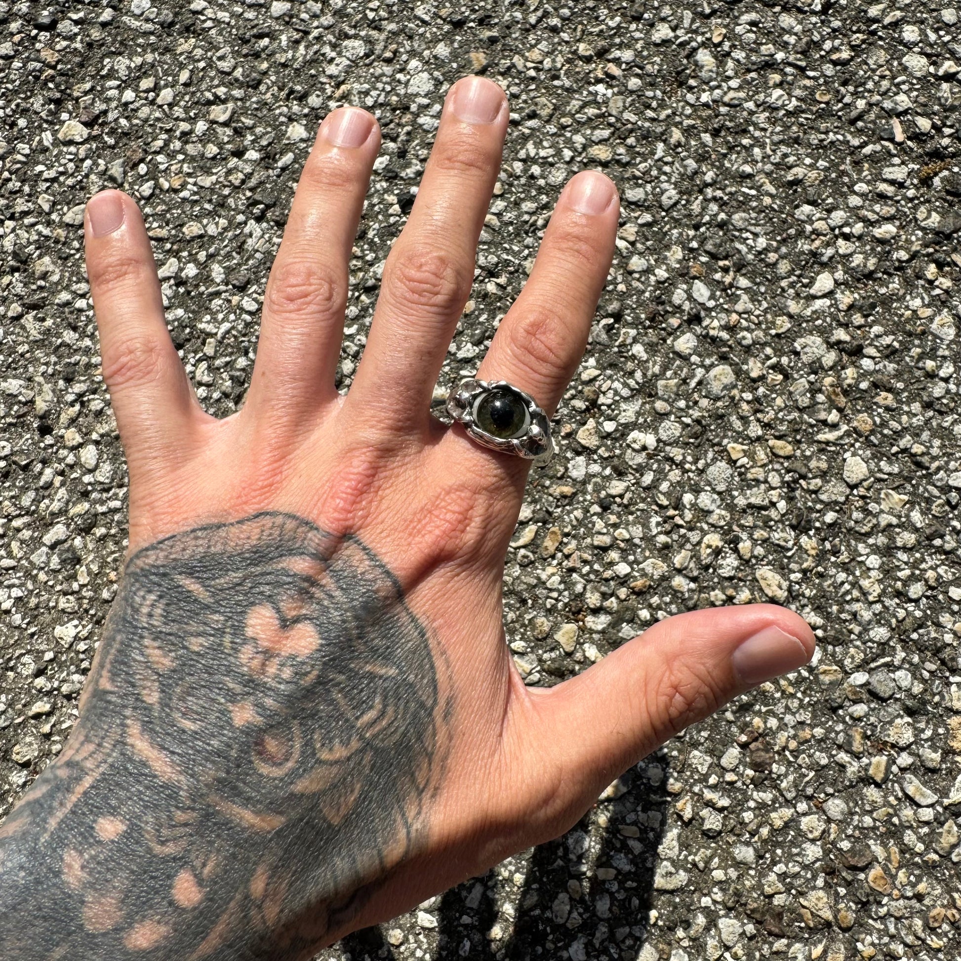 Today most ocularists manufacture prosthetic eyes out of medical grade acrylic plastic but before the onset of WW2 in the beginning of the 1940’s this process was made using glass. Early glass has small abrasions, impurities, and most importantly tiny air bubbles. If you look closely (pictures #11 & 12) you can see these small air bubbles in the glass eye as well as the tiny red veins in which they used red cotton strands for the life like appearance. During the Victorian to art nouveau period (mid 1800’s-1920’s) mourning jewelry was a very common practice. Wearing jewelry with your loved ones hair or teeth was something many did to remember their loved ones and the prosthetic eye jewelry was a rare but small part of this sentiment. All handmade and cast in .925 Sterling silver with fine detail this ring is extremely rare. Very heavy, solid backed with a comfort fit, and broad shoulders featuring double naked cherubs flanking down the whole side shanks of the ring at a size:11 weighing 14g I’ve never see a true prosthetic eye ring this good and I’ve had quite a few myself even though they are extremely rare to find.