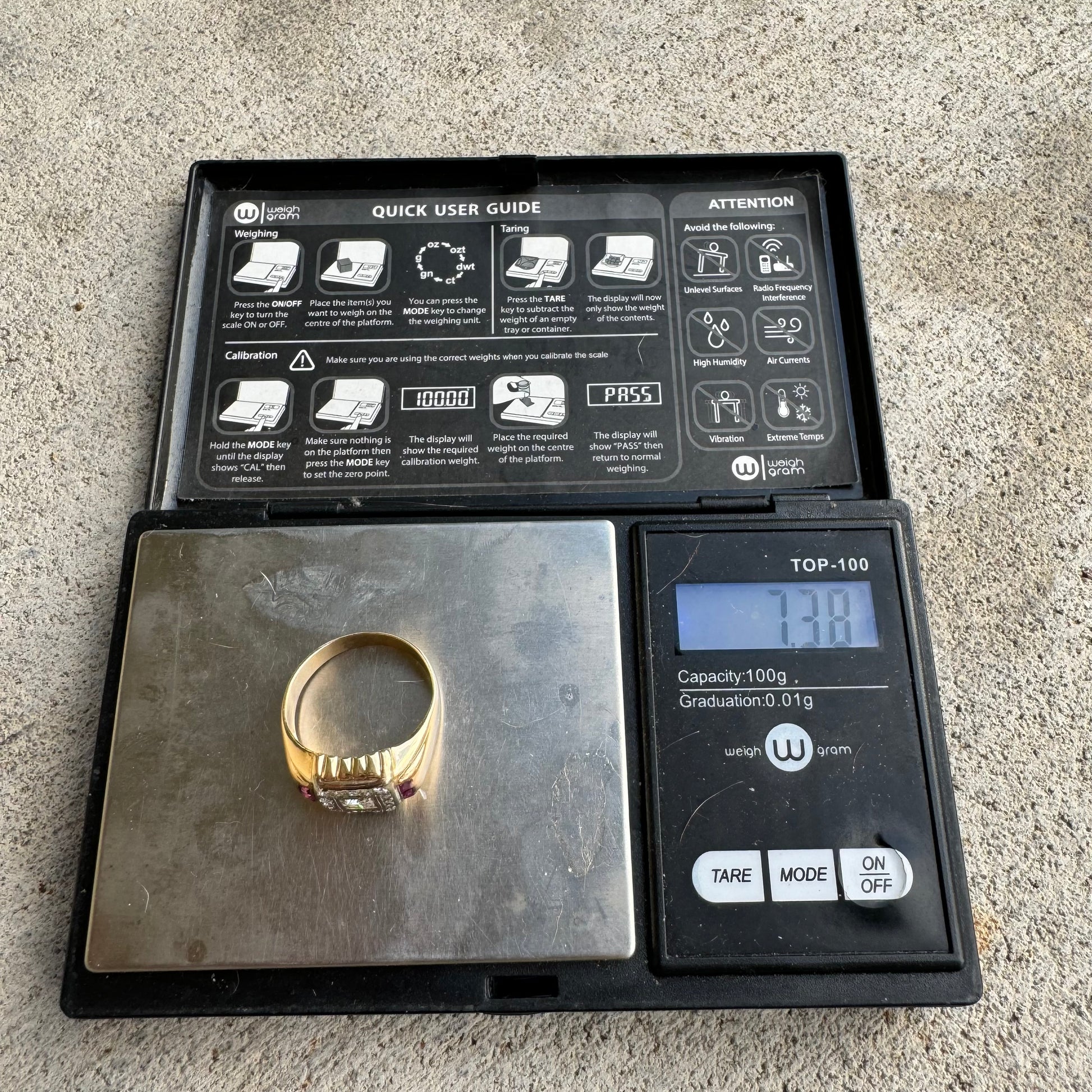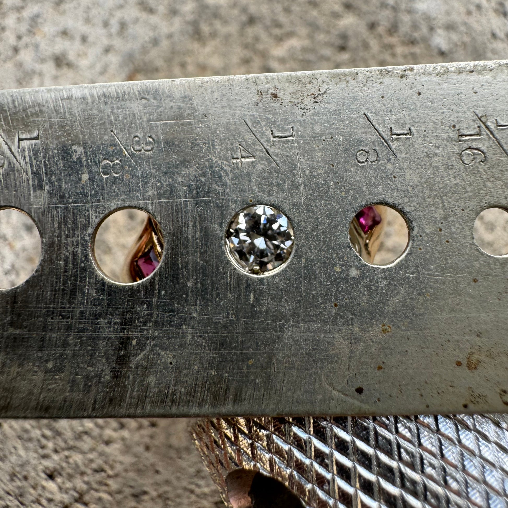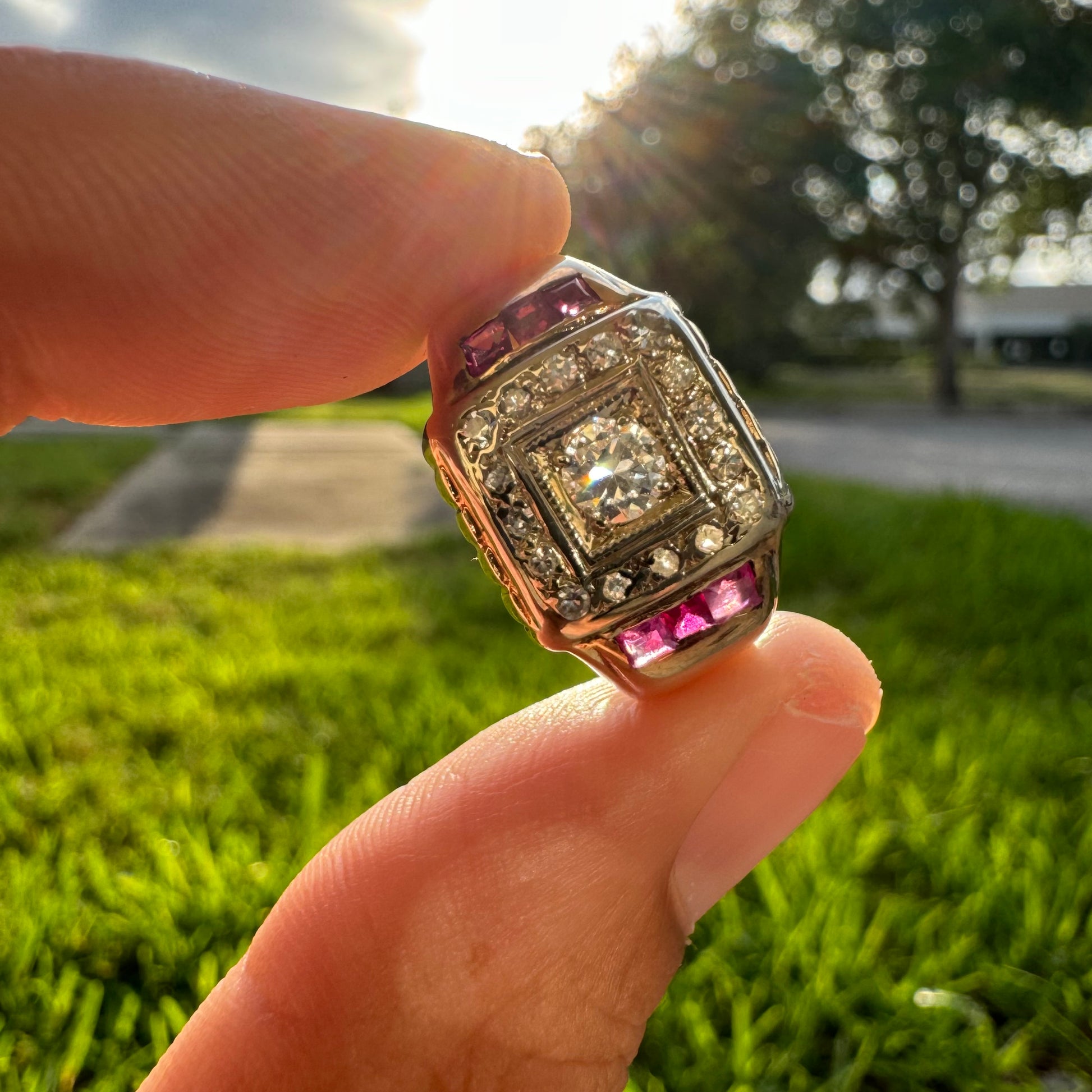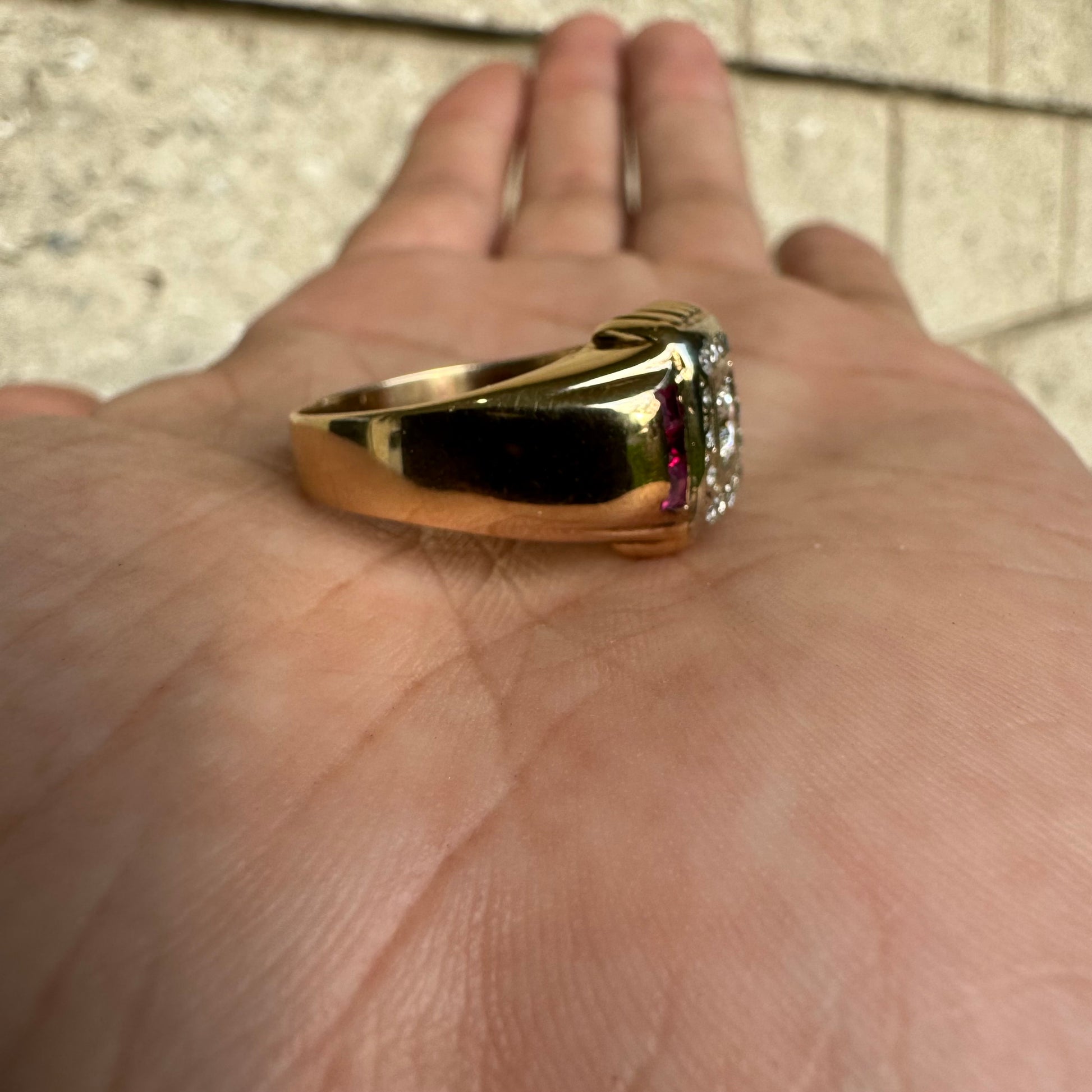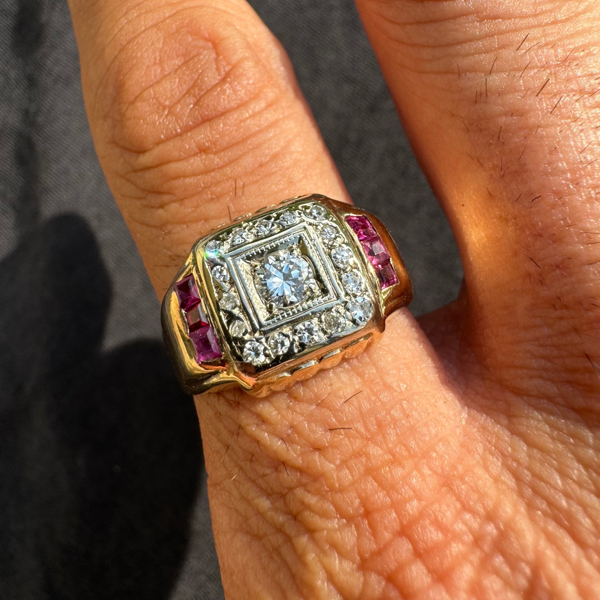 Being worn by an old school mafia don with class and luxury this near flawless VS quality and colorless natural .25ct round brilliant cut diamond blasted right into the center of this absolutely perfect 14k yellow gold natural diamond cluster and princess cut ruby gents ring. With exact attention to detail I can’t believe how great of condition this ring is still in after approximately 75 years. A beautiful mirror finish throughout and super clean the ring is a size:10.5 and weighs in at 7.38g feeling so freeing on the finger it’s extremely comfortable as if you hardly know it’s on. Though the pictures are still great when you have and see this in person it’s a world apart from how intense these colors hit you.