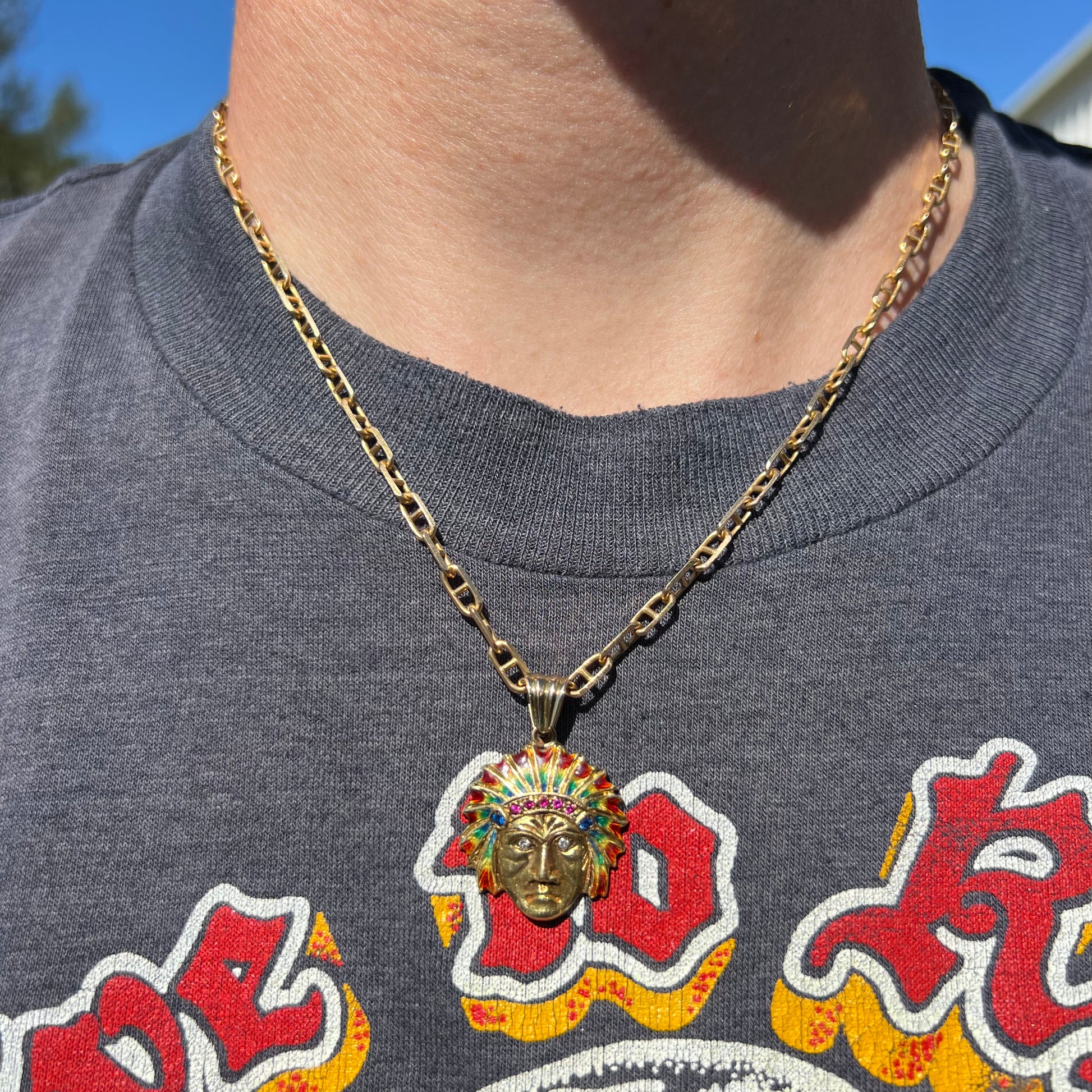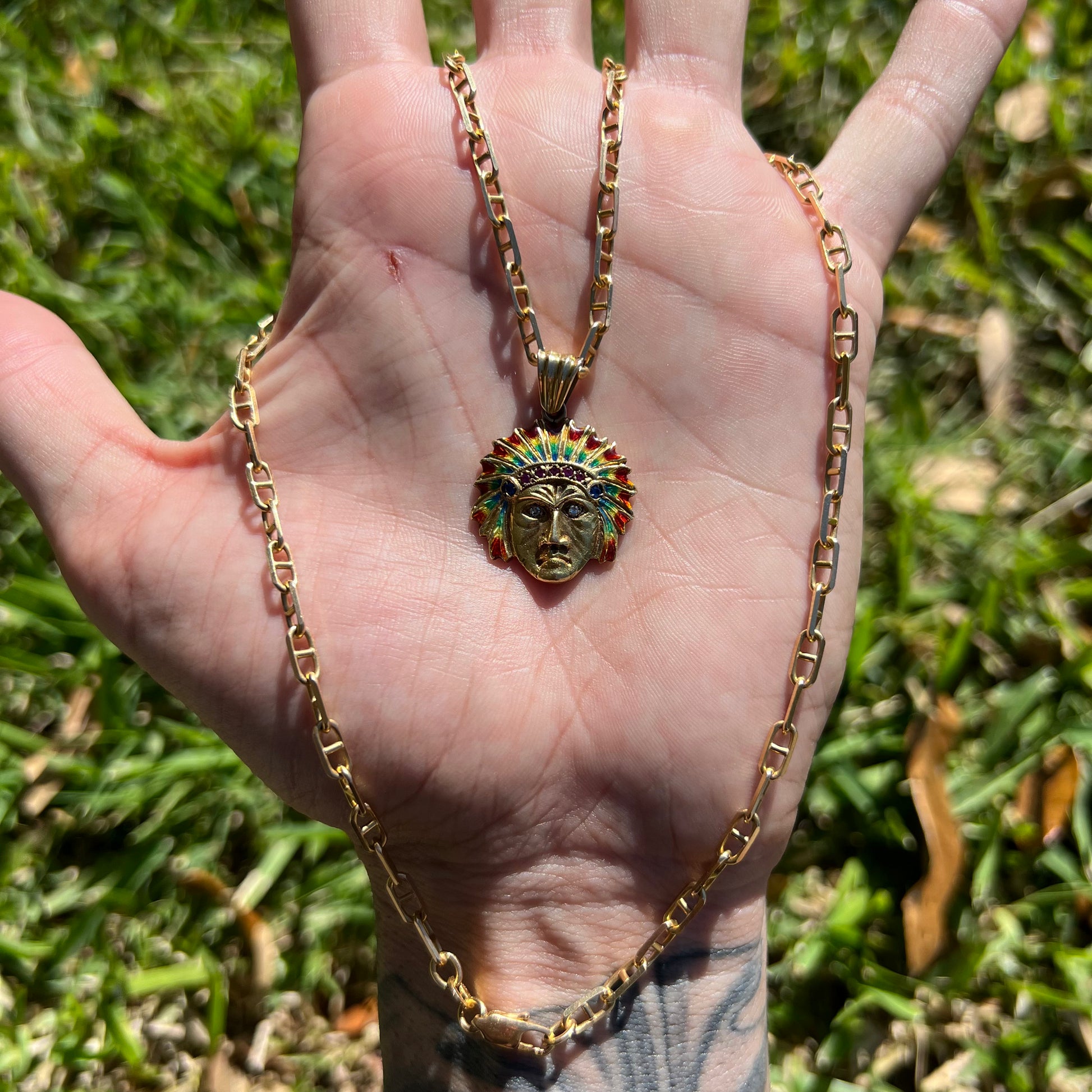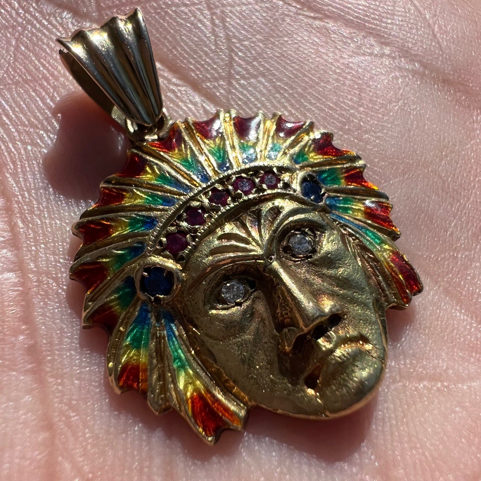 Extremely rare solid 18k yellow gold Native American war chief pendant. This piece was hand crafted probably sometime around the 1930’s-1950’s all fire enameled with natural diamonds, rubies, and blue sapphires. Weighing a bit under 8.2g this is a conversation starter and attracts beauty anyway you look at it. A true piece of art that should be passed down in the family for generations. This is a pendant that when you wear it your grandkids will say “I remember my grandpa wearing this. I always wanted it.” *Necklace Shown NOT Included*