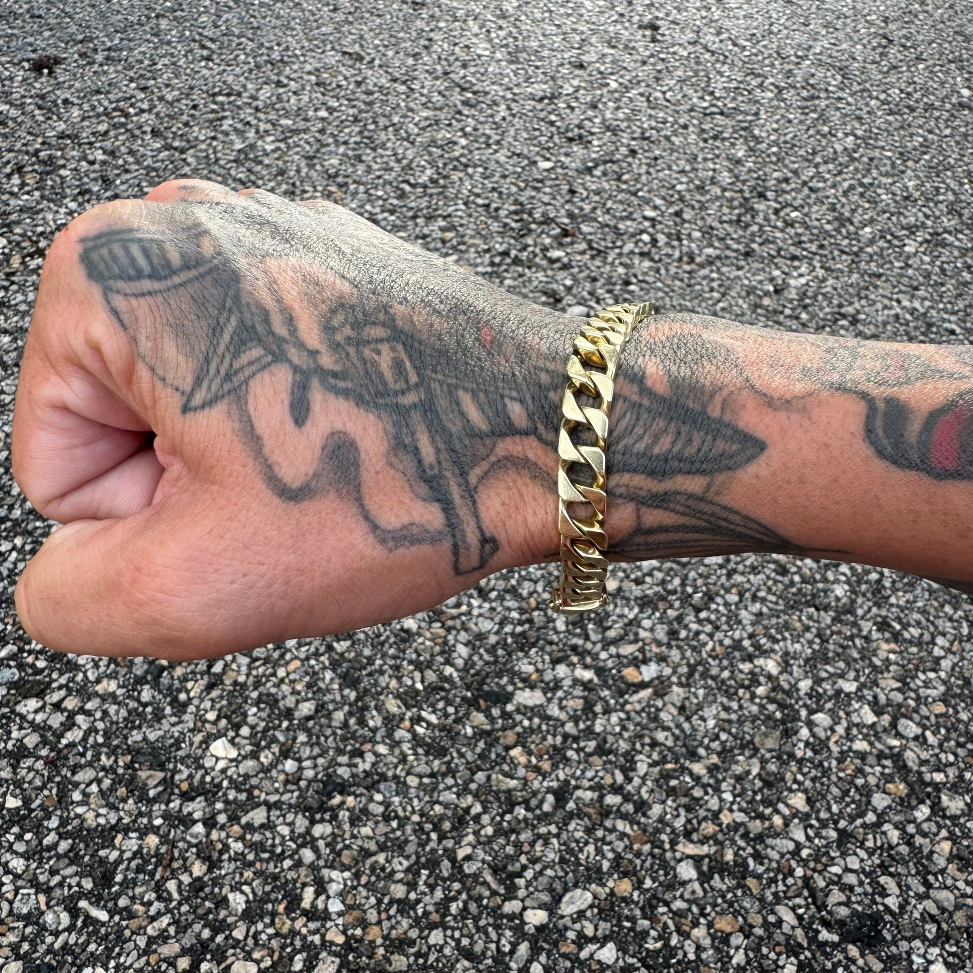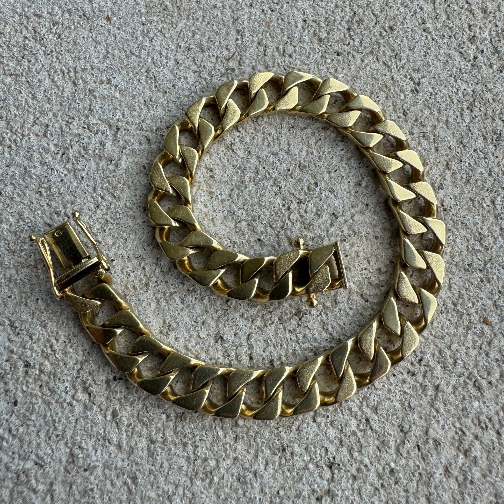 Pure butter, this solid 14k yellow gold is saturated with glowing yellow unlike most gold you’re use to seeing. Vibrant tone and chunky this old school style blocked Cuban curb link bracelet is heavy and packs quite a punch. At a wearable 7.75” in length with a wide circumference of 8mm x 3mm and weighing a heavy all solid 41.8g this piece is very comfortable to wear with a more blocky style of the links and thick side wall profile. Heavy duty ends and tight box lock clasp with double latching figure 8 style side latches this bracelet will stay on your wrist despite having to thrash around on a daily basis. This is a lifelong piece that will stand the test of time as it continues to grow exponentially in value.