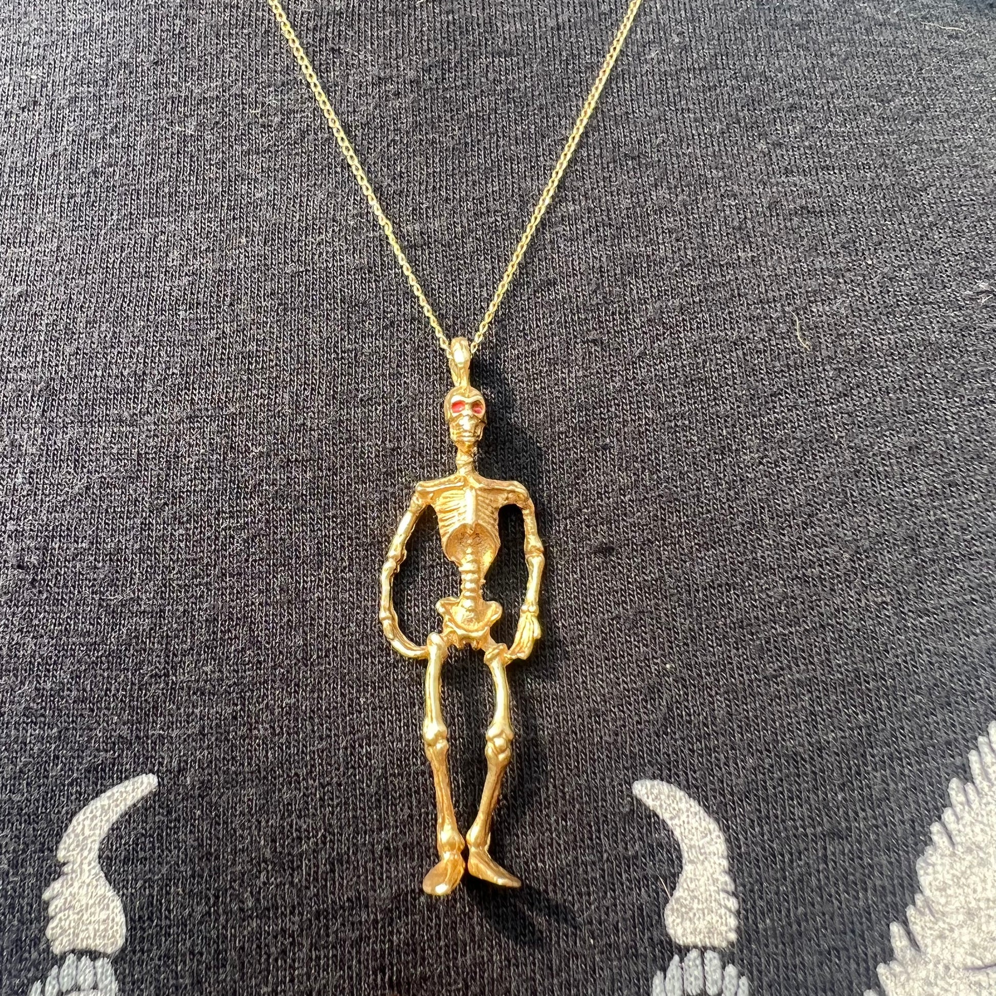 Custom made by an old school biker named Tal. This fully solid 14k skeleton plus many other solid gold figurines adorned his leather vest. His wife told me this skeleton plus another fully articulating skeleton (that I also own) would hang off of a gold and Diamond encrusted safety pin. Keep this man’s legacy alive. RIP Tal