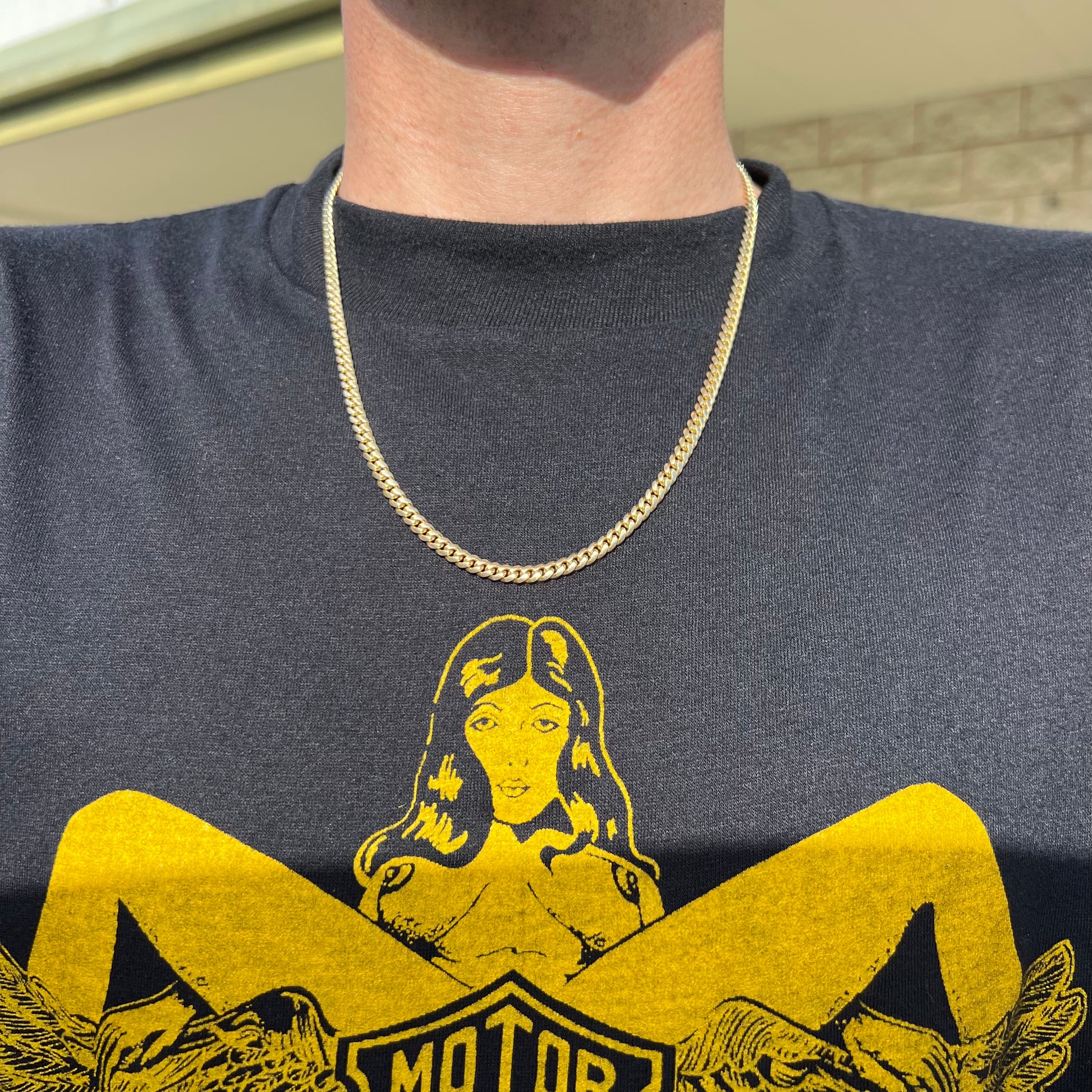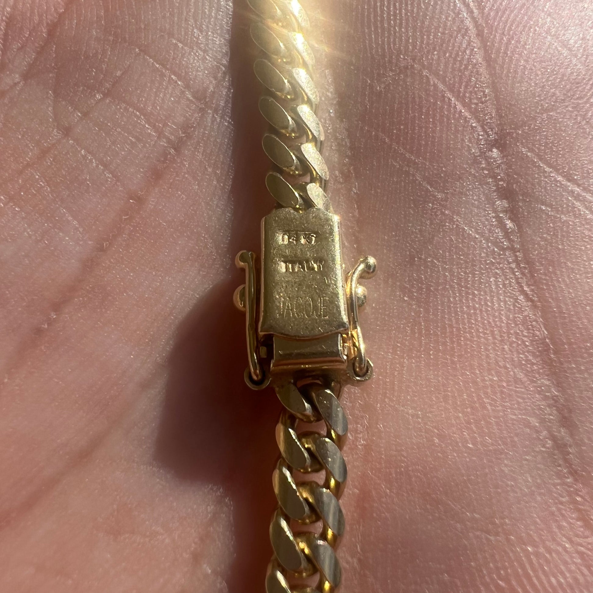 Perfect in every single aspect from the color tone to the weight to the size. Not to heavy or big or light and puny. This one packs a good punch in solid 14k Italian yellow gold measuring approximately 20” in length by 4.5MM in width by 2MM thick with a heft weight of 33.6g featuring a strong double latching box lock. This chain will take a beating and be hard to get yanked off your neck. A little bit of money goes a long way and this one will last a life time.