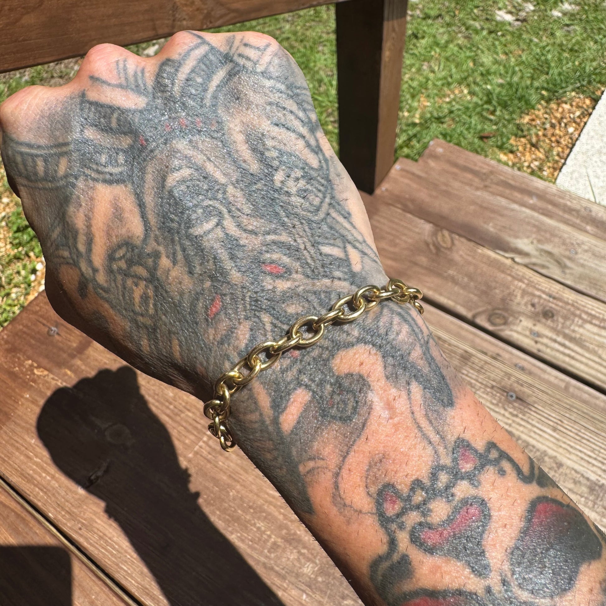 The best price you will find anywhere online for an authentic Tiffany & Co. solid 18k yellow gold oval cable link heart tag bracelet. 7.75” in total wearable length it can also be clasped into any other shorter cable link in order to fit if you have a smaller size wrist. Fully solid and heavyweight at a whopping 27.1g and 7mm wide this is a classic bracelet to have in the collection for any jewelery collector. With the designer name and the amount of high karat gold this is a piece that will continue to grow in value.