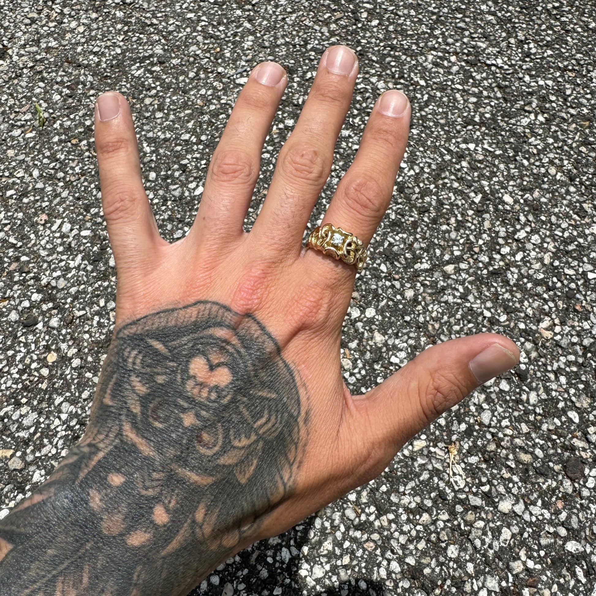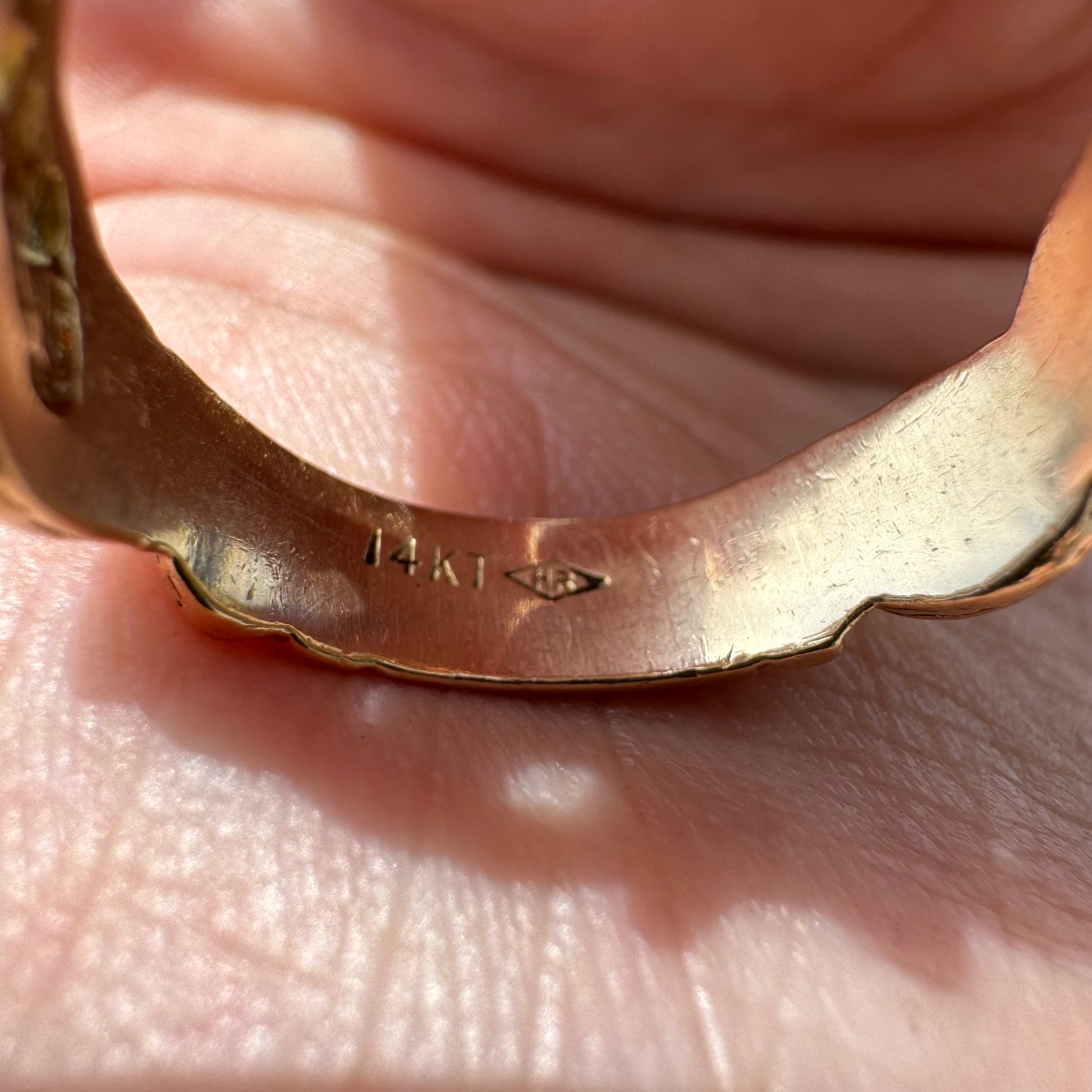 You don’t see pieces like this pop up on the market. Exceptionally cool and rare thick interwoven design casted out of solid 14k buttery yellow gold sometime around the mid-century by Heileman and Roth out of Cincinnati,Oh. Deep set into the ring but still with a comfortable and solid backing is a large and near perfect .25ct VS clarity natural diamond. If you inspect all the pictures you’ll see this piece just keeps getting better and better the more you look at it. Just shy of a size:10 it will fit a bit tight this one’s heavy and chunky at 10.37g and 11MM wide on the finger. A statement piece you’ll get asked about this one quite a bit.
