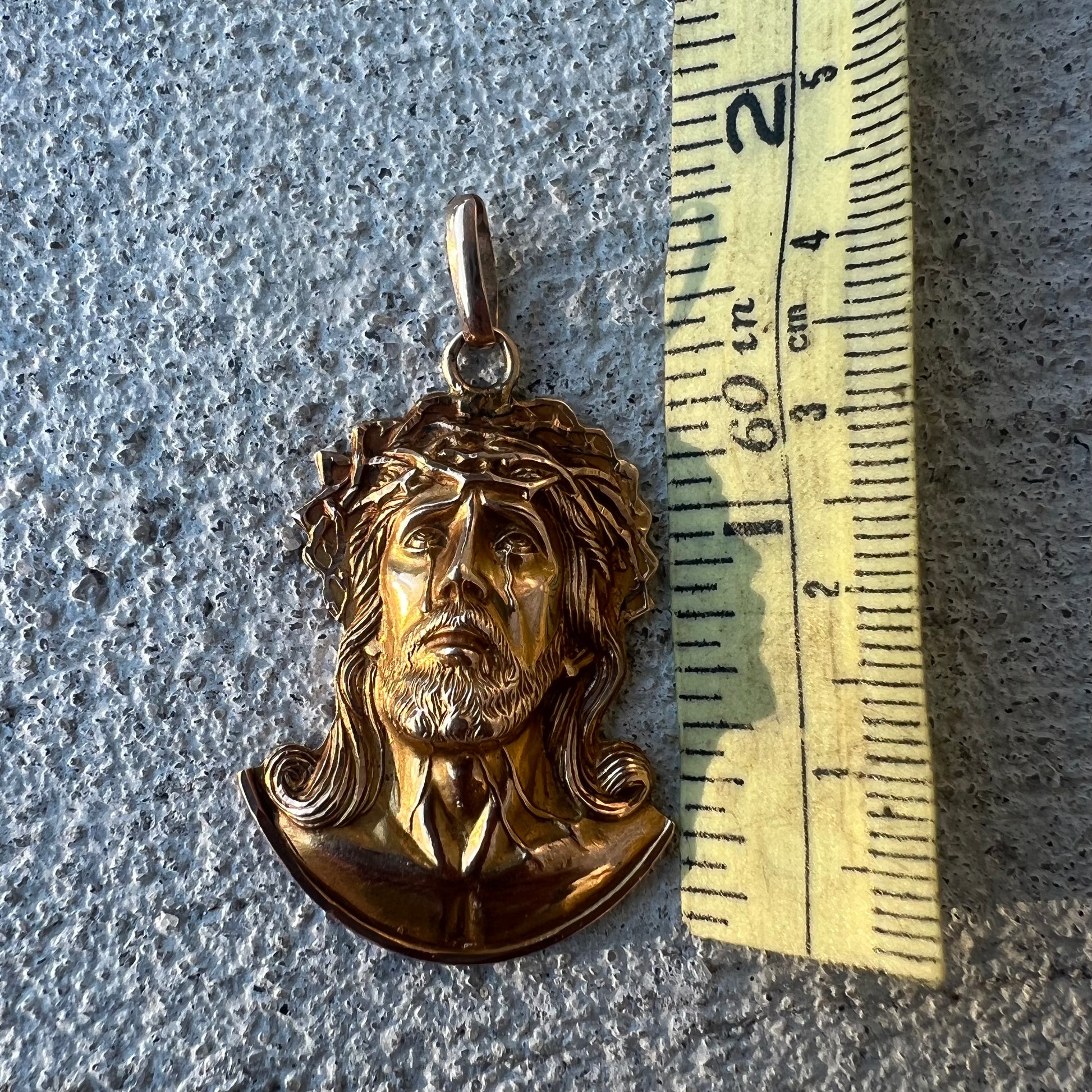 Featuring one of the most high relief depictions of the suffering crown of thorns weeping Jesus Christ I’ve ever seen. This mid size pendant produced out of 14k yellow gold from circa 1950’s is solid backed and measures approximately 1.75” tall with a bail that measures 6MM X 3mm and weighs just about 5g. All new Jesus pieces try to replicate this exact look and none come close.
