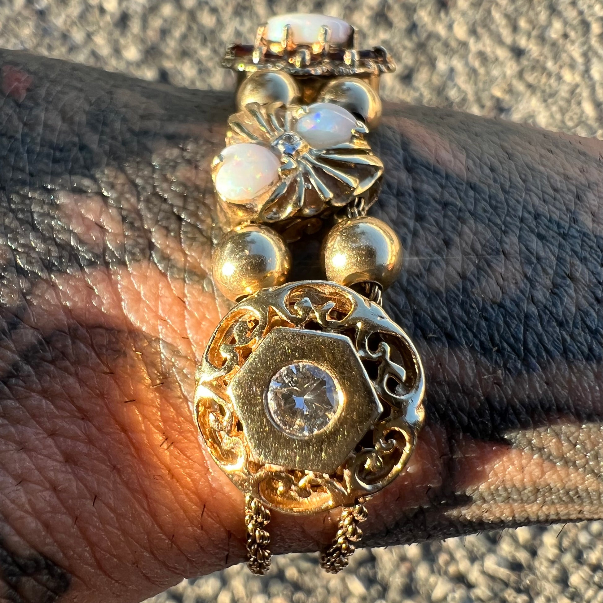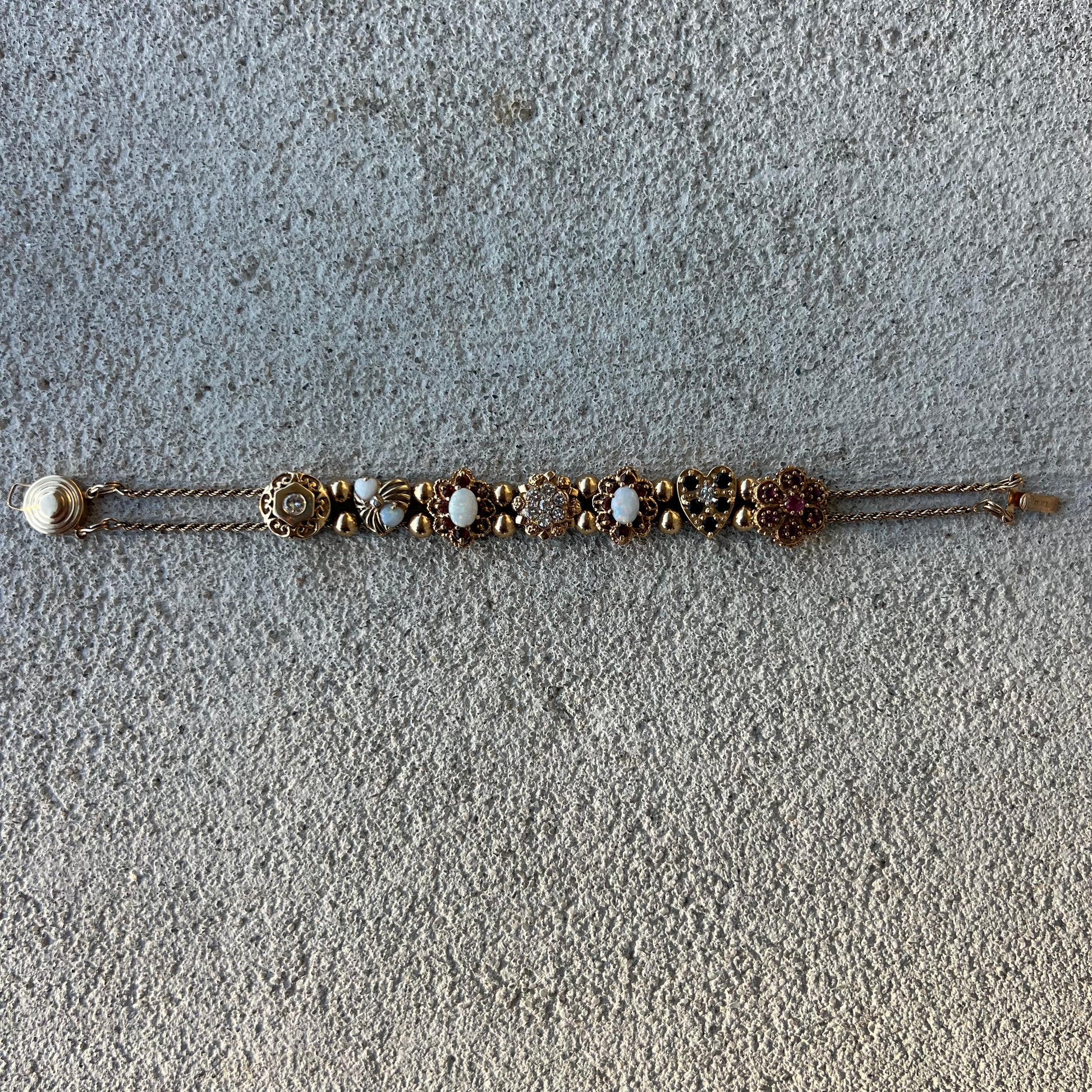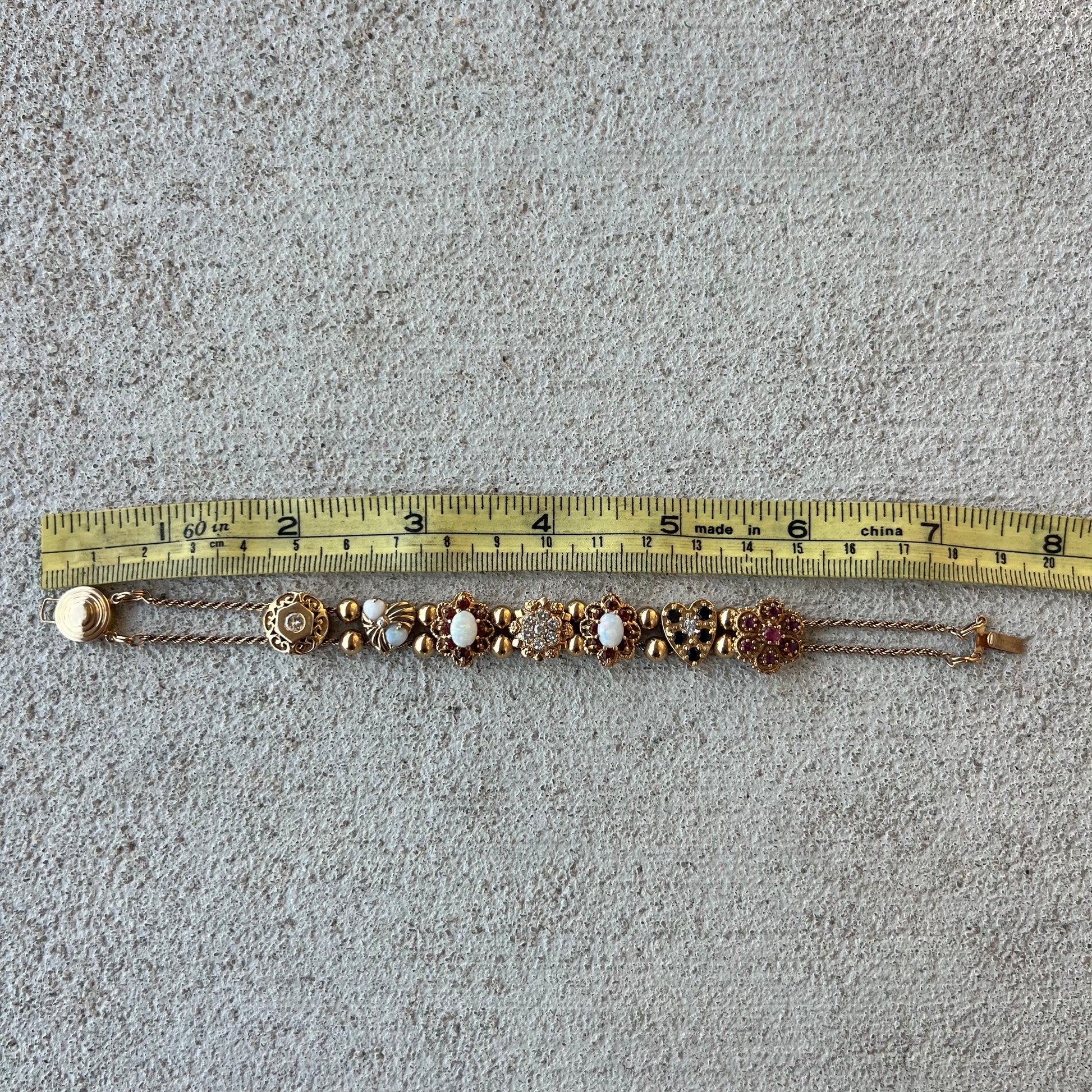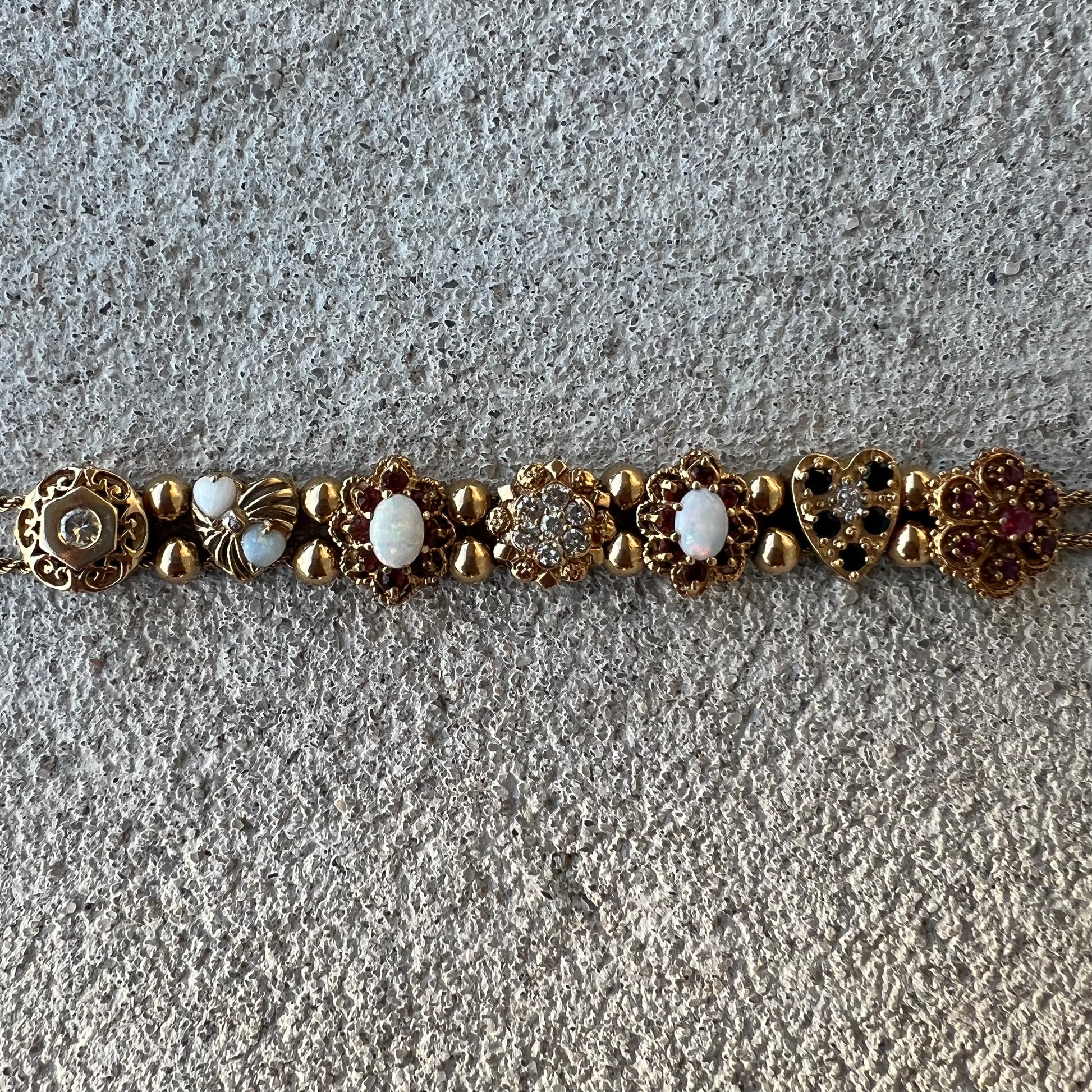 Coveted among jewelry connoisseur’s all around the world are these vintage slider bracelets by KLJCI. Just each slide on this bracelet sells for a minimum of $300 on the resale market with others selling for over $500. With a total of 7 yellow gold slides consisting of 14k and 10k natural multi precious stones. Diamonds, opals, sapphire, Ruby, and garnets a with yellow gold beads for spacing each slider from one another. Keep it as it is or collect and buy more slides to add to your bracelet making it your own. The bracelet it’s self is solid 14k yellow gold measuring 7.5” and each slide around 10-14mm while it weighing a total of 23.5g.